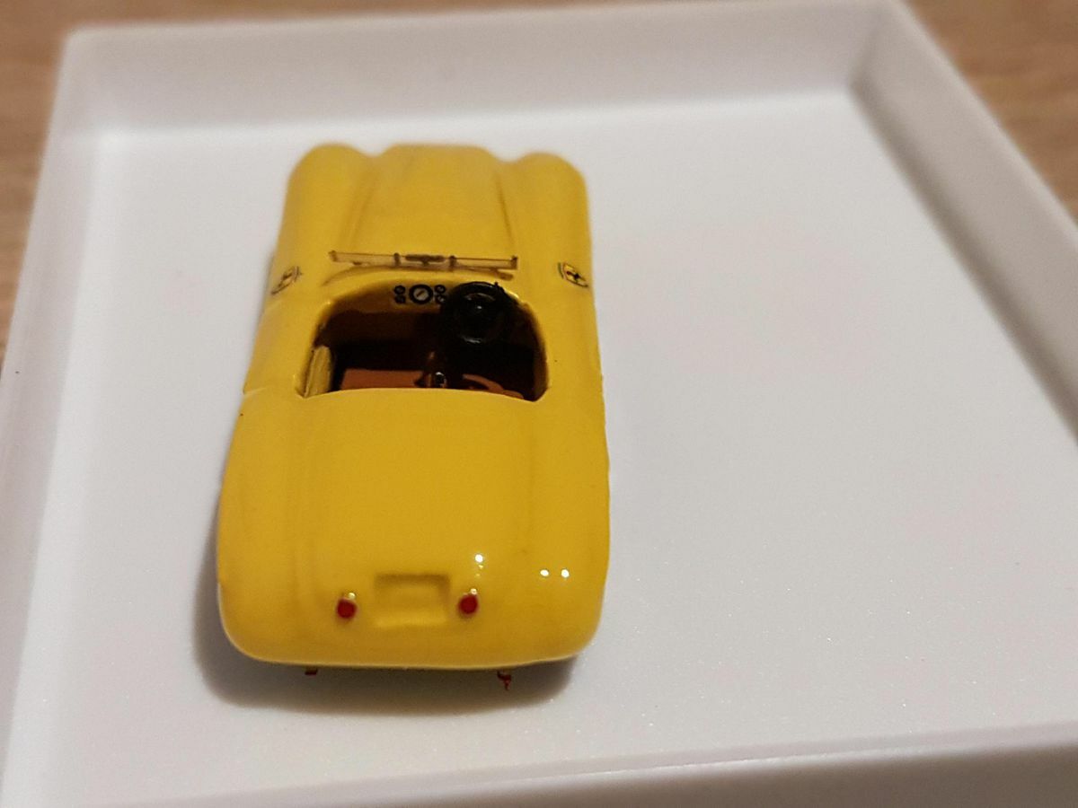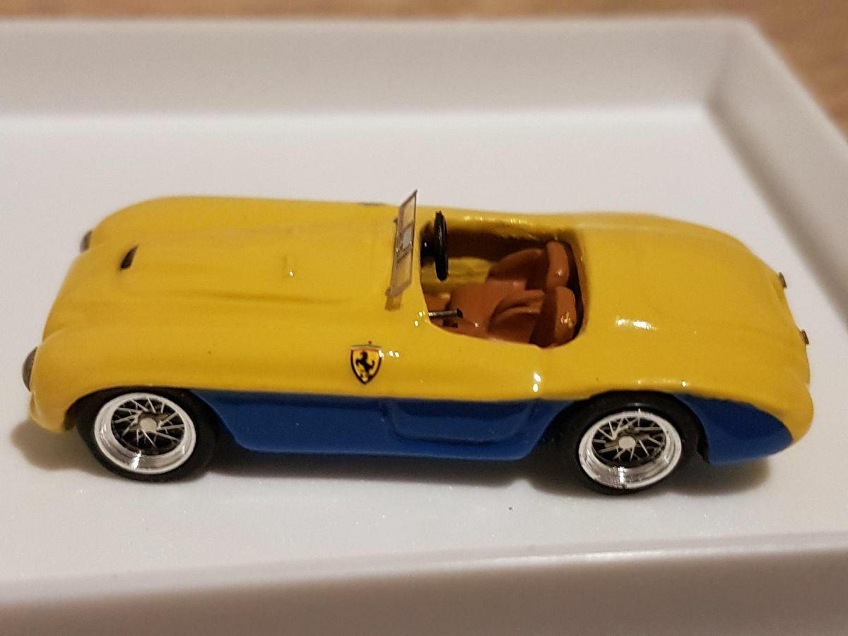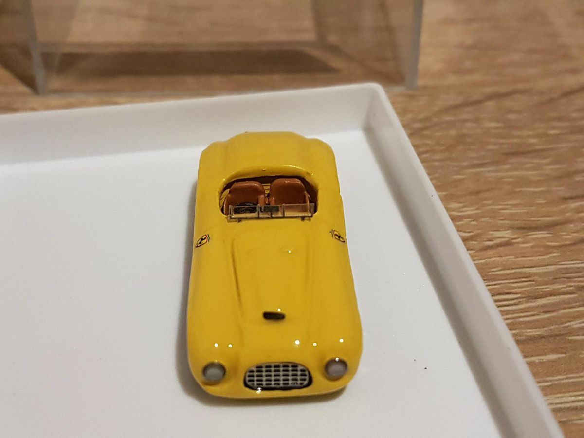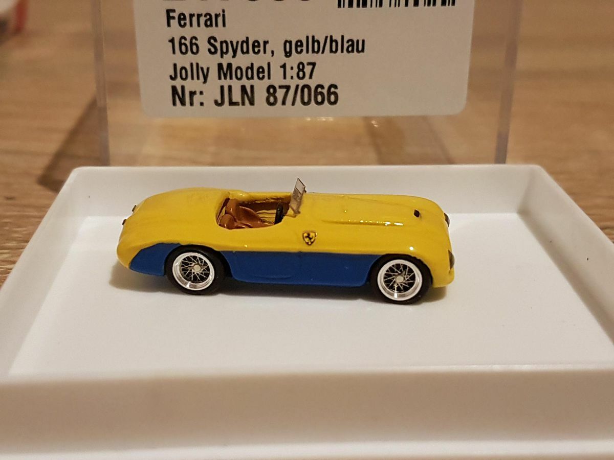 Das hier vorgestellte Modellauto im Maßstab 1:87 wurde von Jolly Model gefertigt und basiert auf dem berühmten Ferrari 166mm Spider. Es ist aus hochwertigem Resin hergestellt, was eine detaillierte und präzise Reproduktion des Originals ermöglicht. Dieses Modell, das Teil der Sammlung des Modelly-Mitgliedes "Ferrarisammler71" ist, besticht durch die hohe Detailtreue und die sorgfältige Handarbeit, mit der es gefertigt wurde. Die Lackierung des Modells ist in einem auffälligen Gelb-Blau gehalten und zeigt das klassische Ferrari-Emblem an den Seiten. Die Felgen sind filigran gestaltet und spiegeln die Drahtspeichen des Originals wider, was dem Modell eine authentische Optik verleiht.