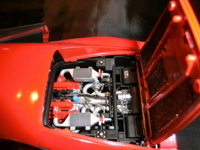 Der 288 GTO verfügt über einen Mittelmotor und ein Getriebe, das im Heck quer eingebaut ist. Der V8-Motor, ausgestattet mit IHI-Turboladern, erlaubt dem Wagen eine Beschleunigung von 0 auf 100 km/h in nur 4,9 Sekunden und eine Höchstgeschwindigkeit von über 300 km/h. Solch beeindruckende Leistungsdaten und die innovative Technik des 288 GTO machen ihn zu einem der beeindruckendsten Supersportwagen seiner Zeit. In der gezeigten Miniatur sind diese technischen Finessen durch aufklappbare Türen und zu öffnende Motorhauben sichtbar, was einen detaillierten Einblick in den Motorraum und das Cockpit ermöglicht. Details wie das Markenlogo auf der Front und den Seiten sowie die originalgetreue Lackierung in Rot tragen zur Authentizität bei. Diese besondere Lackierung mit glänzender Oberfläche und präzisen Linien imitiert die elegante und sportliche Anmutung des Originals.