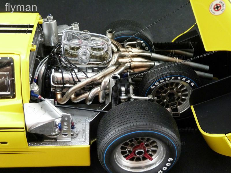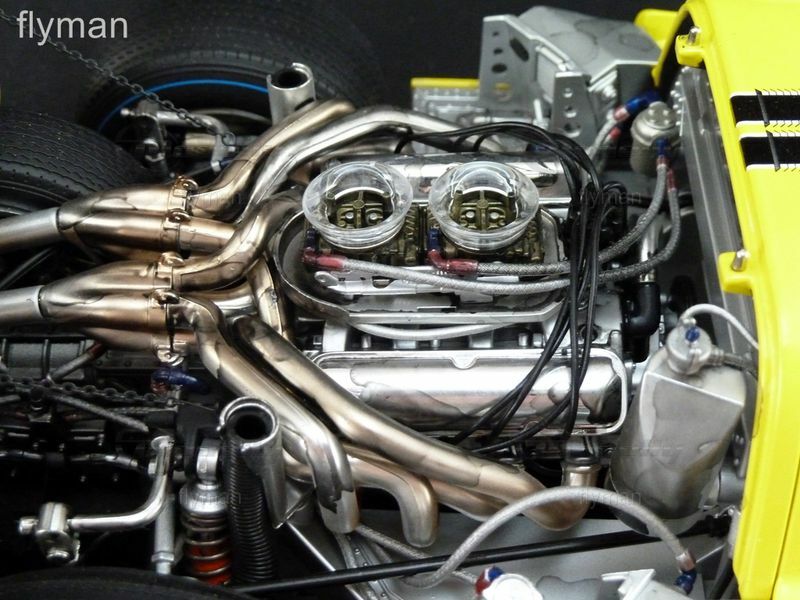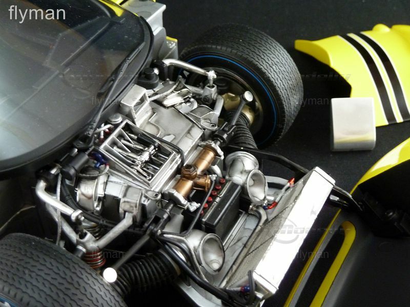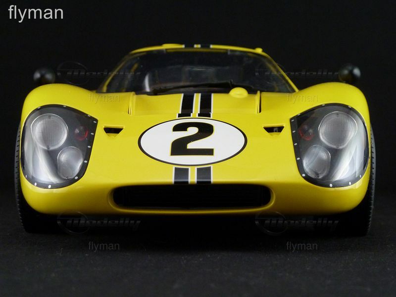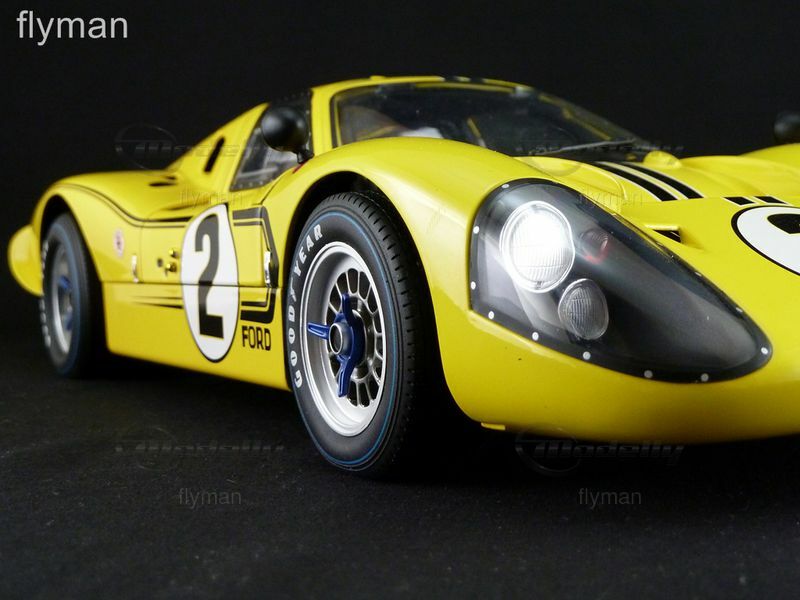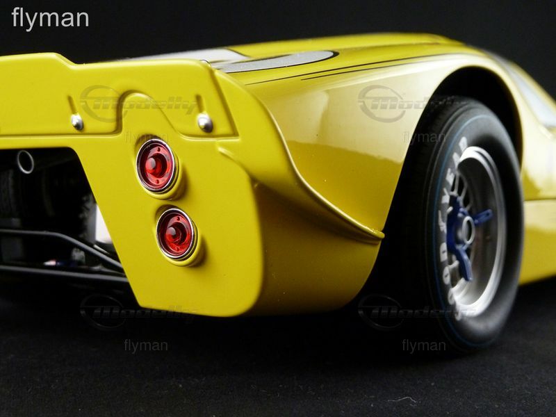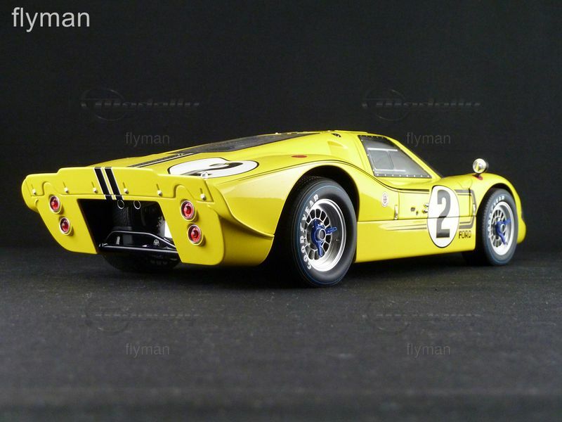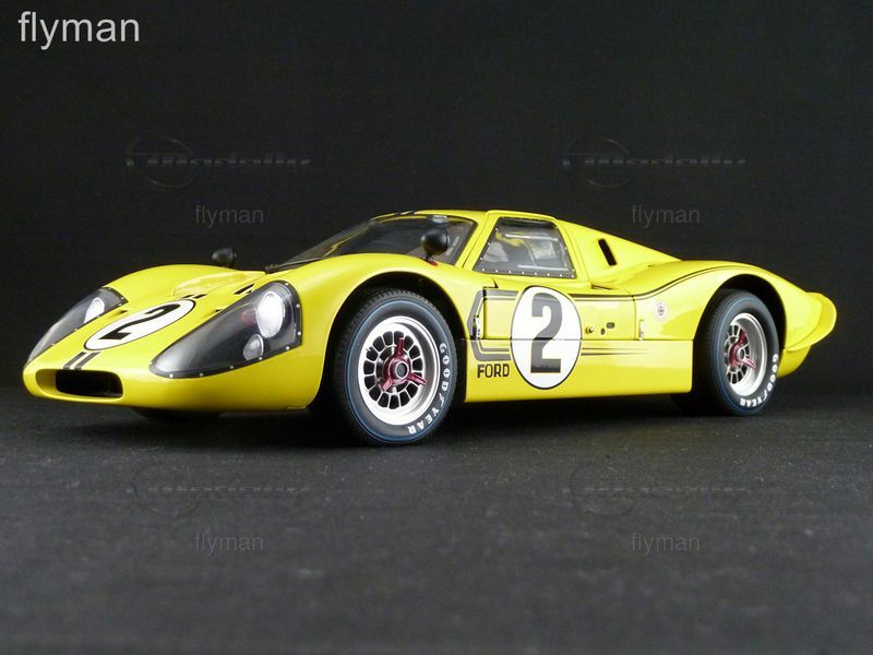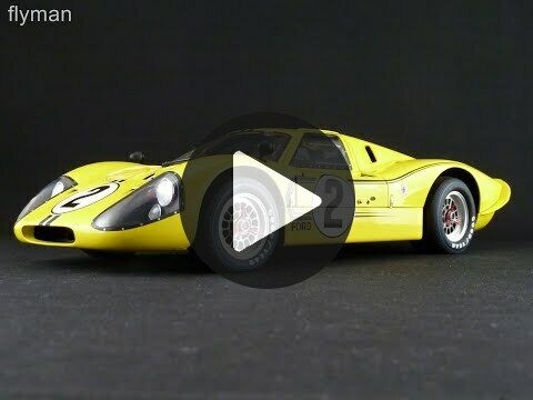 Das hier abgebildete Modell aus der Sammlung von Modelly-Mitglied "flyman" ist eine detailgetreue Nachbildung des Ford GT40 MK IV im 1:12 Maßstab, hergestellt von GMP. Es zeigt den Wagen in einer leuchtenden gelben Lackierung mit der Startnummer "2" und dem "Ford"-Schriftzug an den Seiten. Auch die charakteristischen Felgen und Reifen des Originals sind detailgetreu nachgebildet. Das Modell besticht durch seine Präzision und Detailtreue, wobei selbst kleine Elemente wie die Rennstreifen und Sponsoraufkleber akkurat dargestellt sind. Der Innenraum ist ebenfalls detailliert wiedergegeben, von den Rennsitzen bis hin zu den Armaturen.