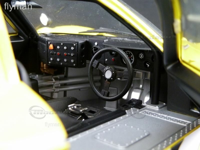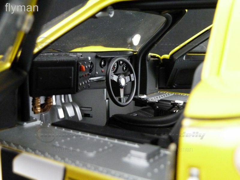 Das Modellfahrzeug von GMP im 1:12 Maßstab beeindruckt durch seine präzise Nachbildung und die hochwertige Verarbeitung. Die leuchtend gelbe Lackierung und die schwarzweißen Rennstreifen verleihen dem Wagen eine markante Optik. Zu den auffälligen Merkmalen gehören auch die roten Rücklichter und die detailgetreu nachgebildeten Luftauslässe und Lufteinlässe. Das Miniaturmodell zeigt auch die präzisen Sponsoraufkleber, darunter das Ford Logo. Diese exakte Nachbildung macht das Modell zu einem begehrten Sammlerstück für Enthusiasten und Modellbau-Liebhaber. Jeder Aspekt des Originals wurde sorgfältig erfasst und nachgebildet, wobei die Kombination aus Farbe, Formen und Details das Modell besonders beeindruckend macht.