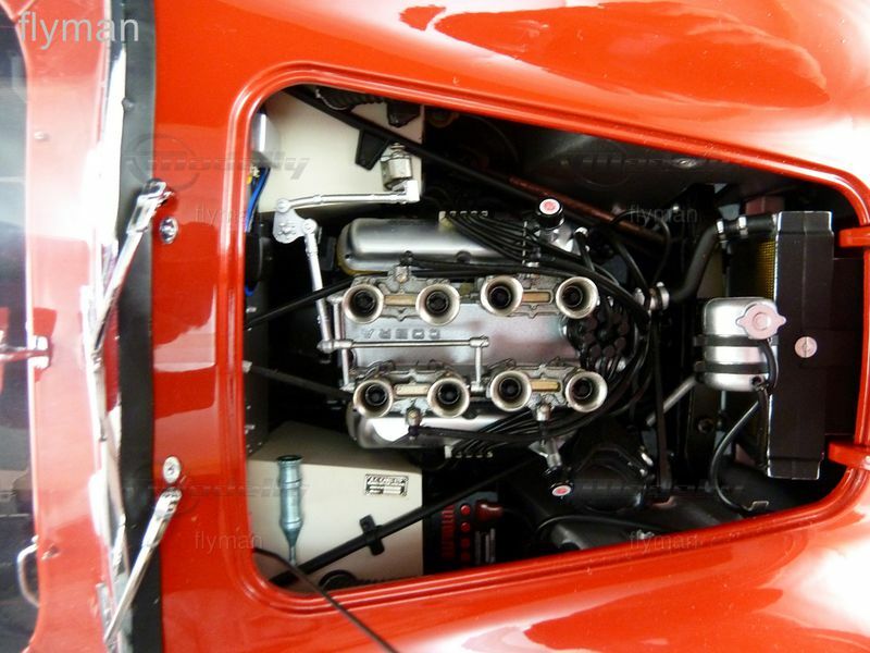 Neben der auffälligen roten Lackierung zeigt das Modell von GMP im 1:12 Maßstab auch präzise nachgebildete Details wie die Lufteinlässe an den Seiten, die charakteristische Form der Motorhaube und die eingravierten Embleme. Die präzise Nachbildung umfasst auch die Facetten der Beleuchtungselemente und die elegante Form der Rückspiegel. Dieses Modell ist nicht nur ein Augenschmaus, sondern auch ein Zeugnis hoher Handwerkskunst im Modellbau.