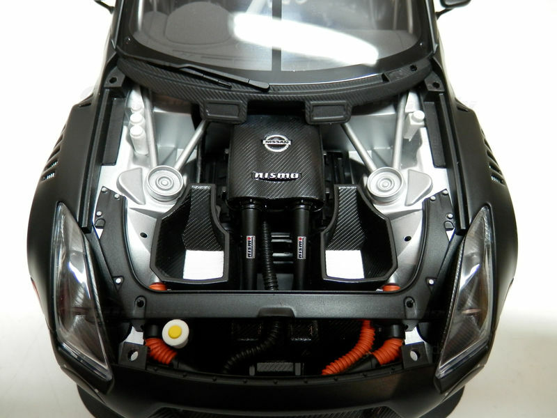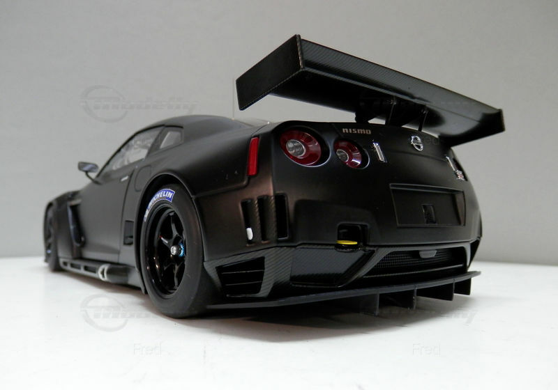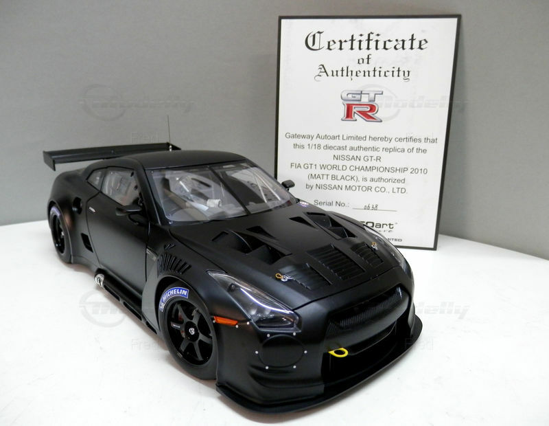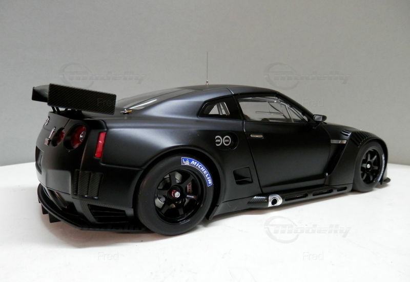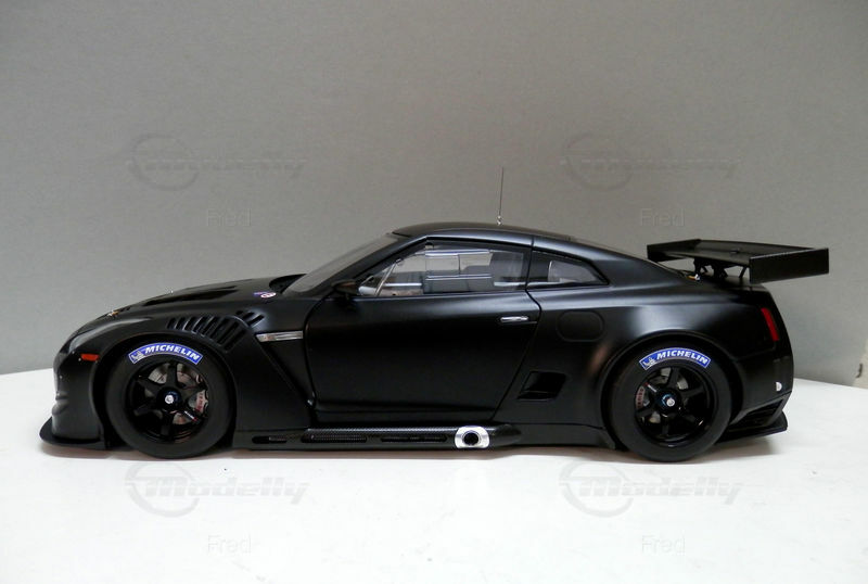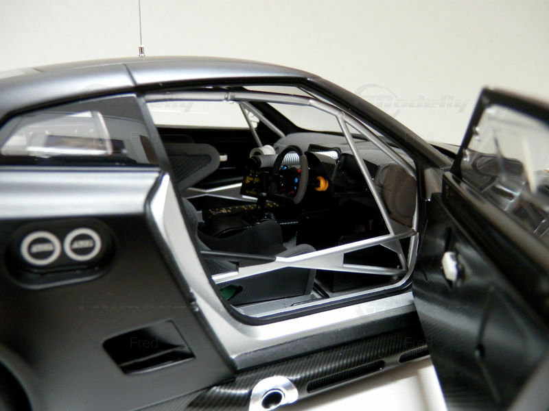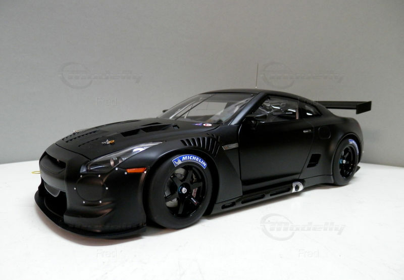 Das Modell, das wir hier haben, ist eine fantastische Nachbildung des Nissan GT-R GT1 im Maßstab 1:18. Hergestellt von AUTOart Signature, besticht dieses Modell durch seine detaillierte Verarbeitung. Das äußere Erscheinungsbild zeigt eine matte schwarze Lackierung, welche die aggressive und sportliche Natur des Fahrzeugs unterstreicht. Die Felgen sind ebenfalls in Schwarz gehalten und tragen das Michelin-Branding auf den Reifenflanken, was auf die Hochleistungsreifen des Originals verweist. Am Heck des Wagens findet sich ein großer Heckflügel, der nicht nur ein optisches Highlight darstellt, sondern auch die aerodynamische Funktion des echten Fahrzeugs widerspiegelt.