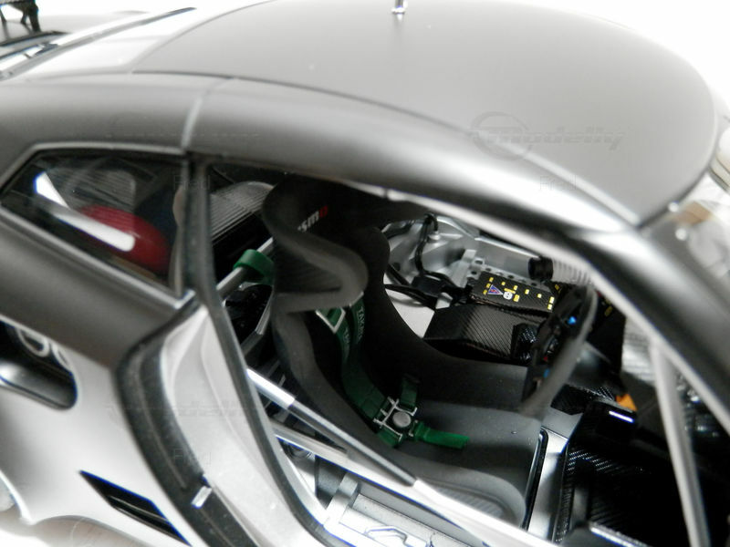 Dieses Modellauto ist im Maßstab 1:18 gehalten und wurde von dem renommierten Hersteller AUTOart Signature gefertigt. Die Detailtreue ist beeindruckend: Von den Nieten an den Kotflügelverbreiterungen bis zu den fein gearbeiteten Belüftungsschlitzen an den hinteren Seitenteilen wurde jedes Detail präzise nachgebildet. Die lackierten Seitenspiegel und der detaillierte Innenraum, der durch die klaren Fenster zu sehen ist, tragen ebenfalls zur Authentizität dieses Modells bei. Die mattschwarze Farbgebung hebt die robuste und leistungsstarke Erscheinung dieses Modells hervor, während die Sponsorenaufkleber von Michelin und andere dezente Logos das echte Rennsportgefühl wiederspiegeln.