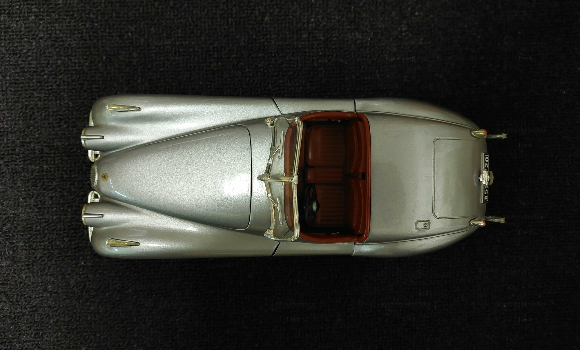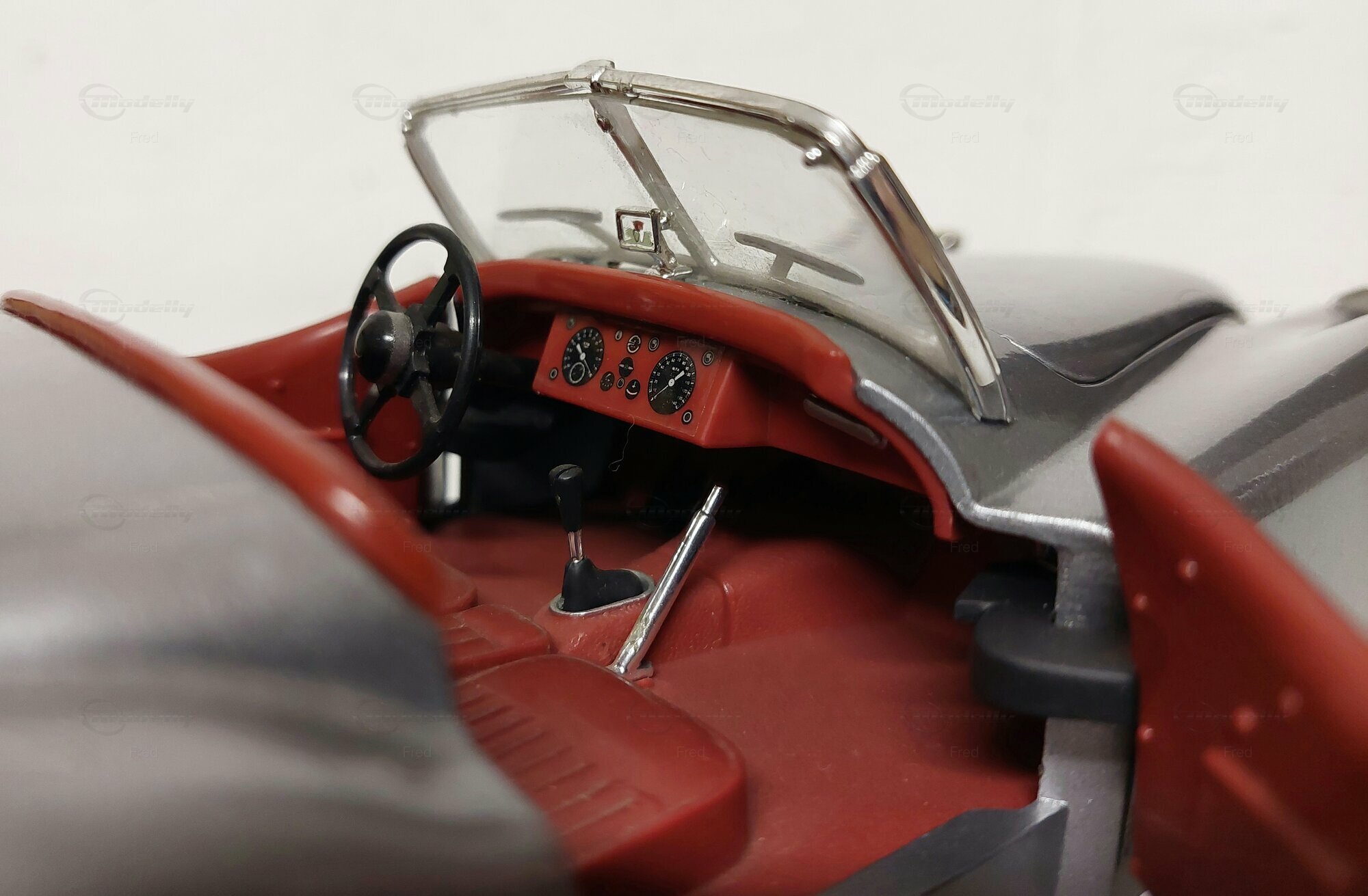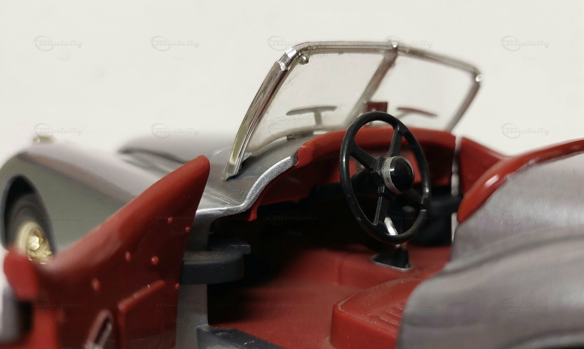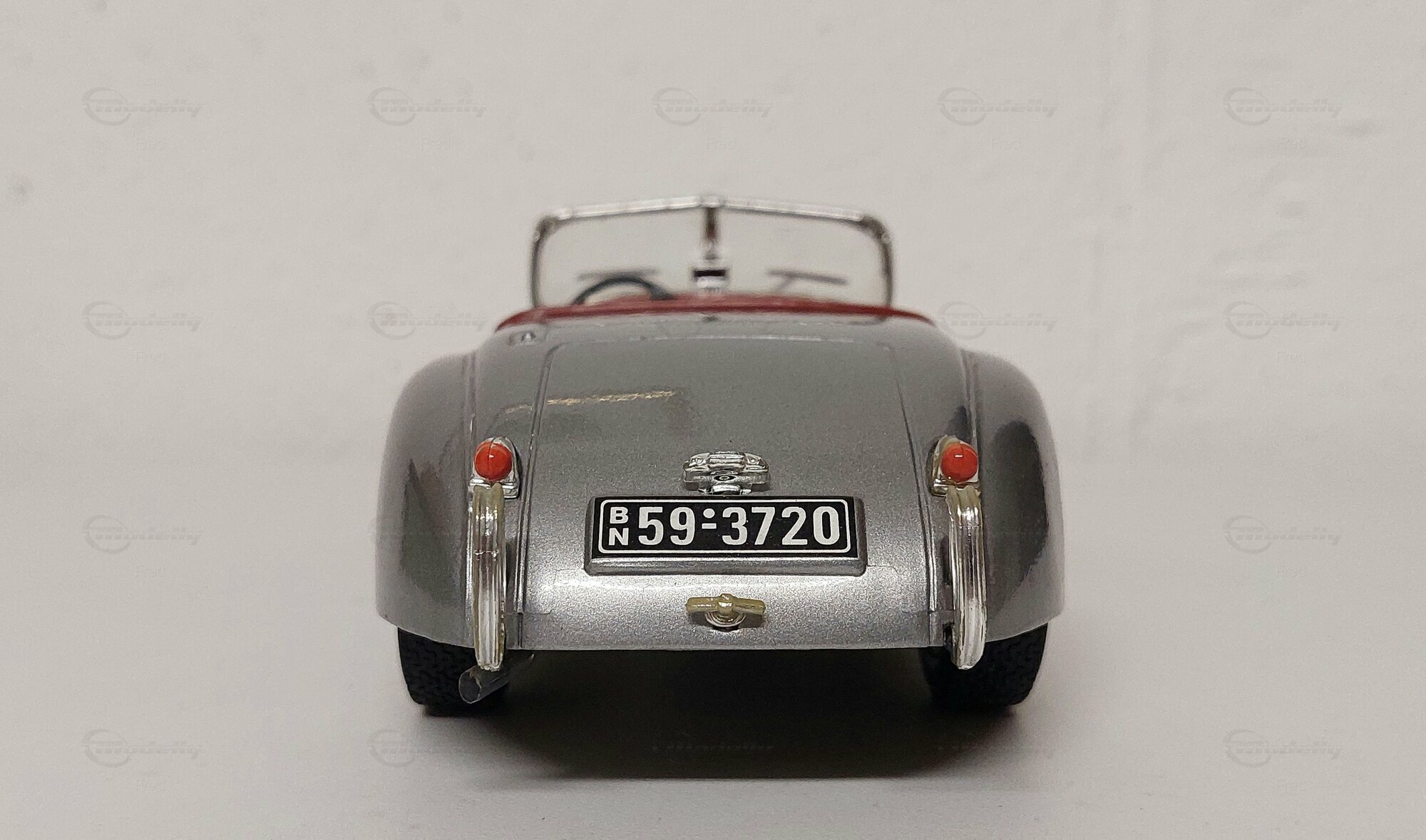 Das 1:18 Maßstabsmodell des Jaguar XK 120 wurde von Ertl mit viel Liebe zum Detail gefertigt. Dieses Modell, das Teil der Sammlung von Modelly-Mitglied "Fred" ist, ist aus hochwertigem Diecast-Material gefertigt. Das Modell zeigt die klassischen Linien und Konturen des Originals und zeichnet sich durch eine silberfarbene Lackierung aus, die dem echten Jaguar XK 120 sehr nahe kommt. Die goldfarbenen Speichenräder und die farblich abgestimmten Radkappen vermitteln ein authentisches Gefühl der 1940er Jahre. Das Lenkrad, die Pedale und die Instrumententafel im Inneren des Modells sind mit größter Sorgfalt nachgebildet. Die gold glänzenden Speichenräder des Modells sind besonders auffällig und verleihen dem Fahrzeug eine edle Optik. Das detaillierte Interieur und die rote Innenausstattung betonen die handwerkliche Präzision, mit der dieses Modell gebaut wurde.