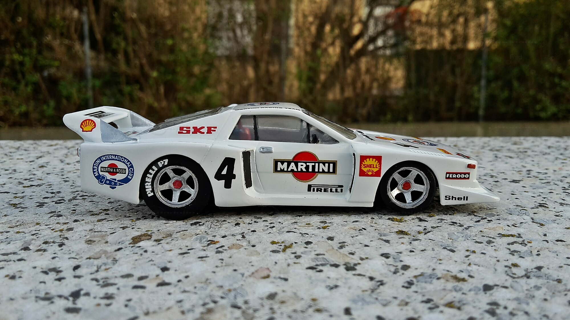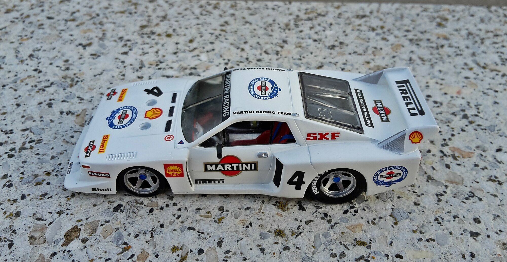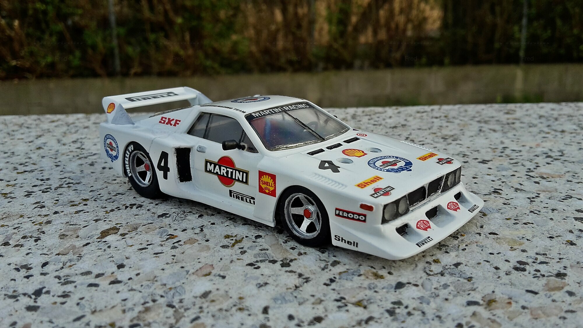 Das präsentierte Modell, das im Besitz von Modelly-Mitglied "Fred" ist, ist ein modifiziertes Modell im Maßstab 1:43 und wurde ursprünglich von Heller Frankreich hergestellt. Der Miniaturwagen basiert auf dem Lancia Beta Montecarlo Gr.5 und besteht aus Plastik. Diese modifizierte Miniatur repräsentiert nicht das ursprünglich von Heller Frankreich produzierte Produkt. Die Detailtreue dieser Nachbildung wird deutlich durch die originalgetreue Lackierung und Dekalierung, darunter auch die Sponsoren, wie Martini und Shell. Das Fahrzeug ist in einer markanten weißen Grundfarbe gehalten, ergänzt durch die ikonischen roten und schwarzen Martini-Logos. Die dazugehörigen Details wie Felgen, Spoiler und Logos sind präzise und mit hoher Genauigkeit wiedergegeben.