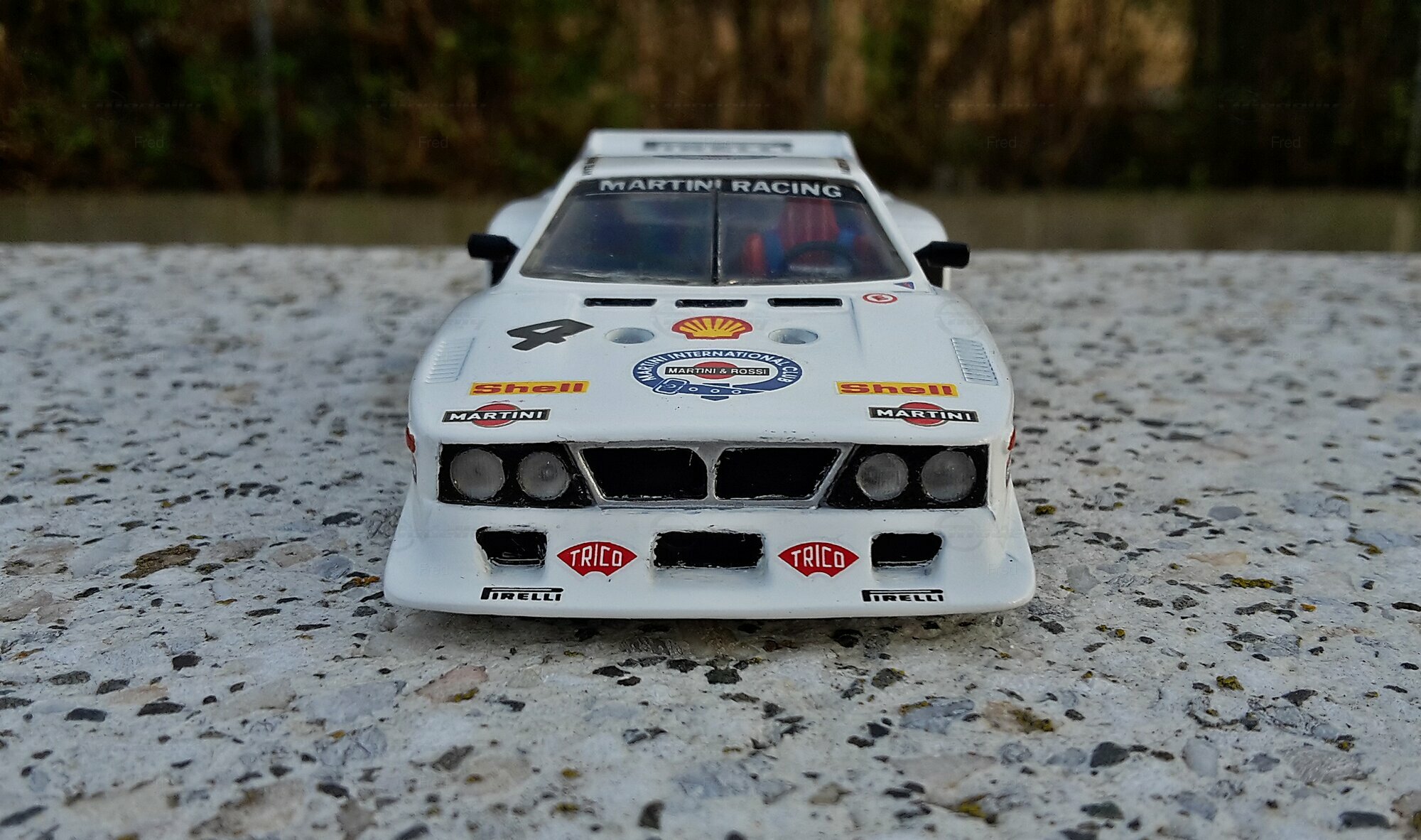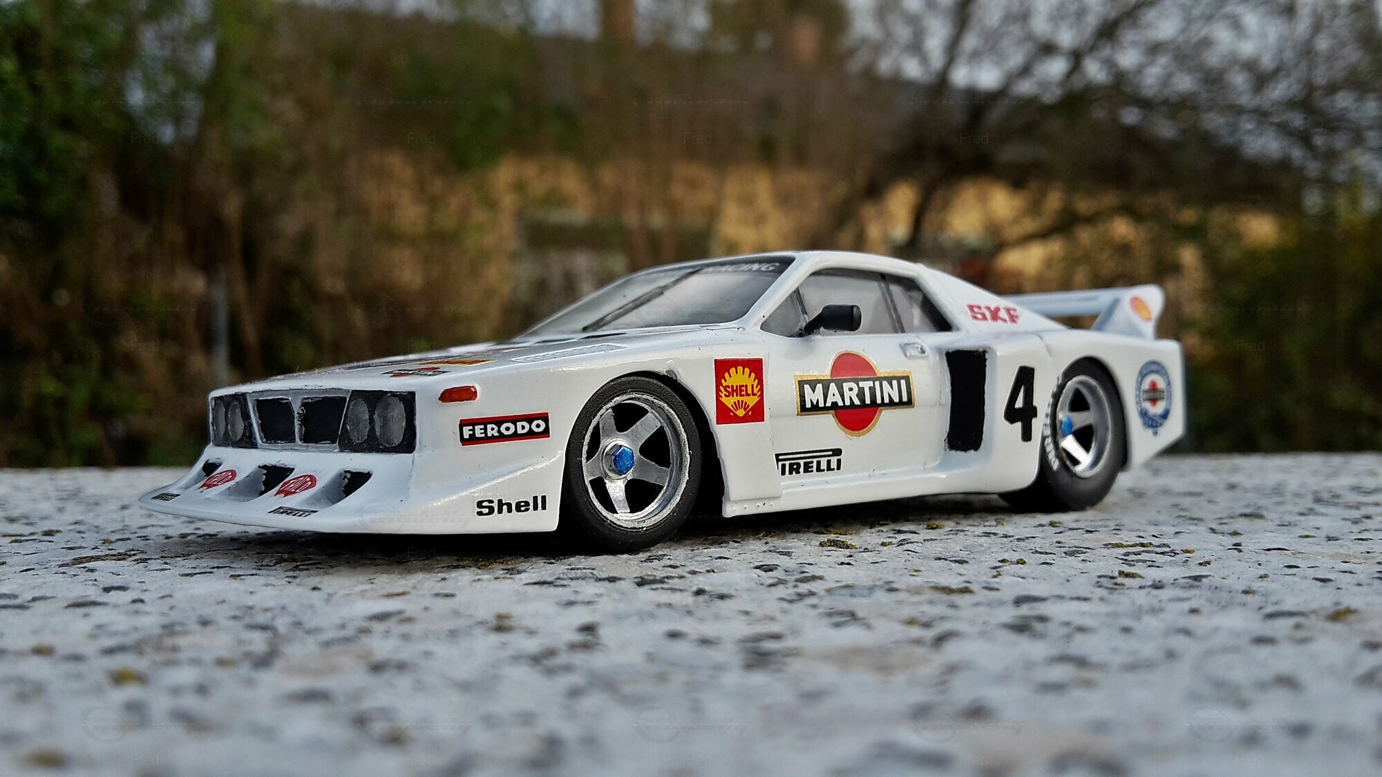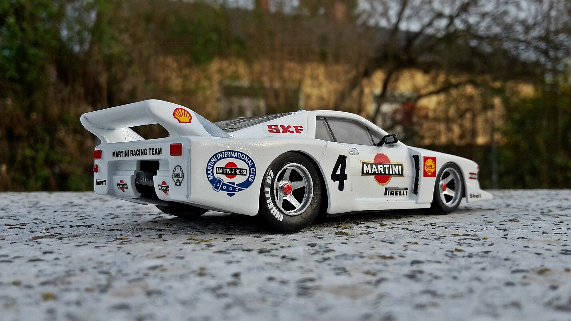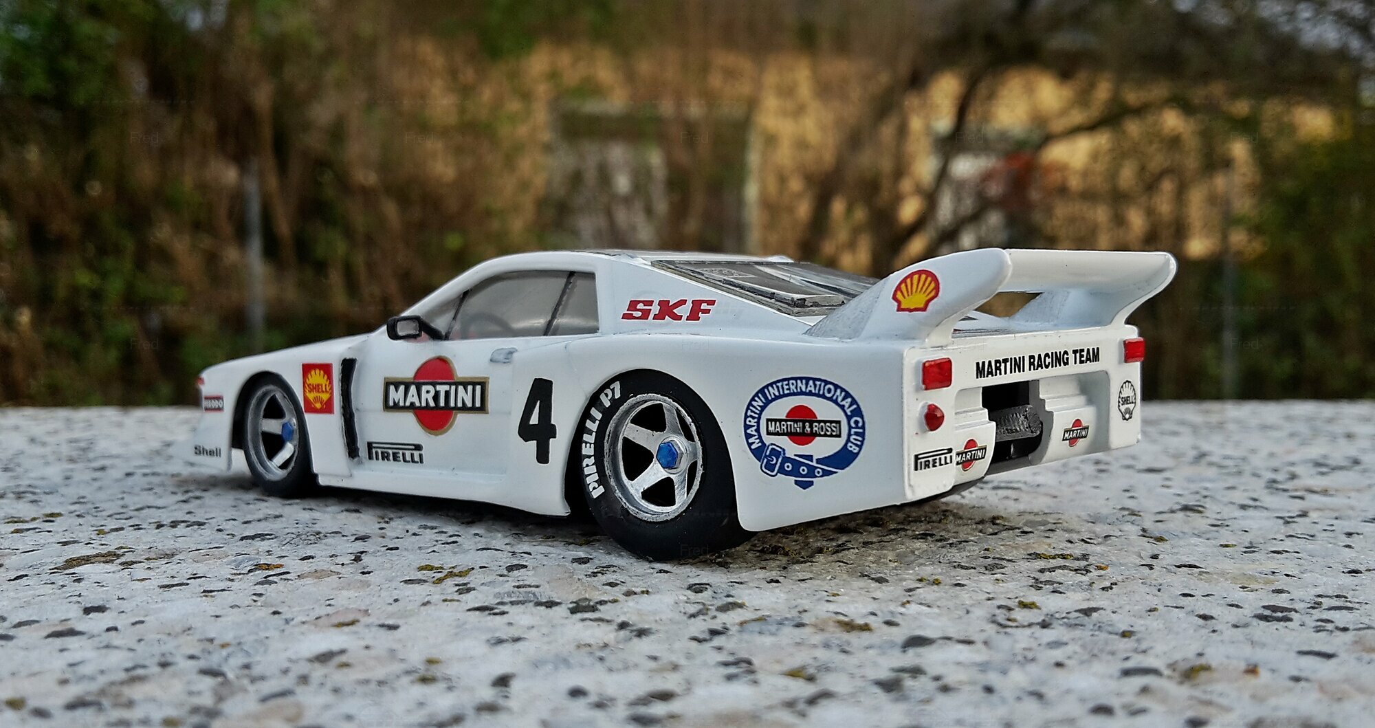 Das präsentierte Modell, das im Besitz von Modelly-Mitglied "Fred" ist, ist ein modifiziertes Modell im Maßstab 1:43 und wurde ursprünglich von Heller Frankreich hergestellt. Der Miniaturwagen basiert auf dem Lancia Beta Montecarlo Gr.5 und besteht aus Plastik. Diese modifizierte Miniatur repräsentiert nicht das ursprünglich von Heller Frankreich produzierte Produkt. Die Detailtreue dieser Nachbildung wird deutlich durch die originalgetreue Lackierung und Dekalierung, darunter auch die Sponsoren, wie Martini und Shell. Das Fahrzeug ist in einer markanten weißen Grundfarbe gehalten, ergänzt durch die ikonischen roten und schwarzen Martini-Logos. Die dazugehörigen Details wie Felgen, Spoiler und Logos sind präzise und mit hoher Genauigkeit wiedergegeben.