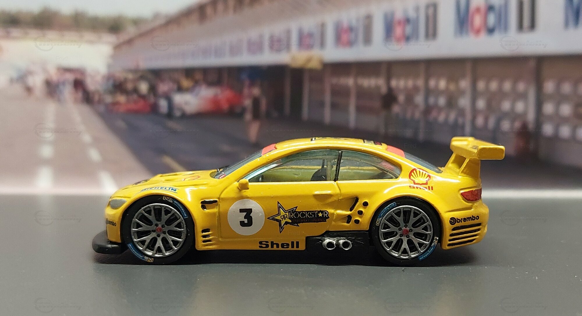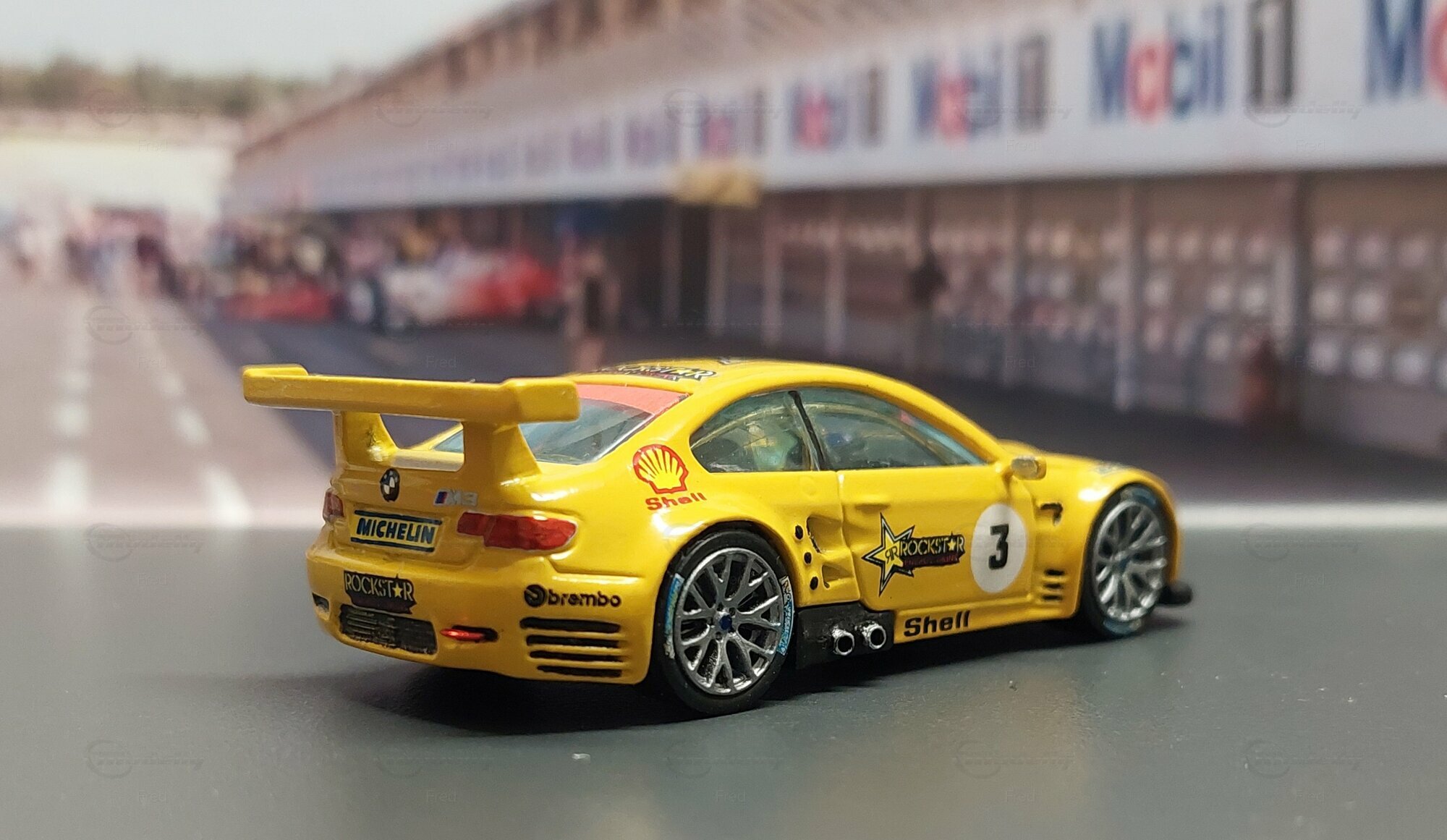 Das hier gezeigte Modellauto im 1:64 Maßstab wurde von Hot Wheels produziert und ist ein exzellentes Beispiel für detailgetreue Nachbildungen. Das Modell besteht aus Diecast-Material und weist eine hohe Verarbeitungsqualität auf. Es handelt sich um eine modifizierte Version, die nicht das ursprünglich von Hot Wheels produzierte Modell darstellt und sich von diesem unterscheidet. Sichtbar sind unter anderem die Bedruckungen und spezielle Sponsoren-Logos wie Michelin, Shell und Rockstar, die das Modell besonders und einzigartig machen.