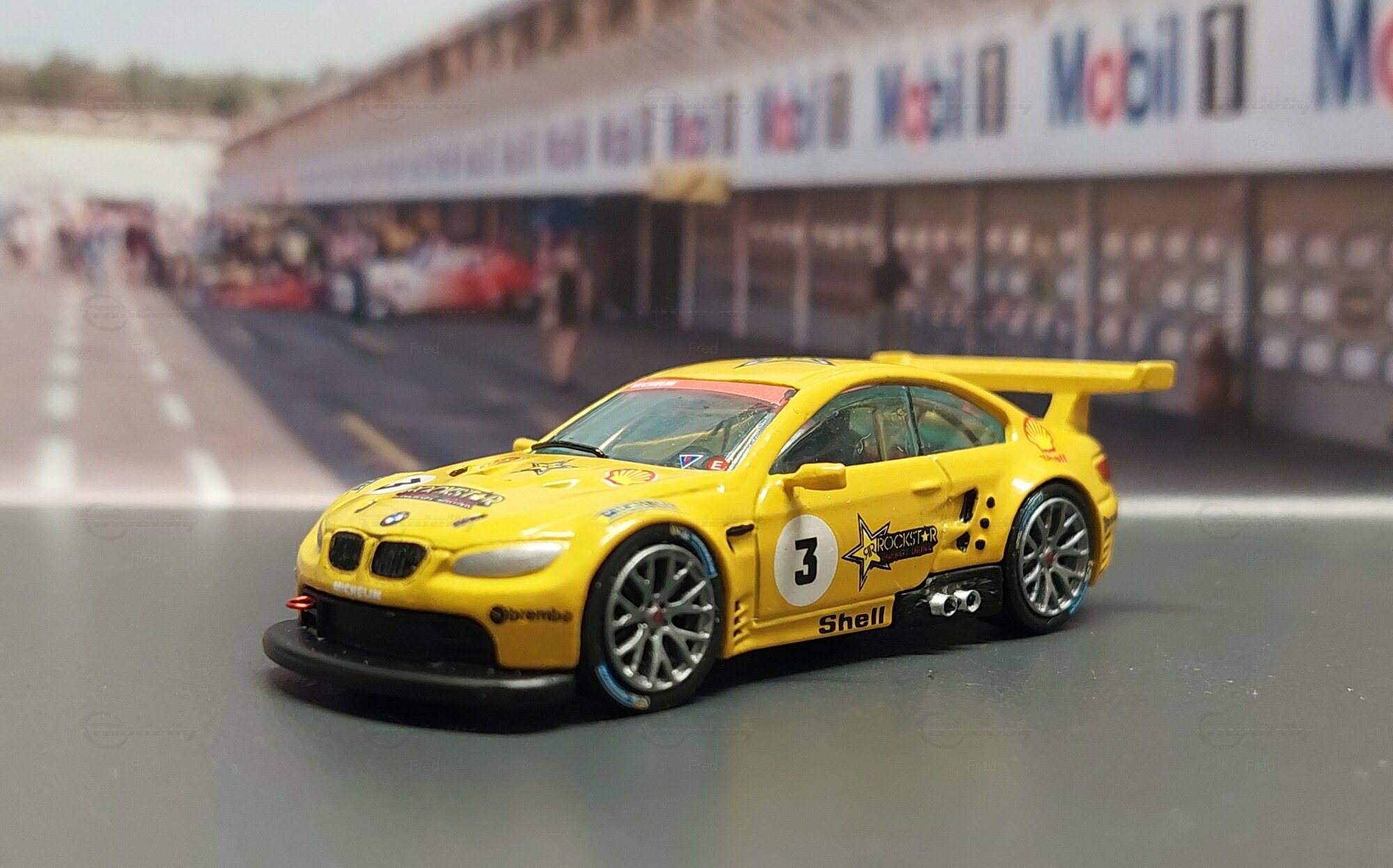 Das Modellauto von Modellly-Mitglied "Fred" zeigt eine gelbe Lackierung mit verschiedenen Sponsorenlogos, darunter prominent Rockstar an den Seiten. Die Rennnummer 3 und die Vielzahl an Belüftungsöffnungen unterstreichen den Motorsportcharakter des Modells. Die hochwertige, handgefertigte Detailarbeit und der gut proportionierte Heckspoiler verleihen dem Modell die nötige Finesse und machen es zu einem Highlight in jeder Modellautosammlung.