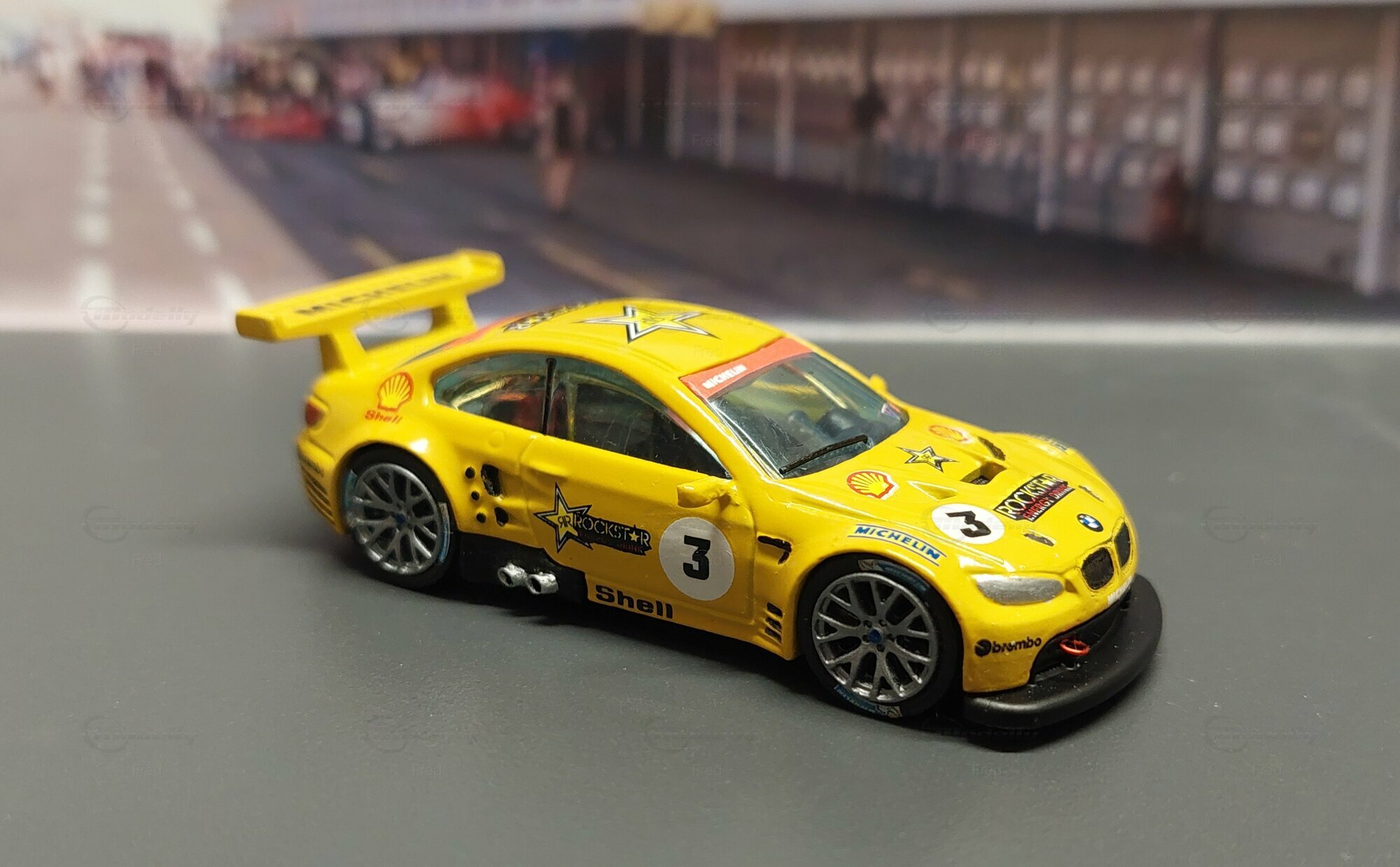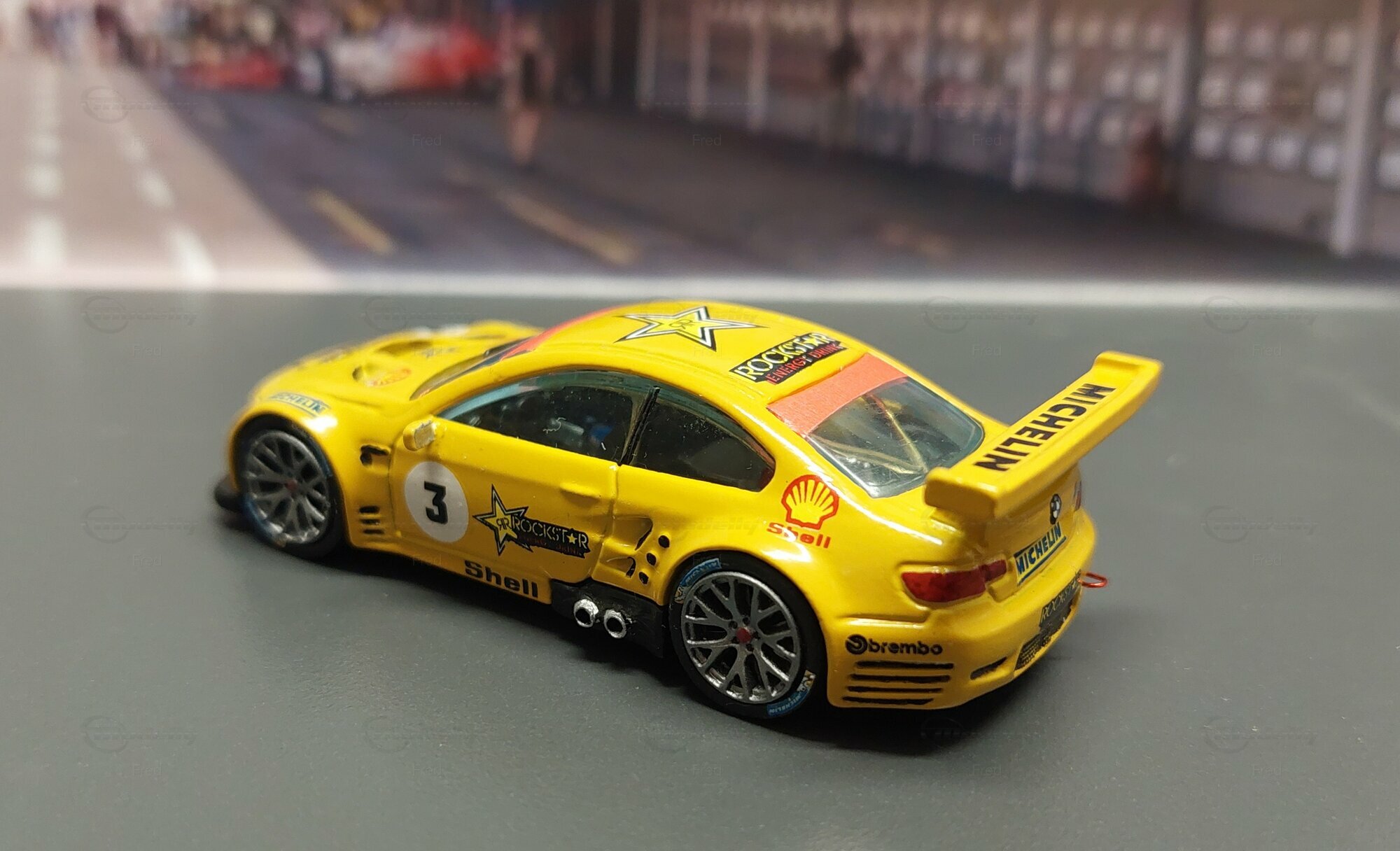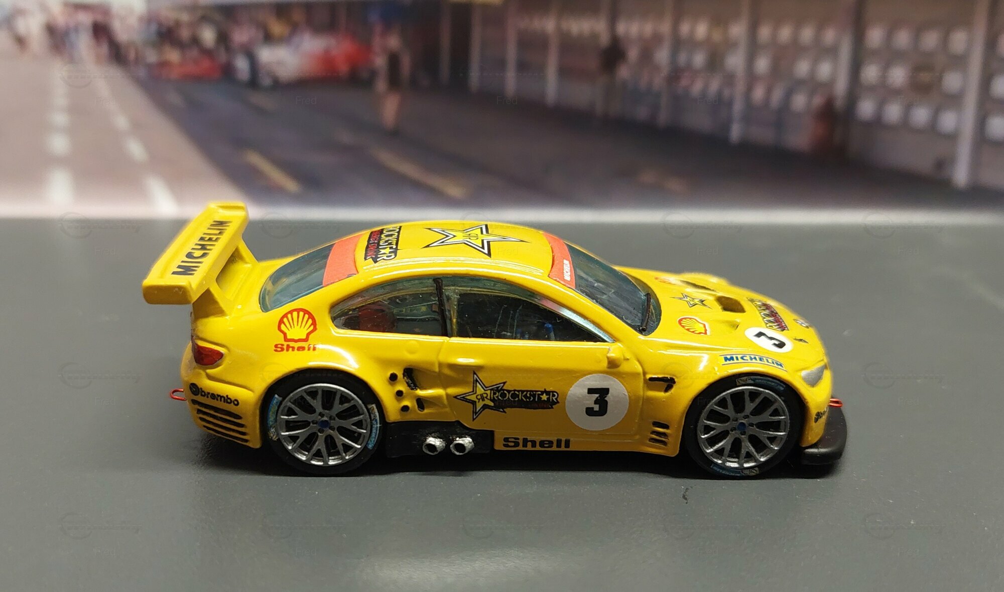 Das Modellauto von Modellly-Mitglied "Fred" zeigt eine gelbe Lackierung mit verschiedenen Sponsorenlogos, darunter prominent Rockstar an den Seiten. Die Rennnummer 3 und die Vielzahl an Belüftungsöffnungen unterstreichen den Motorsportcharakter des Modells. Die hochwertige, handgefertigte Detailarbeit und der gut proportionierte Heckspoiler verleihen dem Modell die nötige Finesse und machen es zu einem Highlight in jeder Modellautosammlung.