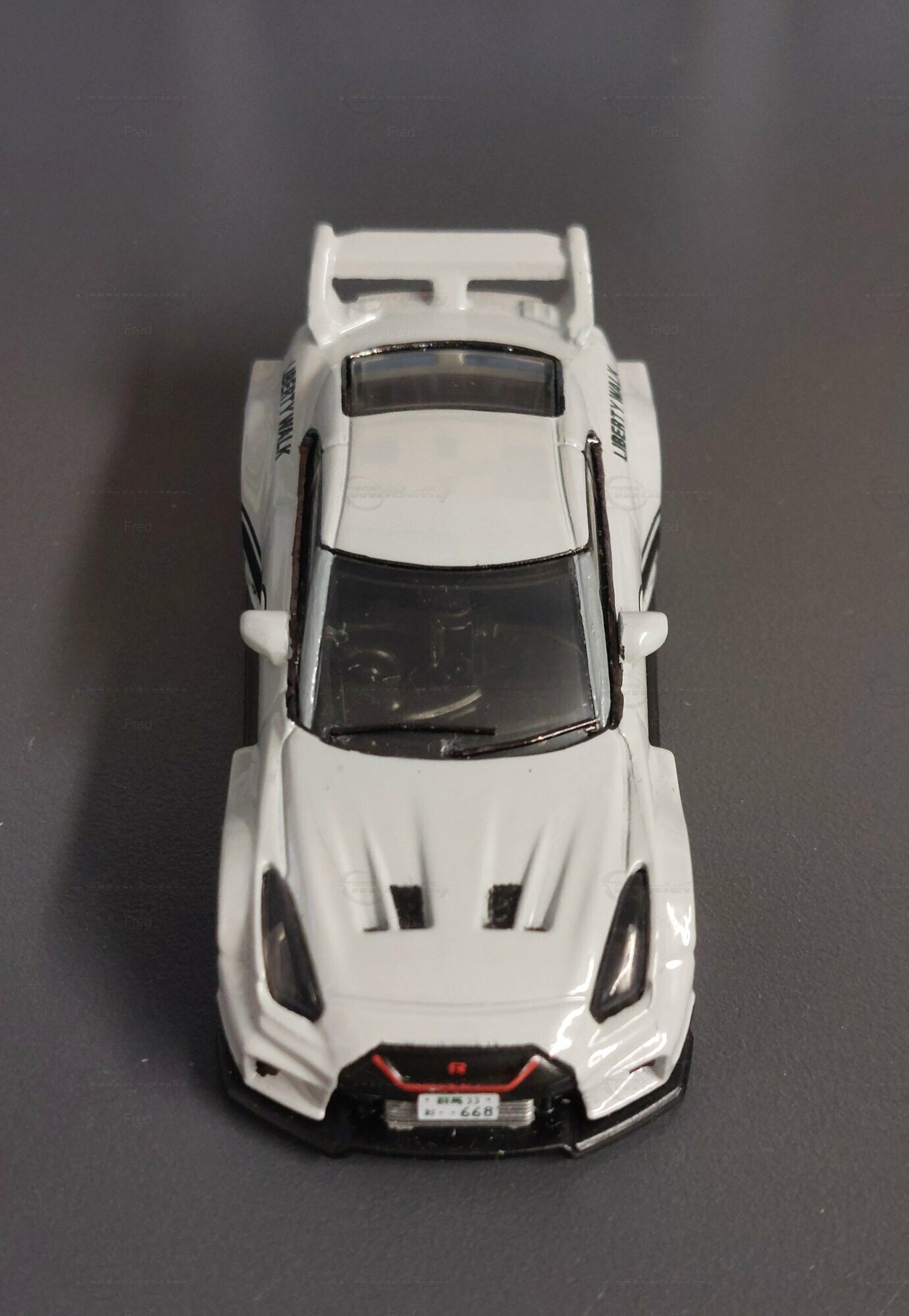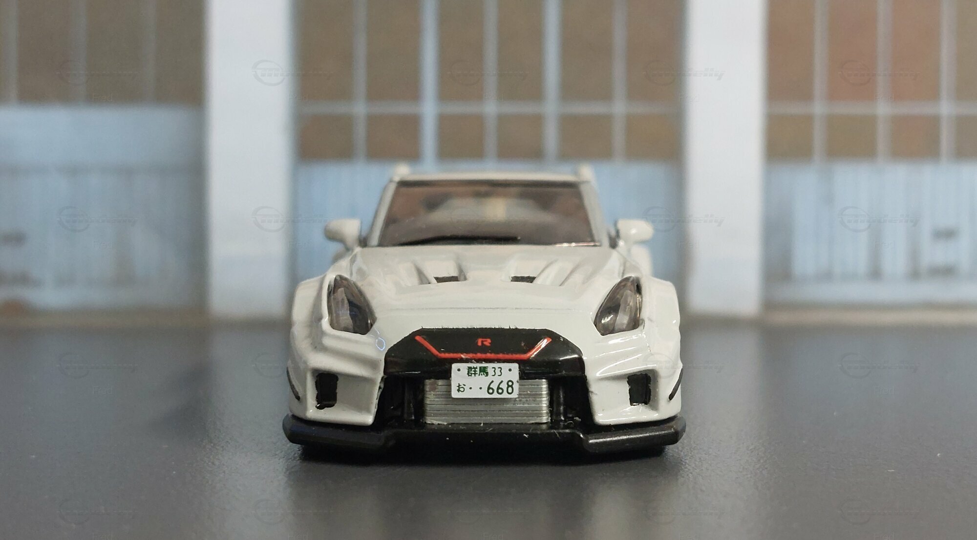 Das hier gezeigte Miniaturfahrzeug orientiert sich am getunten Sportwagen Nissan 35GT‑RR VER.2, der auf dem Serienmodell Nissan GT‑R (R35) basiert. Der R35 ist seit 2007 in Produktion und löste den Skyline GT‑R R34 als technisches Flaggschiff ab. Kern des Fahrzeugs ist der 3,8‑Liter‑V6 VR38DETT mit Biturboaufladung, der in der ersten Ausbaustufe 353 kW/480 PS leistete und in späteren Modellpflegen bis zu 441 kW/600 PS im NISMO erreichte. Die Kraftübertragung erfolgt über ein heckseitiges 6‑Gang‑Doppelkupplungsgetriebe (GR6) in Transaxle‑Bauweise. Das elektronische Allradsystem ATTESA E‑TS verteilt die Antriebsmomente variabel zwischen Vorder‑ und Hinterachse. Die Chassiskonstruktion nutzt eine Mischbauweise mit Aluminium, Stahl und Verbundwerkstoffen, Doppelquerlenker vorn und Mehrlenker hinten. An der Entwicklung waren u. a. der Chief Engineer Kazutoshi Mizuno, Designchef Shiro Nakamura und später Produktverantwortlicher Hiroshi Tamura beteiligt. Das Vorbild Nissan 35GT‑RR VER.2 macht sich diese Technik zunutze und ergänzt sie um eine Rennsport‑anmutende Aerodynamik, die aus dem GT‑R einen straßenzugelassenen Show‑ und Track‑Umbau formt.