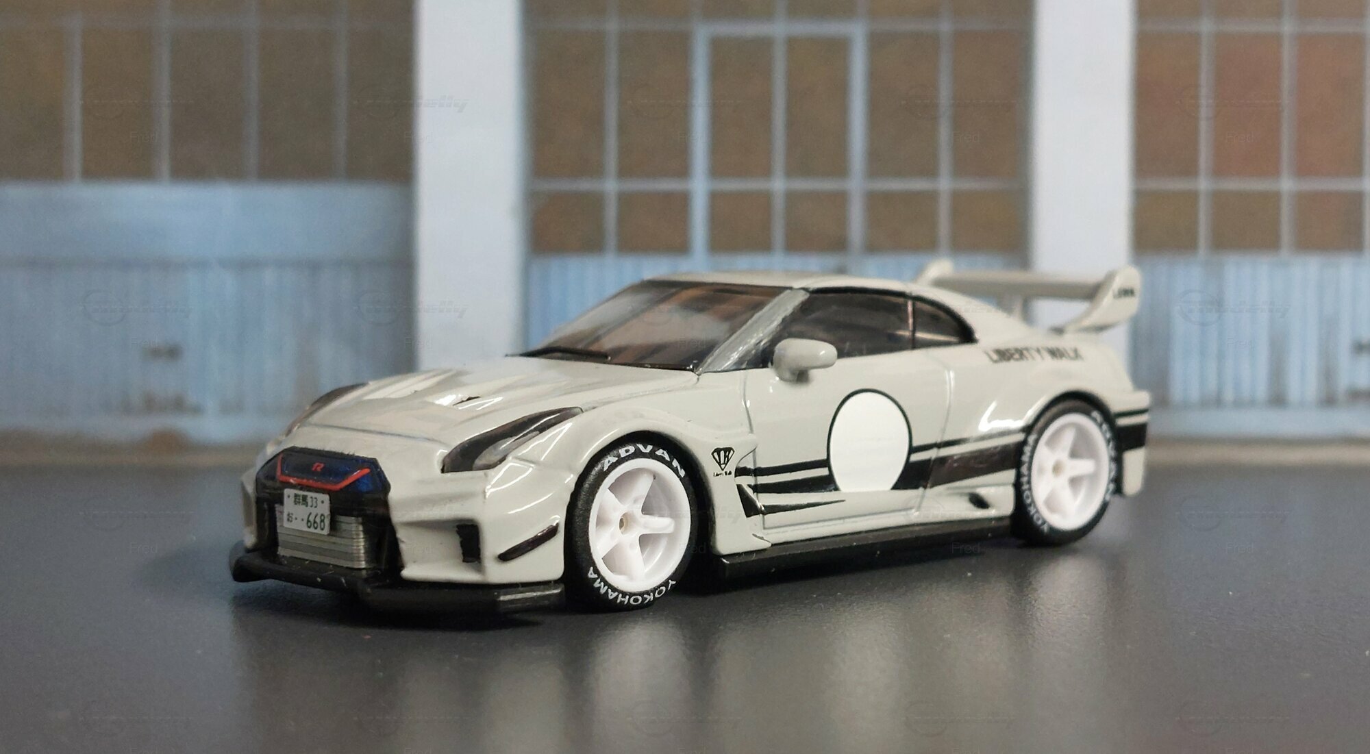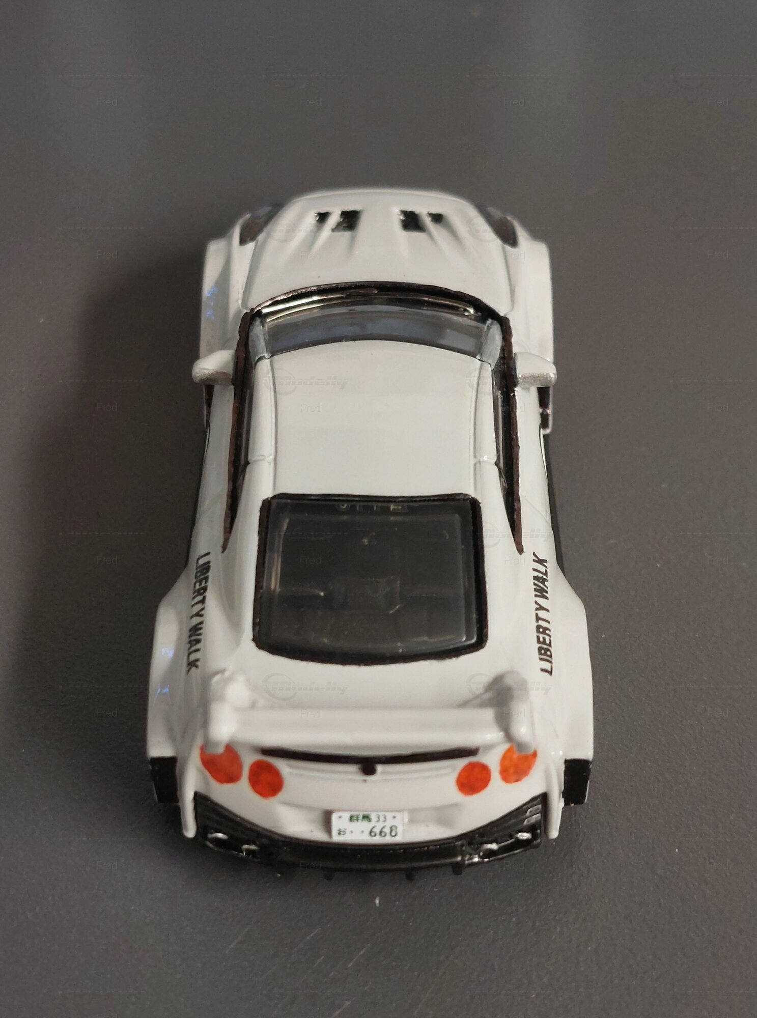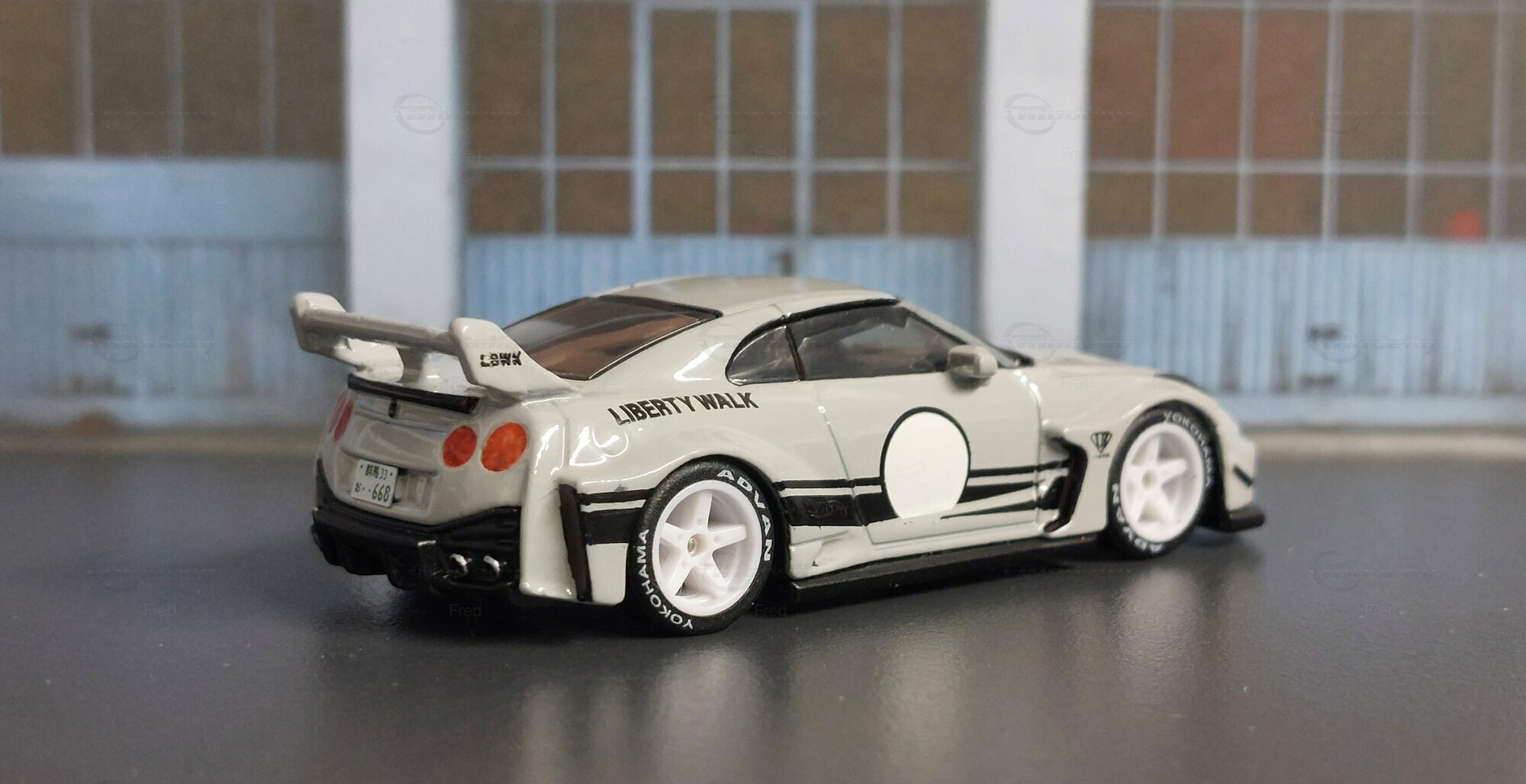 Das Exponat gehört zur Sammlung des Modelly‑Mitglieds Fred und ist ein Modellauto im 1:64‑Maßstab von Hot Wheels. Wichtig für Sammler: Es handelt sich um eine modifizierte Miniatur, die nicht dem Serienprodukt des Herstellers entspricht. Das Basismodell wurde aus druckgegossenem Metall (diecast) gefertigt und nachträglich überarbeitet. Die Fotos zeigen eine graue Lackierung mit schwarzen Seitenstreifen, weißen Kreisen in Türhöhe und den gut lesbaren Schriftzügen „LIBERTY WALK“ auf den Kotflügeln und seitlich am Heck. Vorn fällt eine rot abgesetzte Rahmenlinie rund um den Kühllufteinlass auf, dazu ein kleines „R“-Emblem. Der Lufteinlass gibt den Blick auf einen silberfarbenen Ladeluftkühler frei. Die Haube trägt zwei lange Entlüftungskanäle und eine mittige Öffnung, was den Look des Nissan 35GT‑RR VER.2 aufgreift. Die Karosserie zeigt tief heruntergezogene Schürzen, ein Lip‑Spolier‑Element und verbreiterte Radhäuser. Am Heck sind die vier Endrohre als eigenständiger Einsatz betont, darüber die typischen runden Rückleuchten des R35. Weiße Fünfspeichenräder mit Reifenbeschriftung „YOKOHAMA“ und „ADVAN“ sowie eine deutliche Tieferlegung prägen die Seitenansicht. Japanische Kennzeichen mit der Endziffer 668 sind vorn und hinten montiert. Fenster und Innenraum sind leicht getönt; Spiegel, Leuchteneinheiten und Spoiler sind separat eingesetzt. Noch einmal ausdrücklich: Dieses Stück ist ein Umbau, also eine angepasste, individuell veredelte Interpretation und stellt nicht das ab Werk ausgelieferte Produkt von Hot Wheels dar.