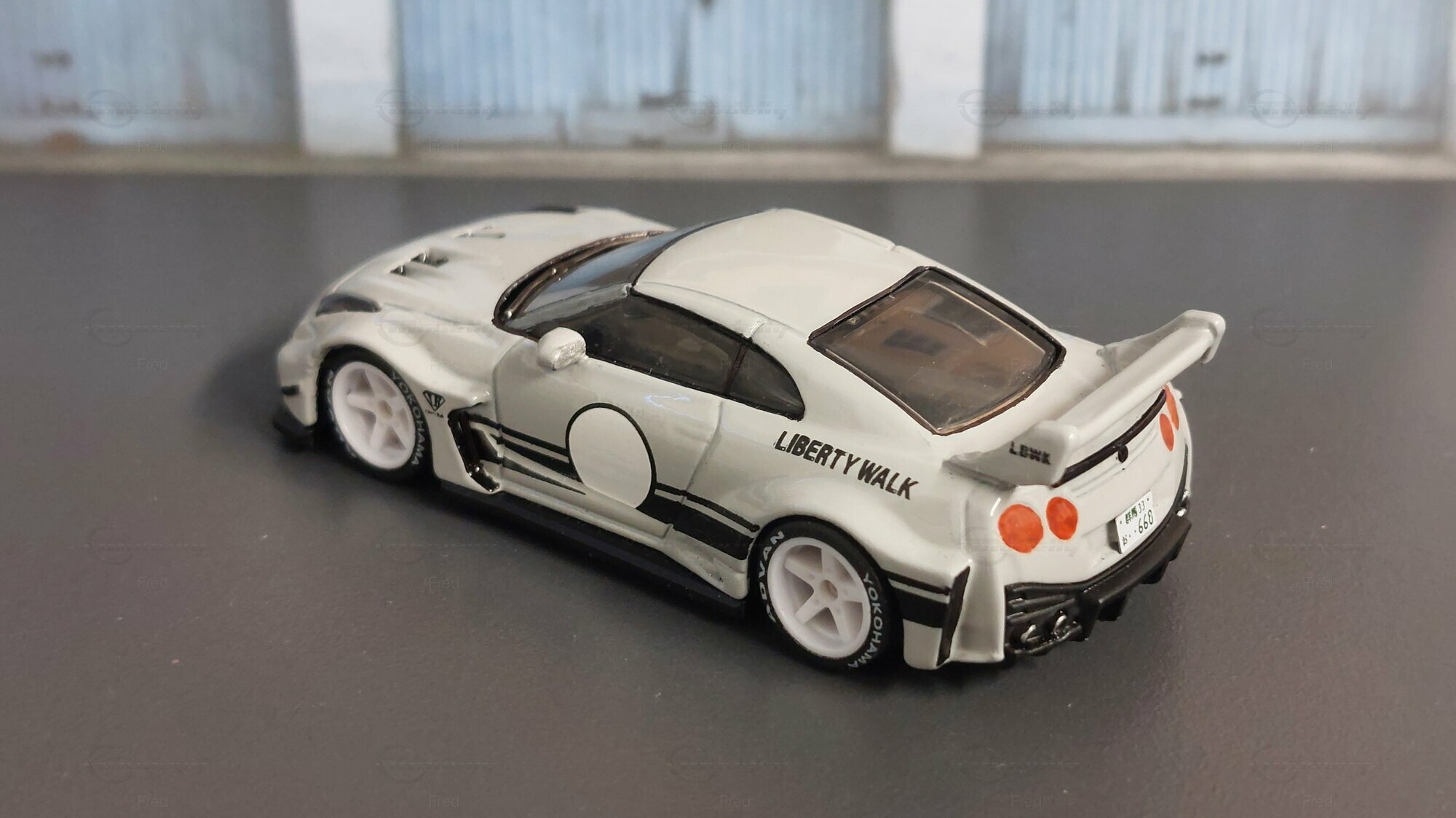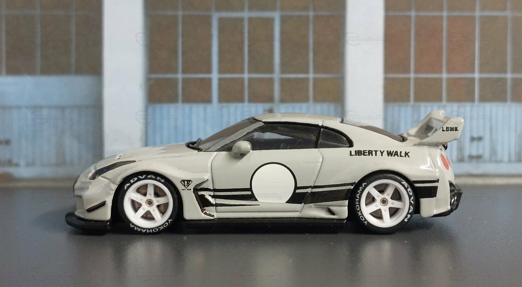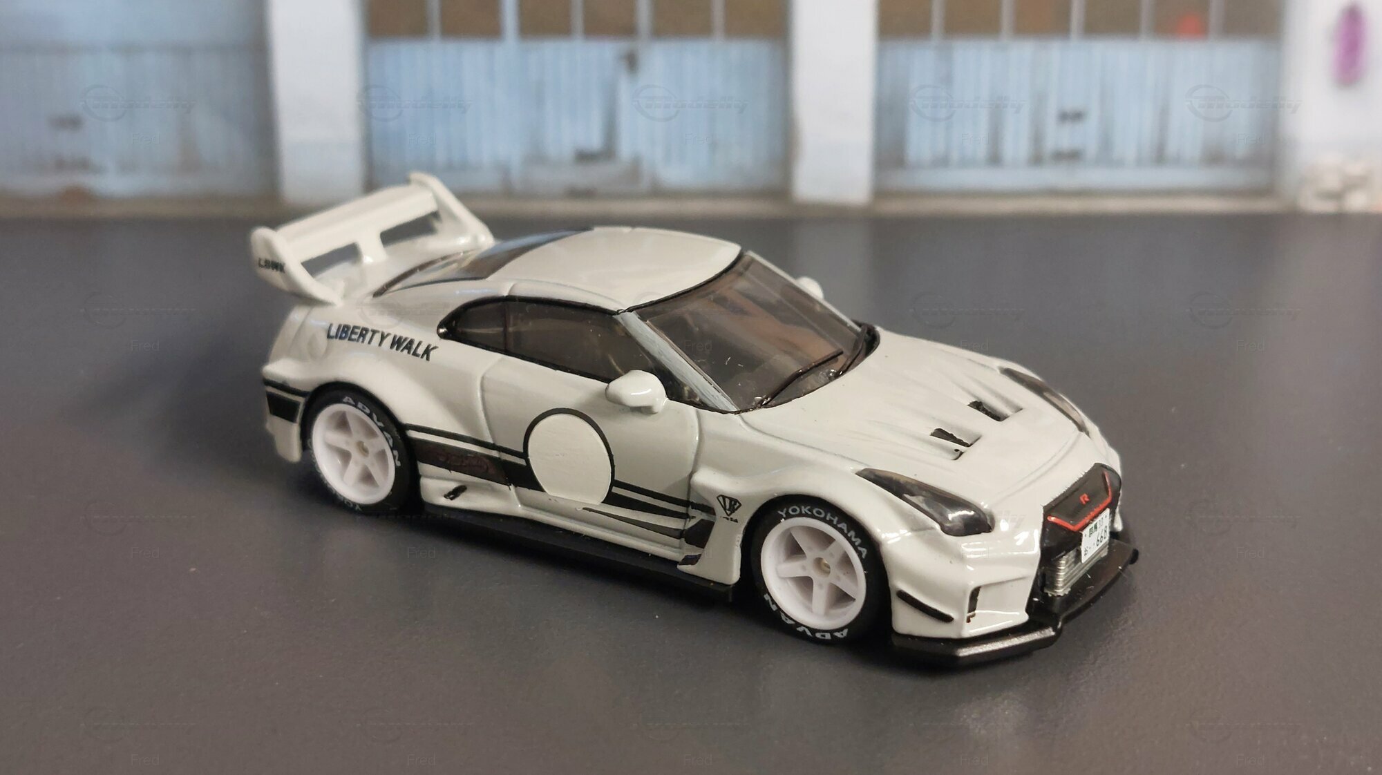 Das Exponat gehört zur Sammlung des Modelly‑Mitglieds Fred und ist ein Modellauto im 1:64‑Maßstab von Hot Wheels. Wichtig für Sammler: Es handelt sich um eine modifizierte Miniatur, die nicht dem Serienprodukt des Herstellers entspricht. Das Basismodell wurde aus druckgegossenem Metall (diecast) gefertigt und nachträglich überarbeitet. Die Fotos zeigen eine graue Lackierung mit schwarzen Seitenstreifen, weißen Kreisen in Türhöhe und den gut lesbaren Schriftzügen „LIBERTY WALK“ auf den Kotflügeln und seitlich am Heck. Vorn fällt eine rot abgesetzte Rahmenlinie rund um den Kühllufteinlass auf, dazu ein kleines „R“-Emblem. Der Lufteinlass gibt den Blick auf einen silberfarbenen Ladeluftkühler frei. Die Haube trägt zwei lange Entlüftungskanäle und eine mittige Öffnung, was den Look des Nissan 35GT‑RR VER.2 aufgreift. Die Karosserie zeigt tief heruntergezogene Schürzen, ein Lip‑Spolier‑Element und verbreiterte Radhäuser. Am Heck sind die vier Endrohre als eigenständiger Einsatz betont, darüber die typischen runden Rückleuchten des R35. Weiße Fünfspeichenräder mit Reifenbeschriftung „YOKOHAMA“ und „ADVAN“ sowie eine deutliche Tieferlegung prägen die Seitenansicht. Japanische Kennzeichen mit der Endziffer 668 sind vorn und hinten montiert. Fenster und Innenraum sind leicht getönt; Spiegel, Leuchteneinheiten und Spoiler sind separat eingesetzt. Noch einmal ausdrücklich: Dieses Stück ist ein Umbau, also eine angepasste, individuell veredelte Interpretation und stellt nicht das ab Werk ausgelieferte Produkt von Hot Wheels dar.