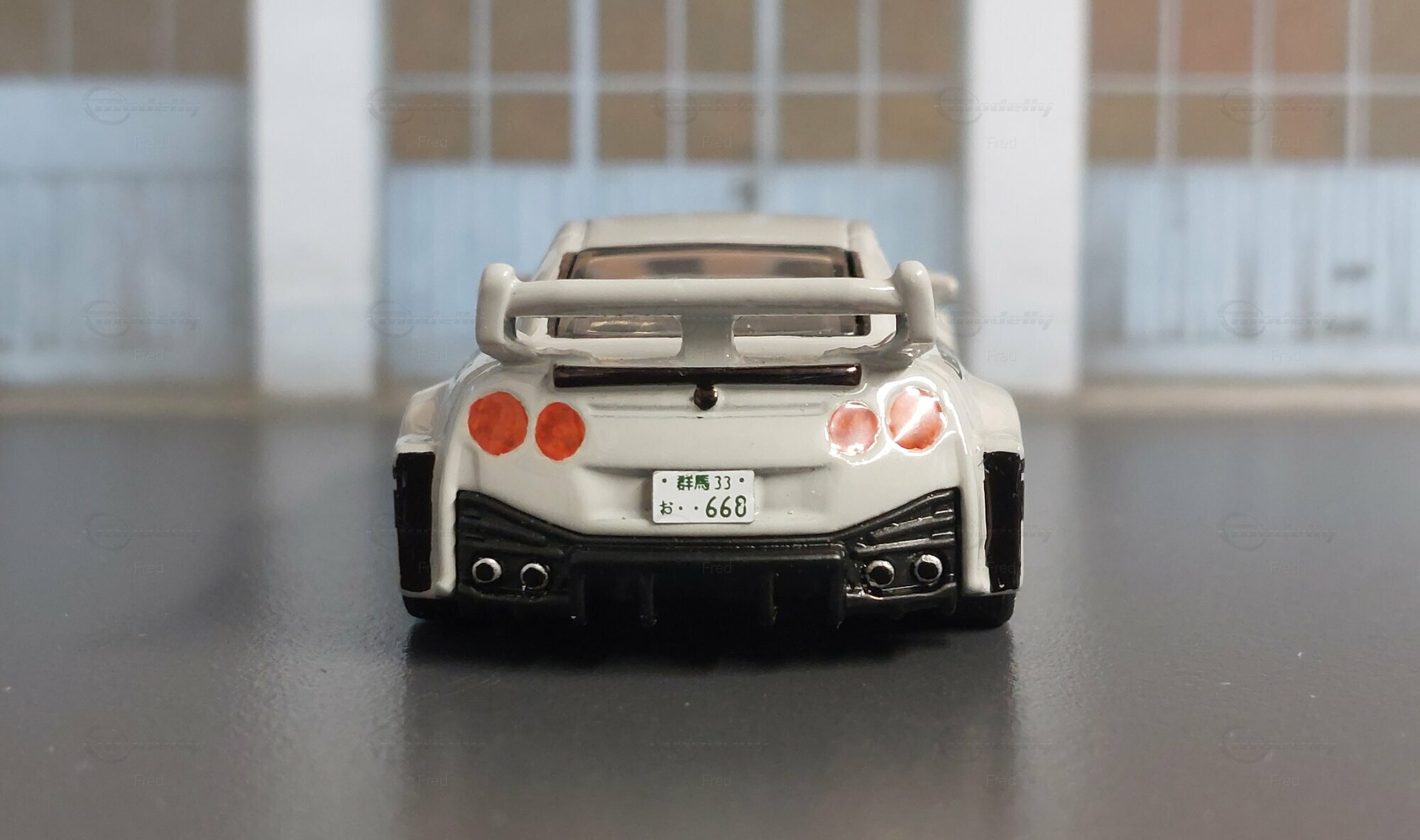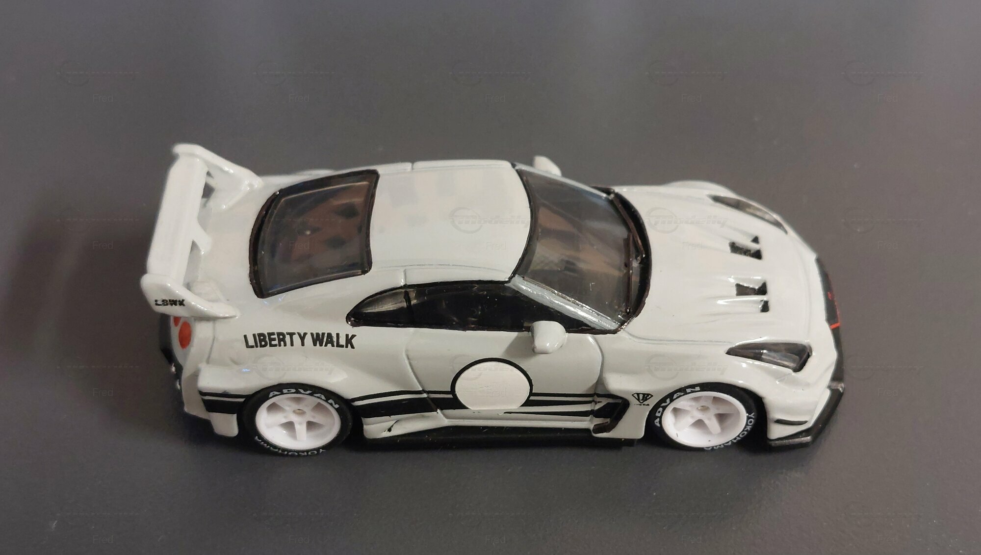 Für Sammler ist relevant, dass es sich erneut um ein Modellauto im 1:64‑Maßstab von Hot Wheels handelt, das nachträglich umgestaltet wurde. Der diecast‑Grundkörper verleiht Stabilität, während Anbauteile wie der große Heckflügel und der Frontsplitter aus Kunststoffteilen bestehen können, was dem Vorbild Nissan 35GT‑RR VER.2 optisch nahekommt. Die Linie des Breitbaus wird durch dunkle Stoßfängerabschlüsse, die schwarzen Splitterkanten und die weißen Räder gut herausgearbeitet. Auf den Bildern ist zu erkennen, dass die Spaltmaße der Anbauteile dem Maßstab entsprechend vereinheitlicht sind und die Karosserie bewusst sehr tief eingestellt wurde, wodurch die Silhouette der LB‑Silhouette Works‑Komponenten betont wird. Die Frontscheinwerfer sind als Klareinsätze dargestellt, die Heckleuchten sind rot abgesetzt. Die Gestaltung der Reifenflanken mit „ADVAN“‑Schriftzügen setzt eine weitere inhaltliche Referenz an die Track‑Ausrichtung vieler Umbauten des Nissan 35GT‑RR VER.2. Die Lackierung ist überwiegend in einem hellen, leicht warmen Grauton ausgeführt; Streifen und Logos sind sauber platziert. Sammler, die mit anderen Modellen im gleichen Maßstab kombinieren, finden hier eine passende Basis für Dioramen mit Werkstatt‑ oder Track‑Thema. Bitte beachten: Da dies ein kundenseitig modifiziertes Exemplar ist, können Farbton, Decals, Tieferlegung und Räder vom regulären Serienstand eines Hot Wheels‑Produkts abweichen und sind als individuelle Gestaltung von Fred zu verstehen.