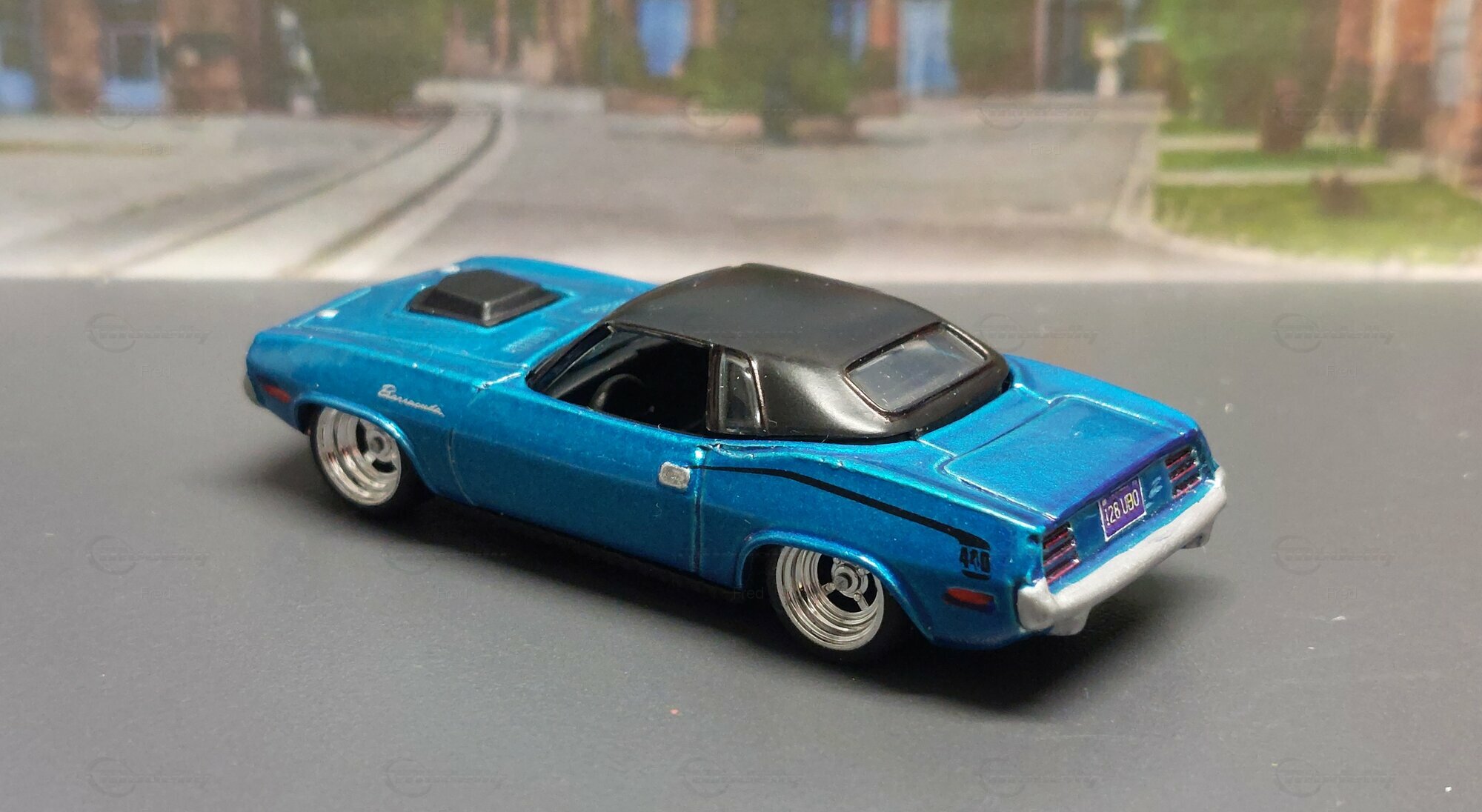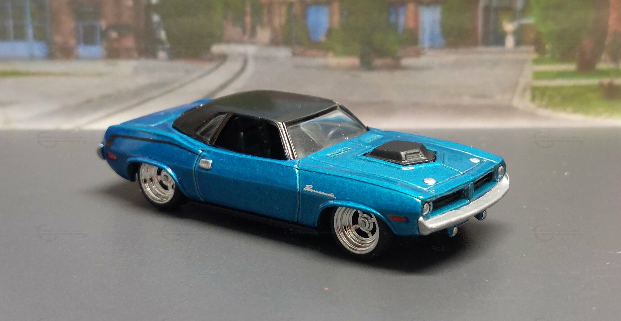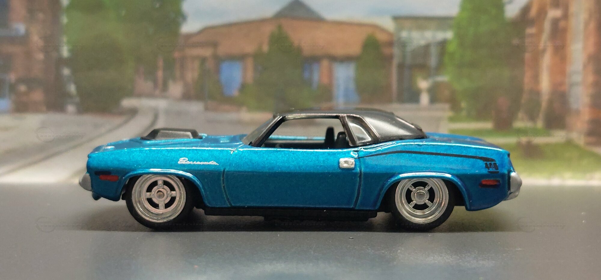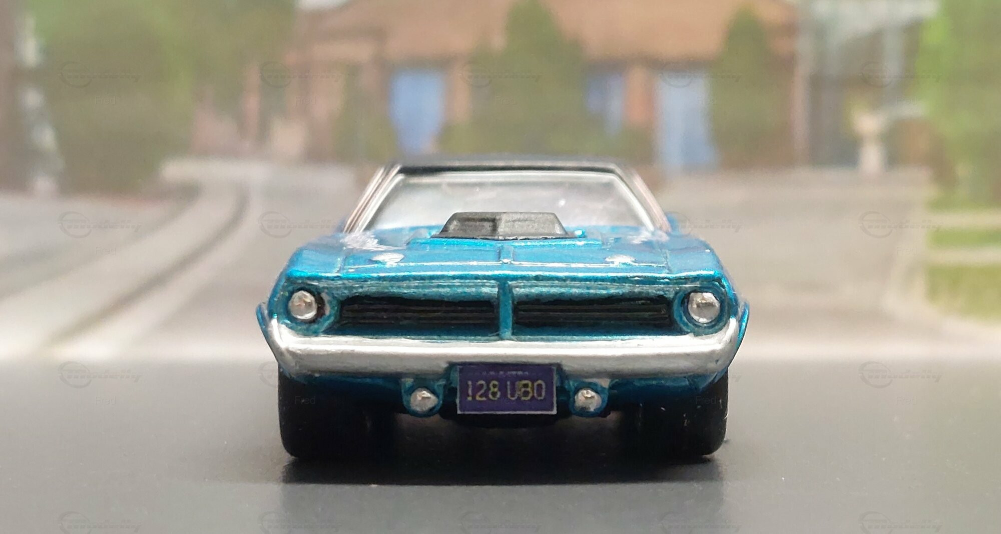 Die hier gezeigte Miniatur des Plymouth Barracuda 440, die im 1:64-Maßstab von Hot Wheels hergestellt wurde, ist ein wunderbares Sammlerstück für Miniaturenliebhaber. Dieses Modellauto ist aus dem Material Diecast gefertigt, was für seine Langlebigkeit und die präzisen Details bekannt ist. Diese Nachbildung des Barracuda besticht durch ihre leuchtend blaue Metallic-Lackierung und das schwarze Dach, das der Originalkarosserie des echten Fahrzeugs nachempfunden ist. Auf den Fotos, die im Besitz des Modelly Mitglieds Fred sind, sind die liebevoll gestalteten Details des Fahrzeugs klar zu erkennen. Die Miniatur zeigt die charakteristischen Linien und Formen des Barracuda, einschließlich der markanten Frontpartie und der sportlichen Kotflügelverbreiterungen.