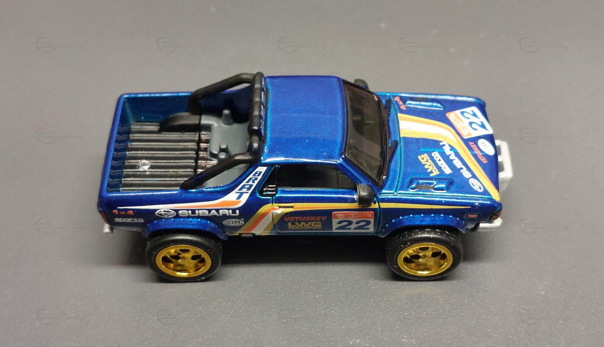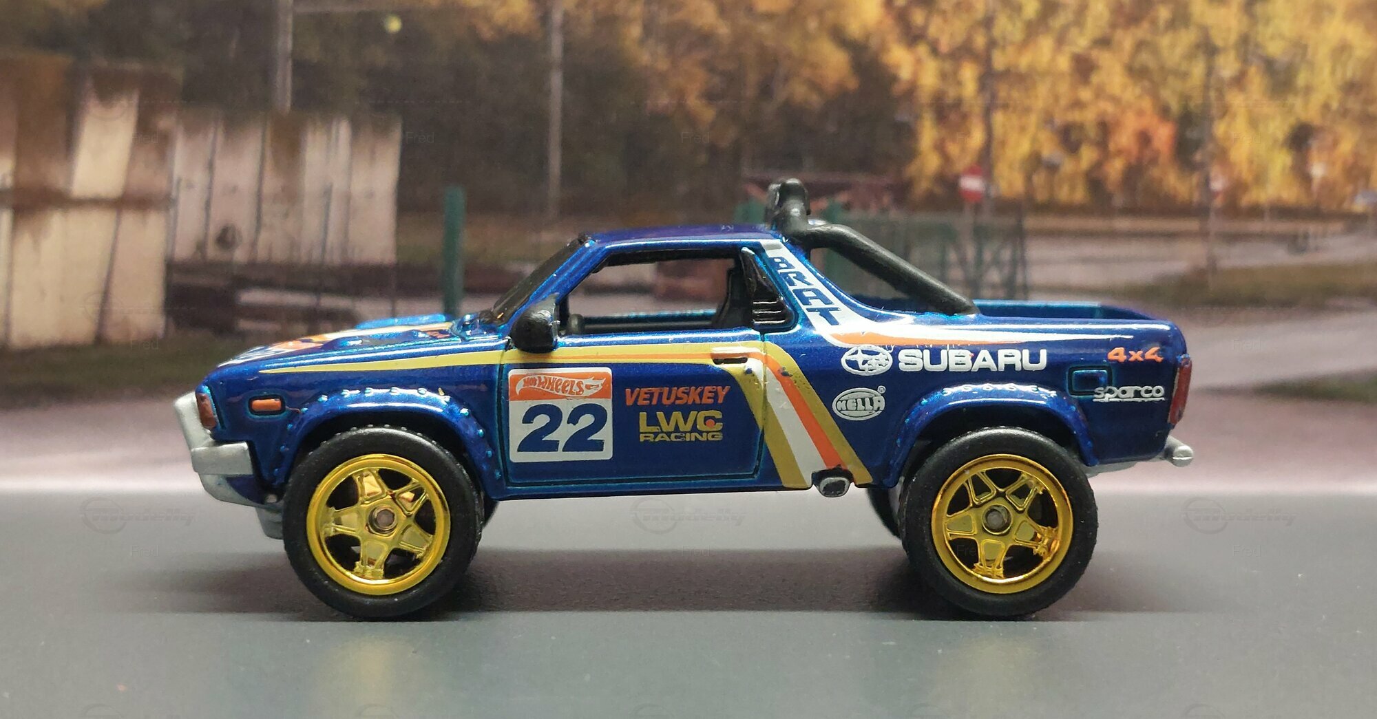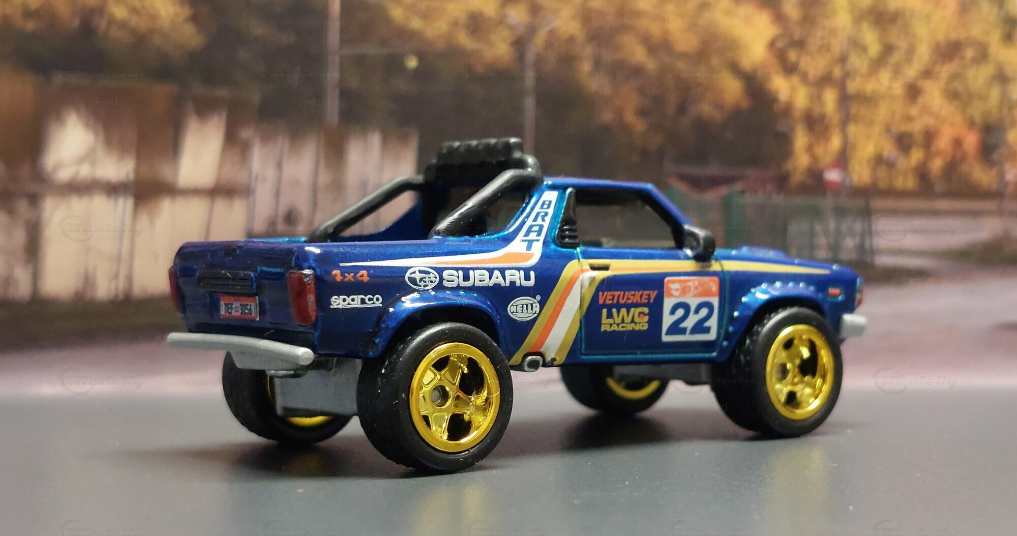 Das gezeigte 1:64 Modell des Subaru BRAT wurde von Hot Wheels hergestellt und zeigt die ikonischen Merkmale des Originals auf beeindruckende Weise. Der Maßstab 1:64 gibt detaillierte Einblicke in das Fahrzeugdesign und lässt Sammler in die Miniaturwelt der Diecast-Modelle eintauchen. Das Modell ist vollständig aus Diecast-Material gefertigt, was zu einer robusten und langlebigen Konstruktion führt. Ein auffälliges Merkmal dieses Modells ist das blau-glänzende Finish, das mit verschiedenen Rennsport-Beklebungen und einem Nummernschild versehen ist.