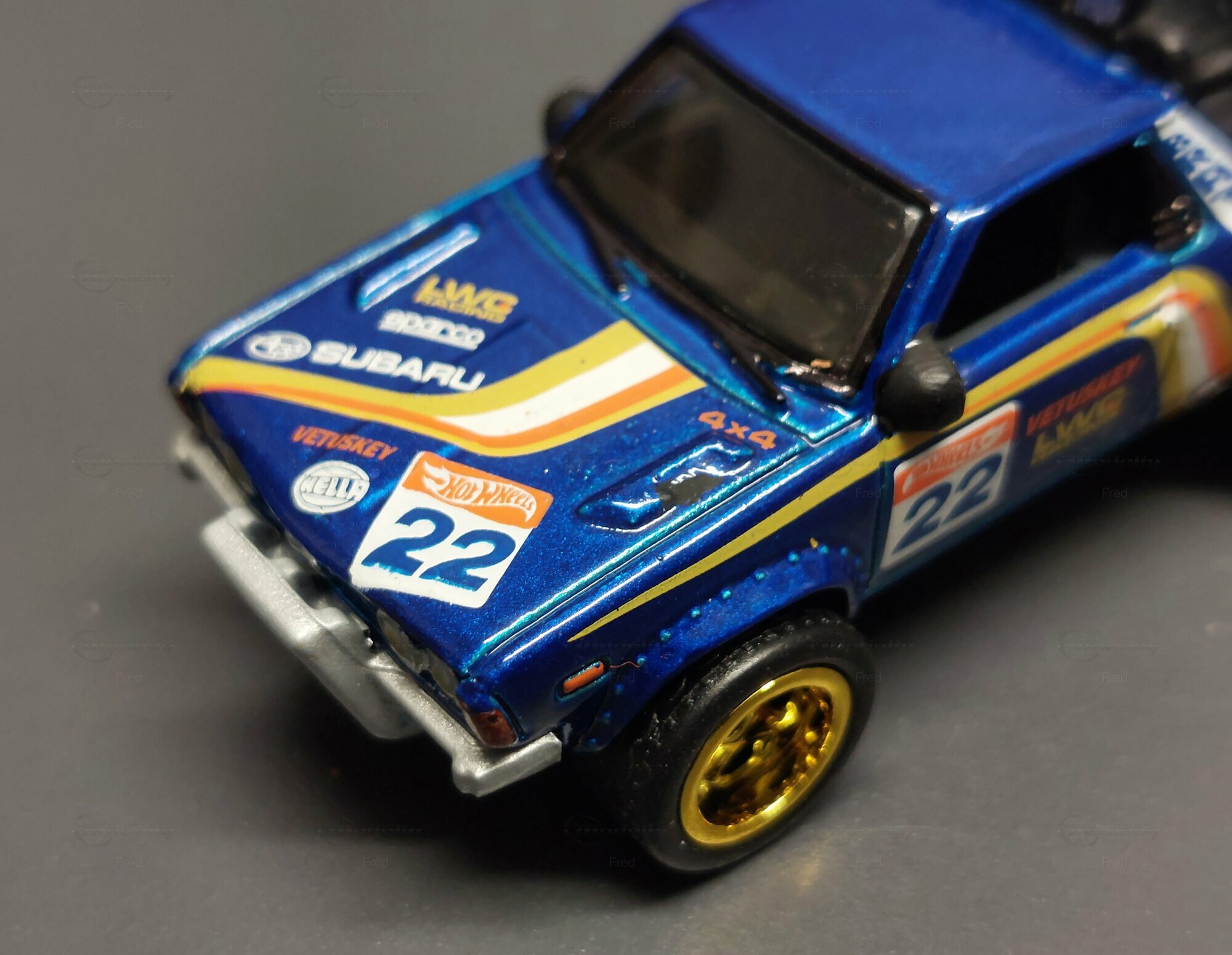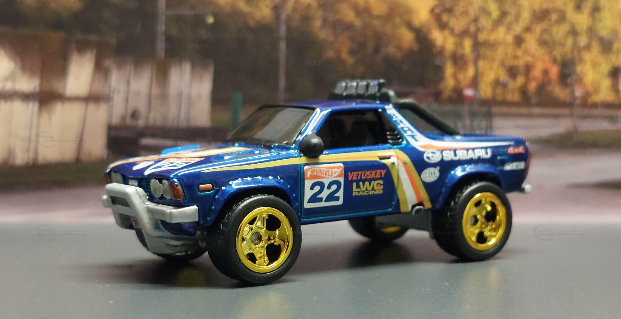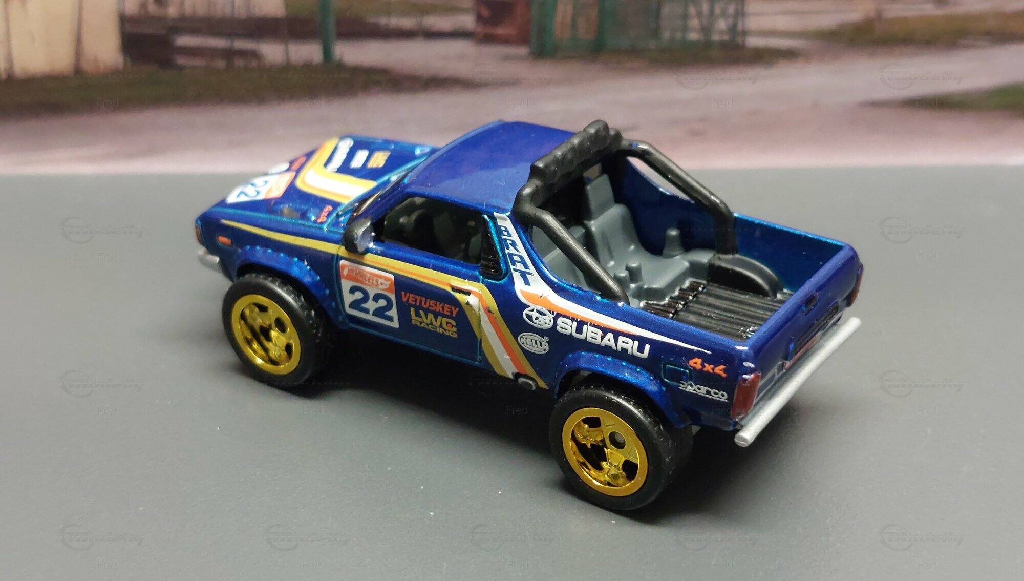Das gezeigte 1:64 Modell des Subaru BRAT wurde von Hot Wheels hergestellt und zeigt die ikonischen Merkmale des Originals auf beeindruckende Weise. Der Maßstab 1:64 gibt detaillierte Einblicke in das Fahrzeugdesign und lässt Sammler in die Miniaturwelt der Diecast-Modelle eintauchen. Das Modell ist vollständig aus Diecast-Material gefertigt, was zu einer robusten und langlebigen Konstruktion führt. Ein auffälliges Merkmal dieses Modells ist das blau-glänzende Finish, das mit verschiedenen Rennsport-Beklebungen und einem Nummernschild versehen ist.