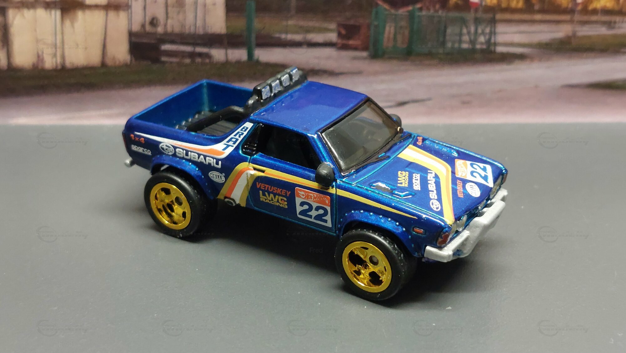 Die dargestellten Felgen können auf den ersten Blick nicht eindeutig identifiziert werden. Sie fügen sich jedoch nahtlos in das sportliche Gesamtbild dieses Modellfahrzeugs ein. Zusätzlich finden sich auf der Frontstoßstange auffällige Rallye-Lichter, die den abenteuerlichen Charakter des Subaru BRAT betonen. Fred, ein Mitglied bei Modelly, hat dieses Modell in seine Sammlung aufgenommen, und es dient als prächtiges Beispiel für die Detailtreue, die Hot Wheels in seine Modelle steckt.