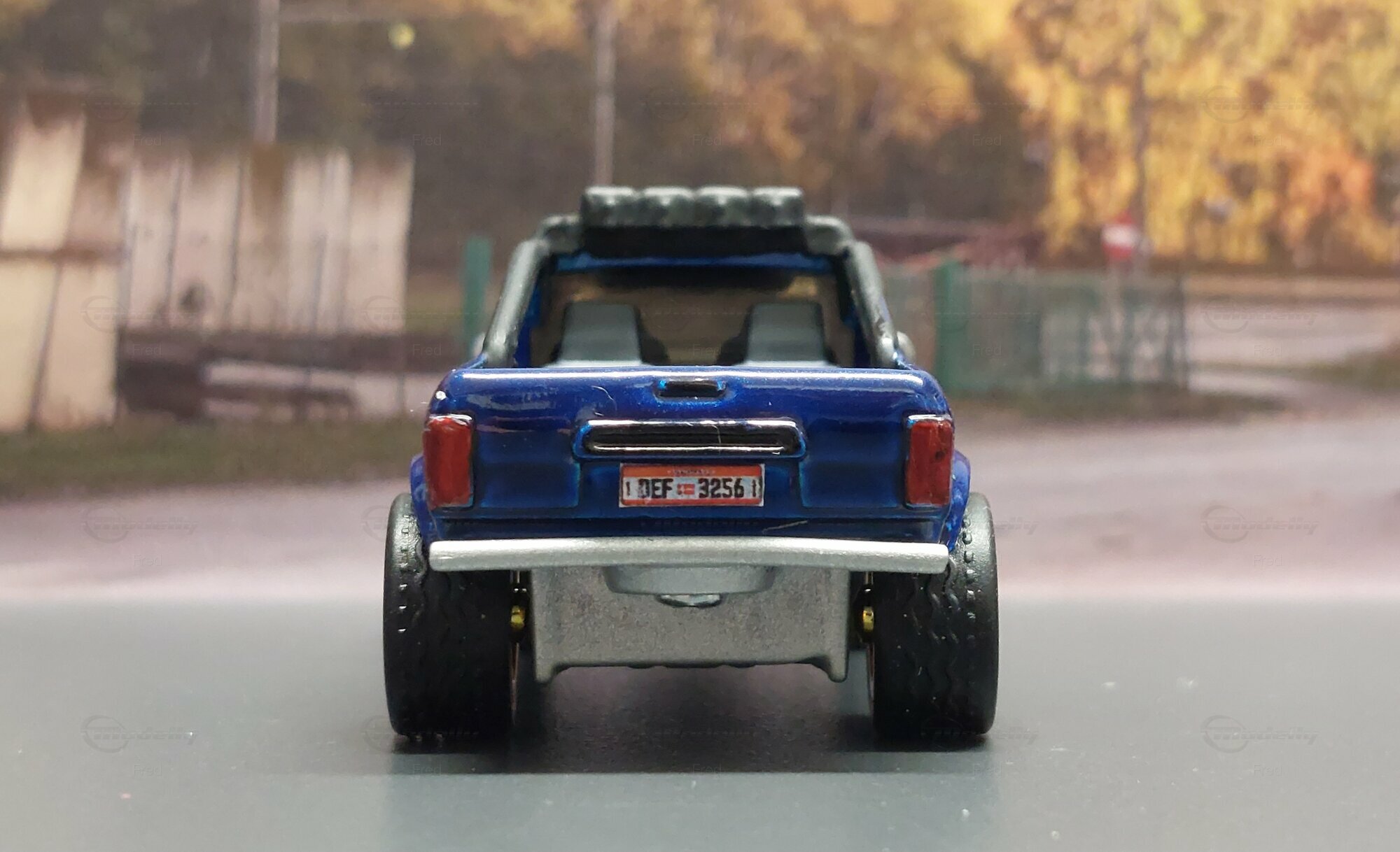 Die Schönheit des 1:64 Modells von Hot Wheels liegt in den feinen Details, die die Essenz des Subaru BRAT perfekt einfangen. Die glitzernde blaue Lackierung ist mit weißen und orangefarbenen Streifen verziert, was dem Modell eine rennsportliche Note verleiht. Die Frontansicht zeigt eine kompakte, aber robuste Erscheinung mit einer verchromten Stoßstange und vier Scheinwerfern, die dem Fahrzeug ein markantes Antlitz verleihen. Die Dachtraverse mit Zusatzscheinwerfern unterstreicht seine Eignung als Offroad-Fahrzeug. Diese kleinen Akzente zeigen, wie präzise und detailverliebt die Arbeit an diesen Modellen ist, die in den Regalen von Sammlern weltweit zu finden sind.