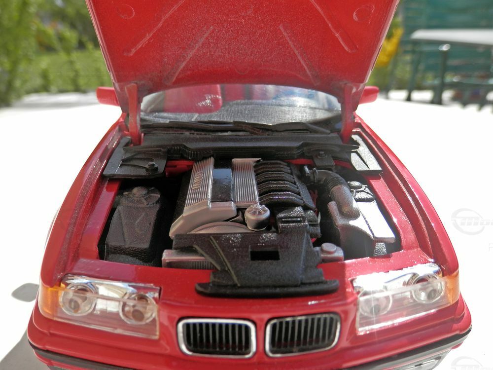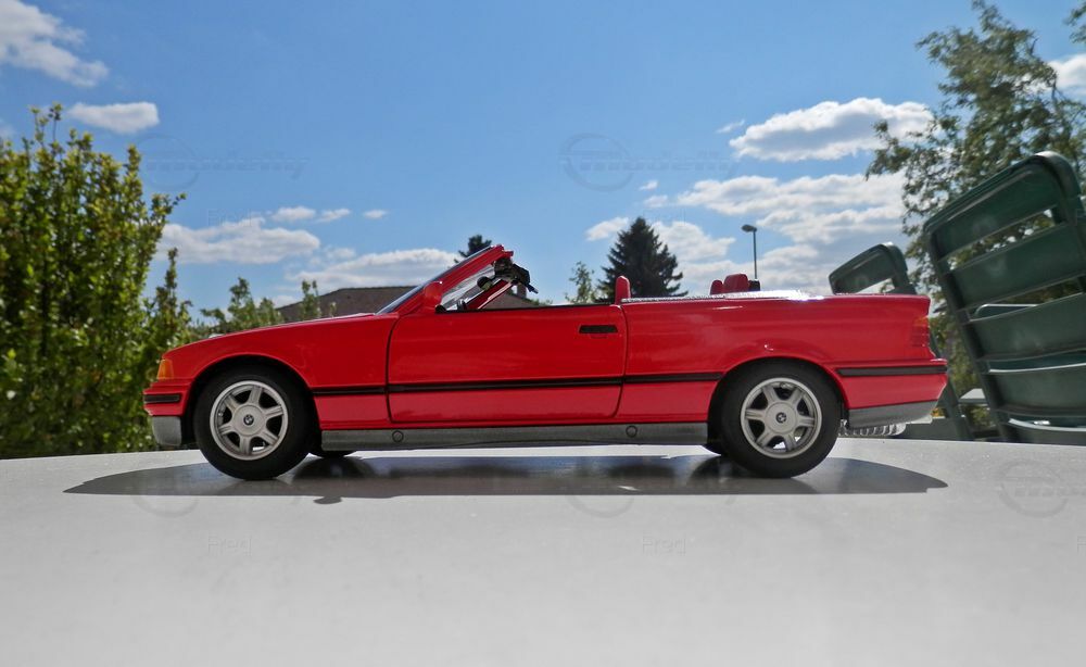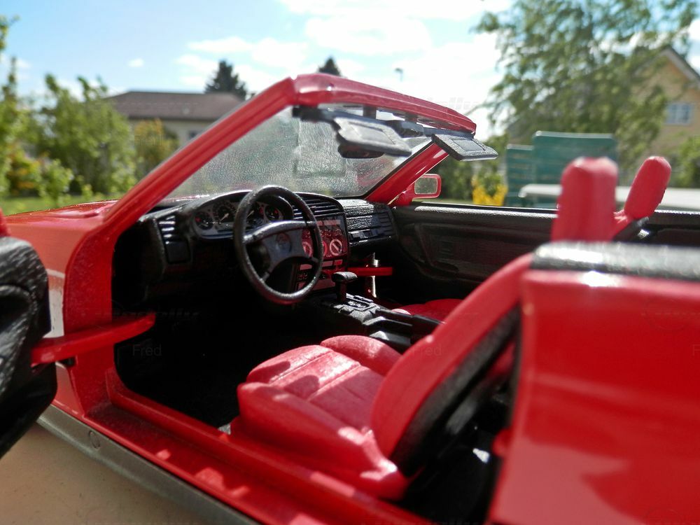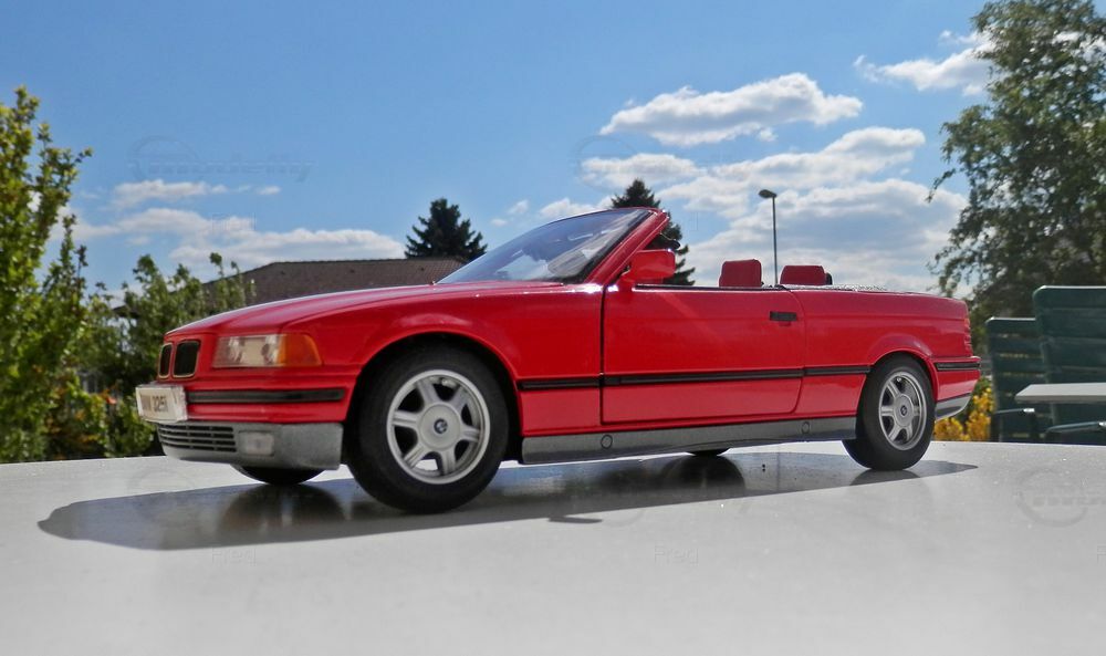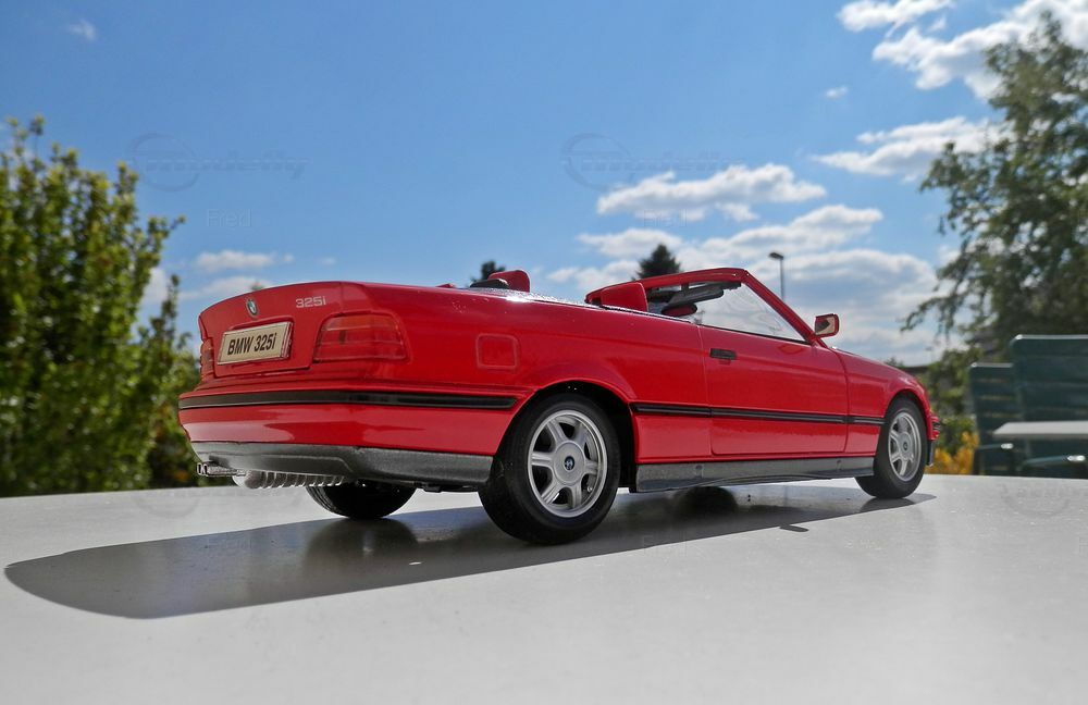 Für Sammler von Modellautos ist das BMW 325i Cabrio E36 im Maßstab 1:18 ein besonderes Highlight. Das Modell, aus der Sammlung des Modelly-Mitglieds 'Fred', besticht durch eine präzise Nachbildung des Originals. Die rote Lackierung ist korrekt umgesetzt, inklusive der typischen schwarzen Akzente an den Seitenlinien und Stoßfängern. Das Modell ist mit Original-Rädern ausgestattet, die das authentische Erscheinungsbild des BMW noch unterstreichen.