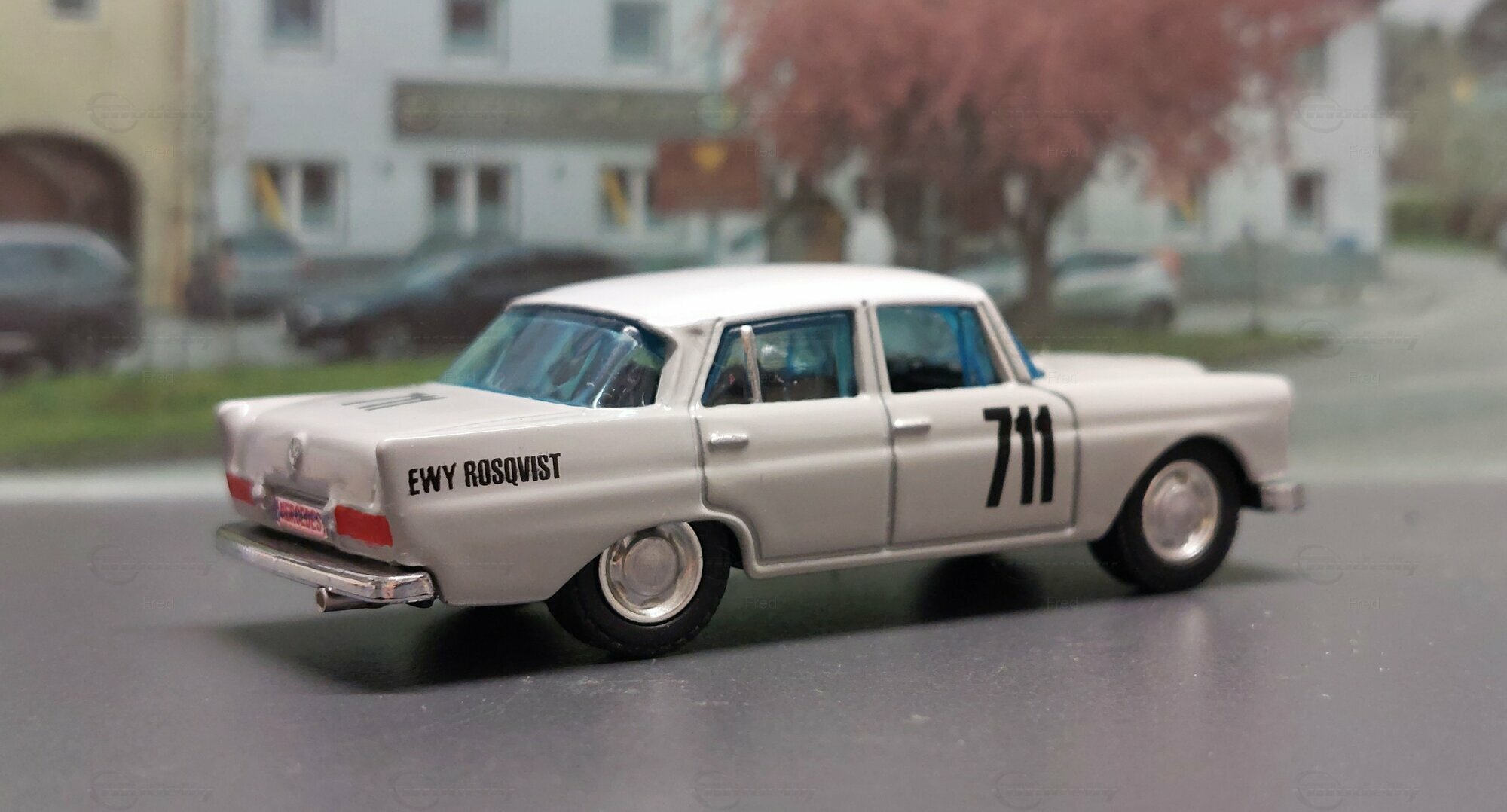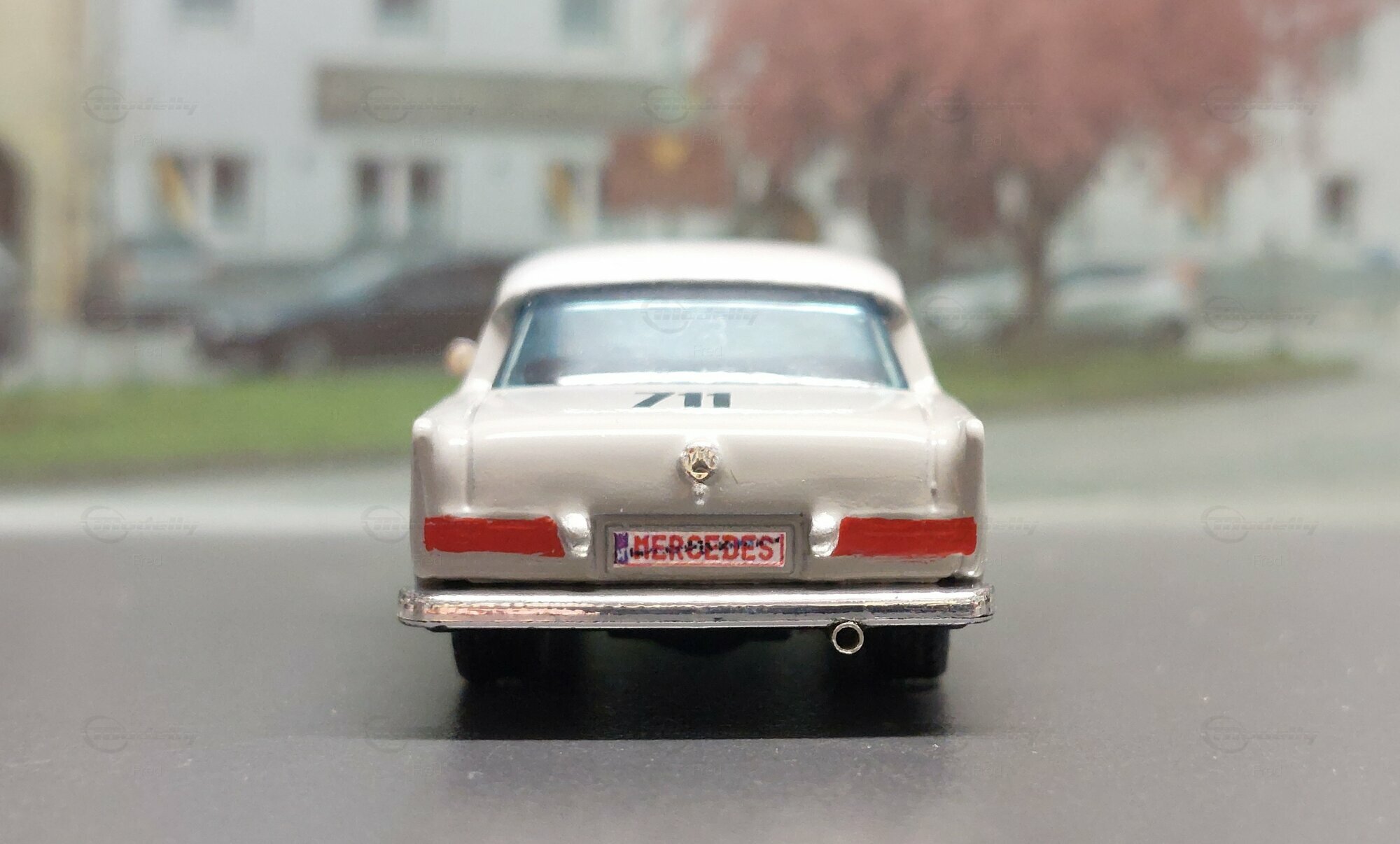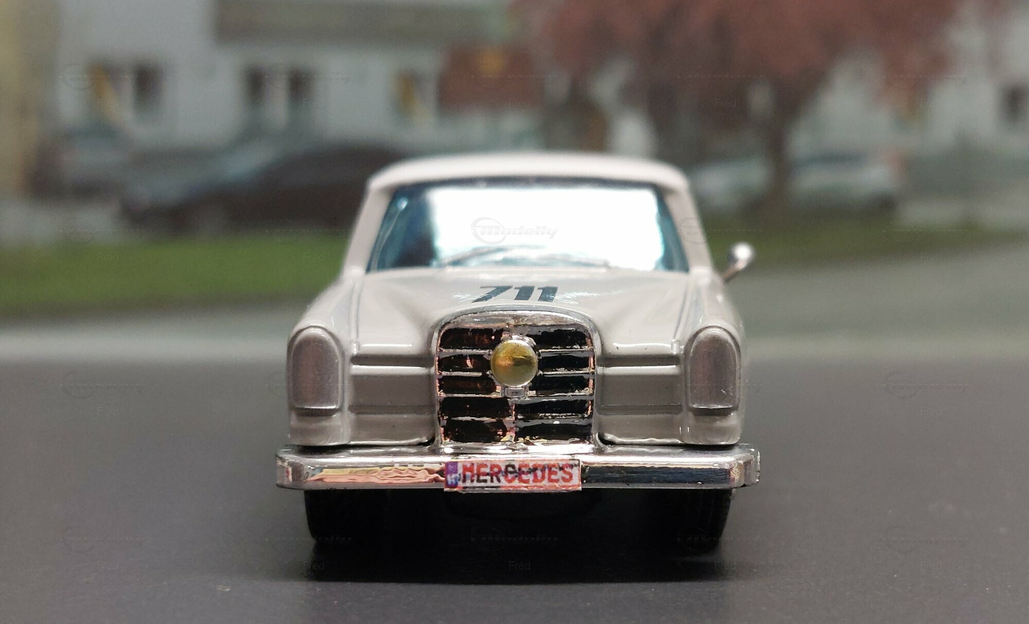 Das vorliegende Modell von Matchbox ist im Material Diecast gefertigt und stellt eine modifizierte Version des Originals dar. Es repräsentiert nicht das standardmäßig hergestellte Produkt des Herstellers. Erkennbar ist dies an den aufwendigen Details und der Beschriftung „Ewy Rosqvist“ an beiden Seiten des Modells, was auf die berühmte Rennfahrerin verweist. Die Nummer „711“ auf den Türen deutet auf ein konkretes Rennen oder eine Rallye-Teilnahme hin. Ferner ist das Modell in einem schlichten Grau lackiert und weist eine präzise Nachbildung des ikonischen Kühlergrills und der klassischen Mercedes-Scheinwerfer auf.