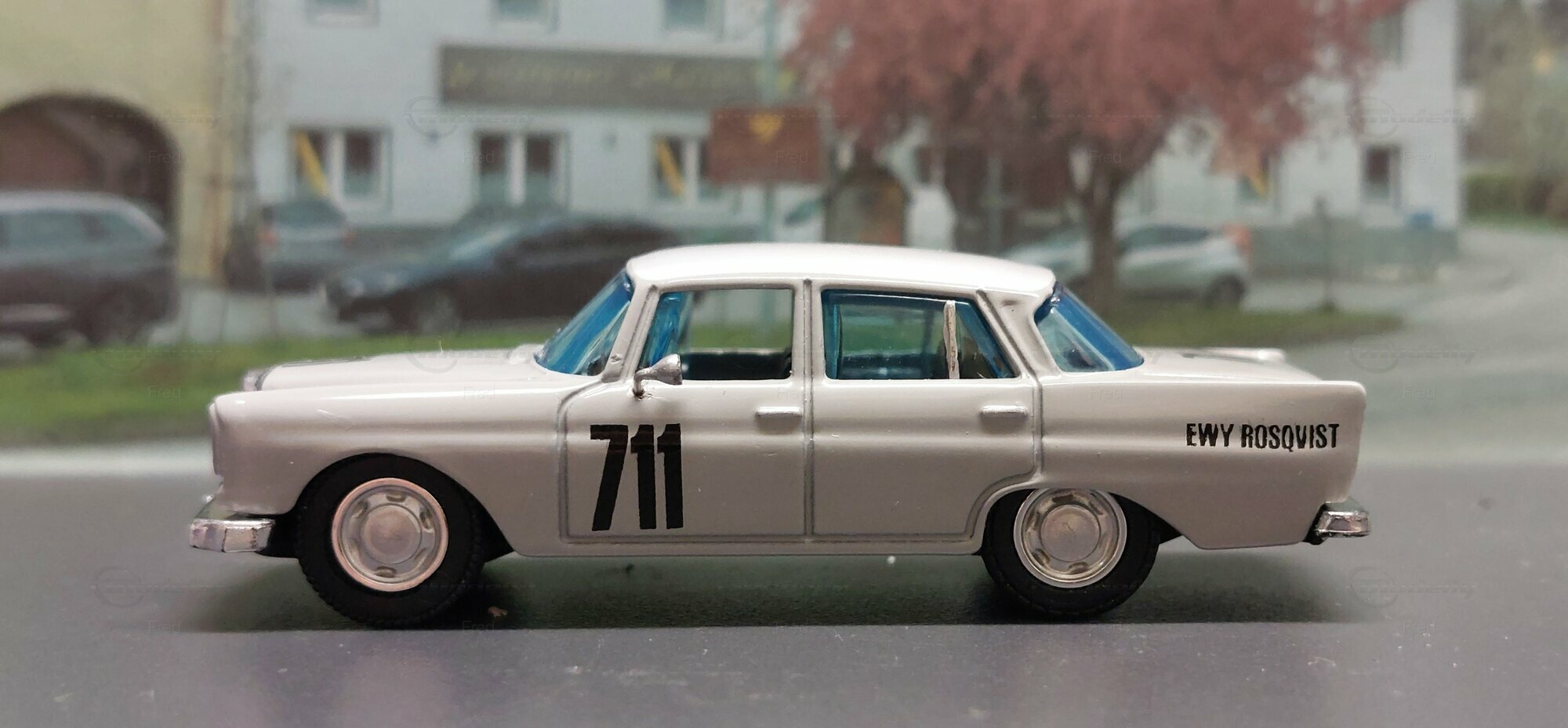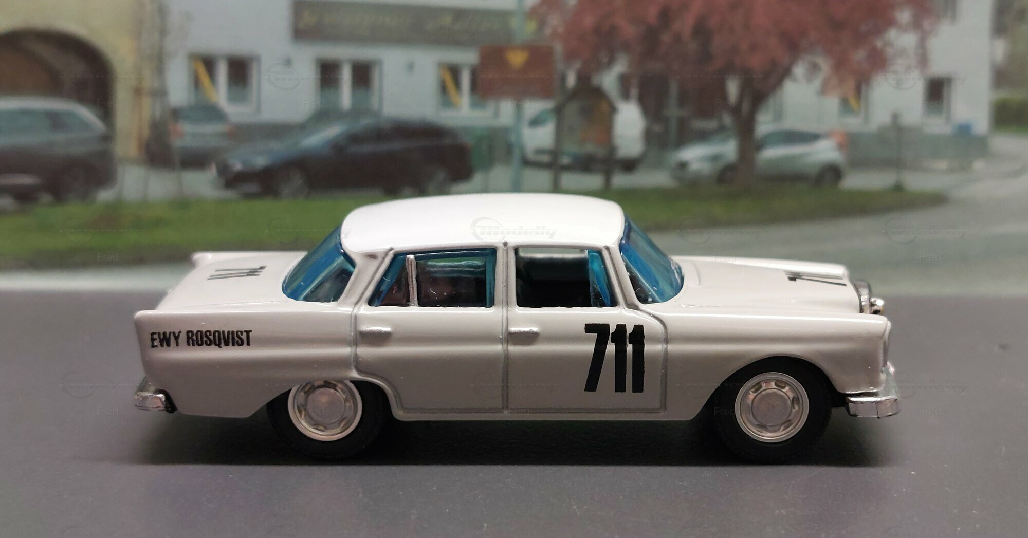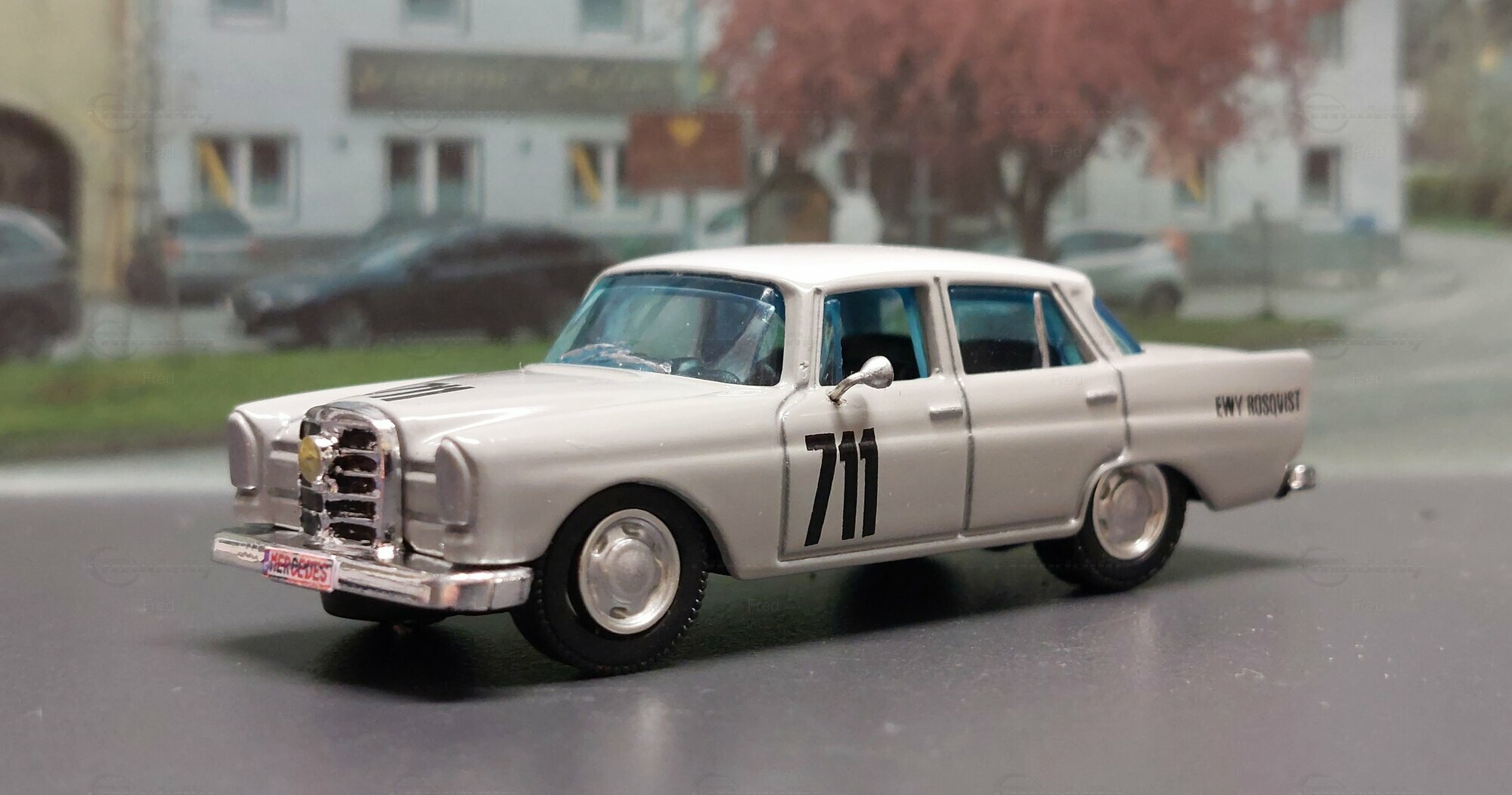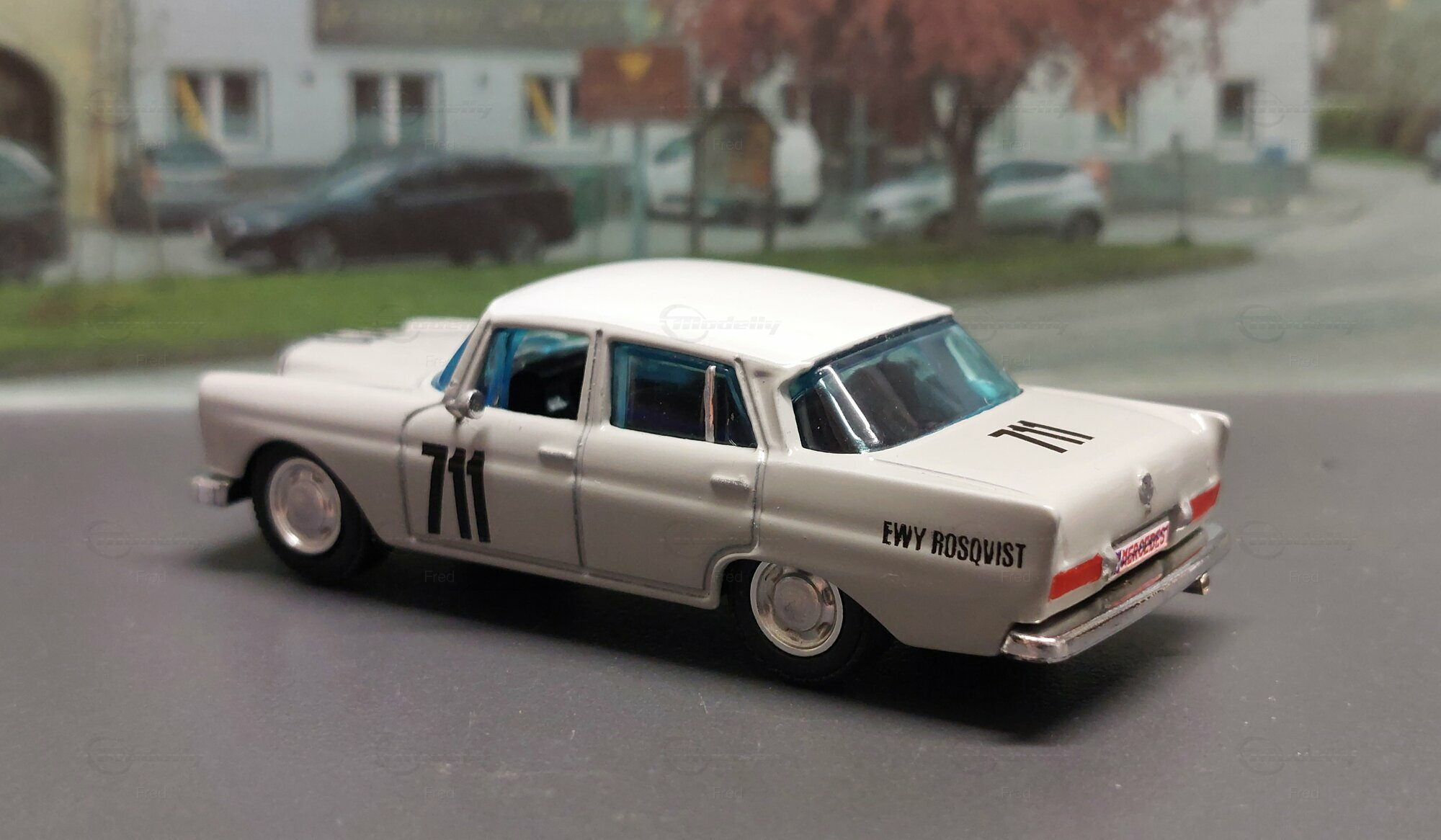 Das vorliegende Modell von Matchbox ist im Material Diecast gefertigt und stellt eine modifizierte Version des Originals dar. Es repräsentiert nicht das standardmäßig hergestellte Produkt des Herstellers. Erkennbar ist dies an den aufwendigen Details und der Beschriftung „Ewy Rosqvist“ an beiden Seiten des Modells, was auf die berühmte Rennfahrerin verweist. Die Nummer „711“ auf den Türen deutet auf ein konkretes Rennen oder eine Rallye-Teilnahme hin. Ferner ist das Modell in einem schlichten Grau lackiert und weist eine präzise Nachbildung des ikonischen Kühlergrills und der klassischen Mercedes-Scheinwerfer auf.