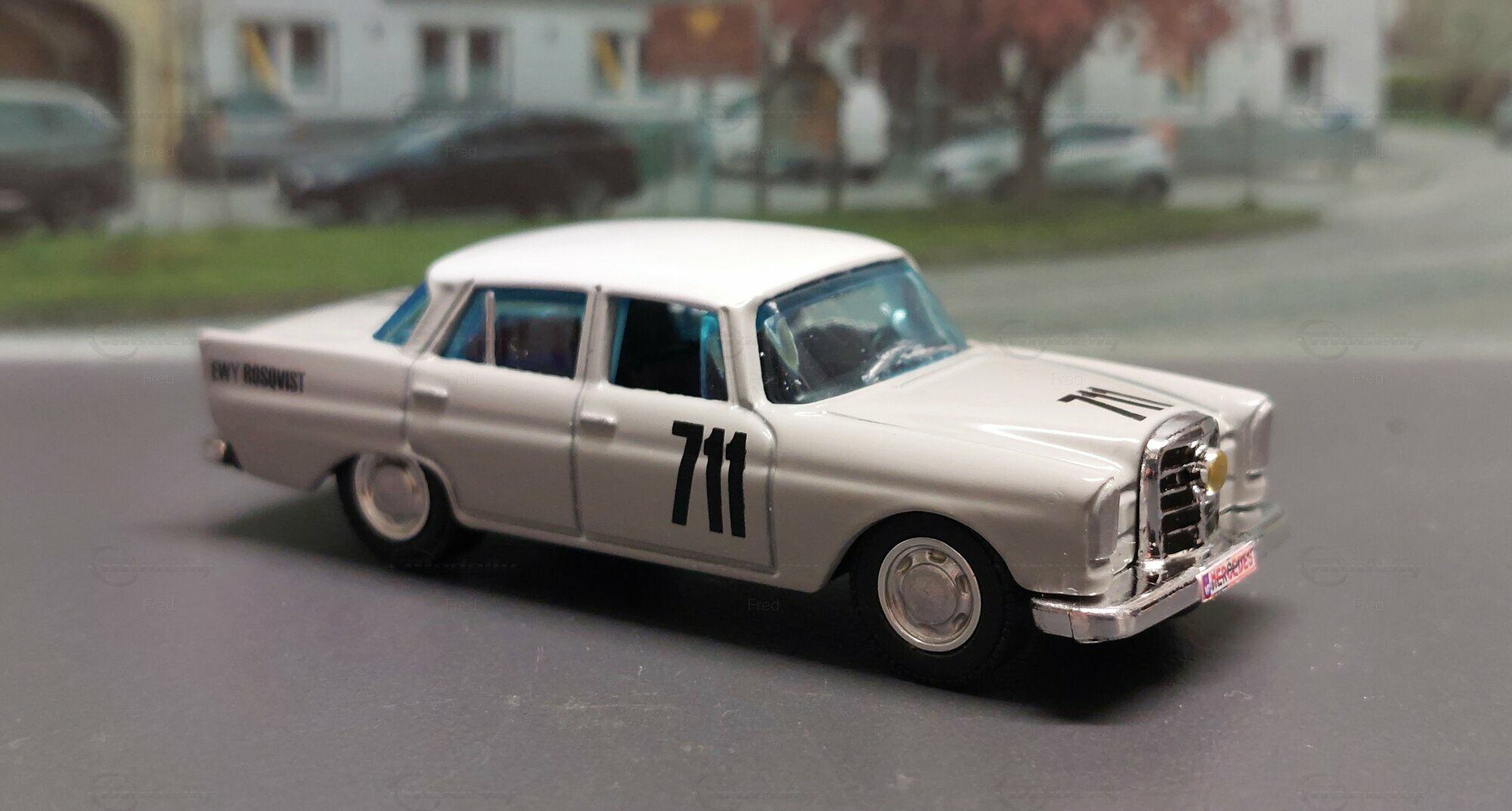 Das Modellauto ist Teil der Sammlung von Modelly-Mitglied Fred und ist ein bemerkenswertes Stück für Liebhaber klassischer Mercedes-Modelle. Es sticht durch seine originalgetreue Farbgebung und die Liebe zum Detail hervor, die für Matchbox typisch ist. Auffällig ist der Schriftzug "Mercedes" an der Front und die spezielle Lackierung, die man oft an legendären Rallyefahrzeugen sieht. Das Modell ist ein wertvolles Sammlerstück insbesondere wegen seiner historischen Relevanz und der speziellen Anpassungen, die die motorsportliche Geschichte und Erfolge von Ewy Rosqvist reflektieren.