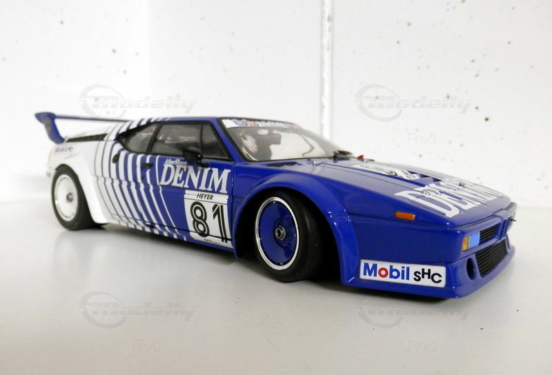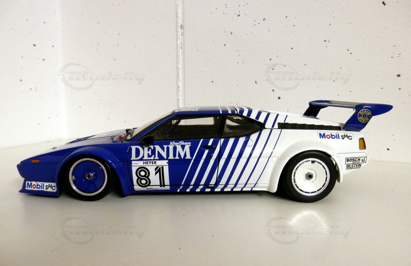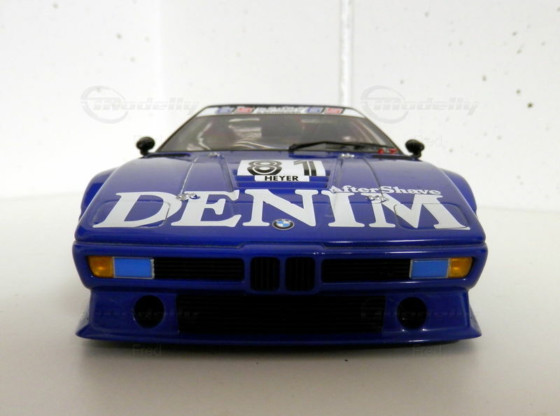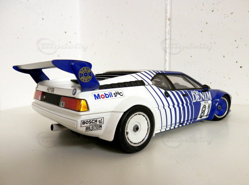 Eines der markantesten Merkmale des BMW M1 Procar Denim war seine auffällige Lackierung. Diese ikonische Lackierung bestand aus einem markanten Blau-Weiß-Muster mit Sponsorenlogos von Denim, Mobil SHC, Bosch und Bilstein, die prominent auf dem Fahrzeug platziert waren. Auf den Fotos von Modellys Mitglied "Fred" kann man diese Details gut erkennen. Besonders auffällig sind die großen Logos von Denim an den Seiten des Fahrzeugs sowie das Logo auf der Motorhaube. Die weißen Räder und der große Heckspoiler runden das Design ab und verleihen dem Fahrzeug eine noch dynamischere und sportlichere Optik. Diese Merkmale machen den BMW M1 Procar nicht nur zu einem Rennwagen, sondern auch zu einem Stück Rennsportgeschichte.