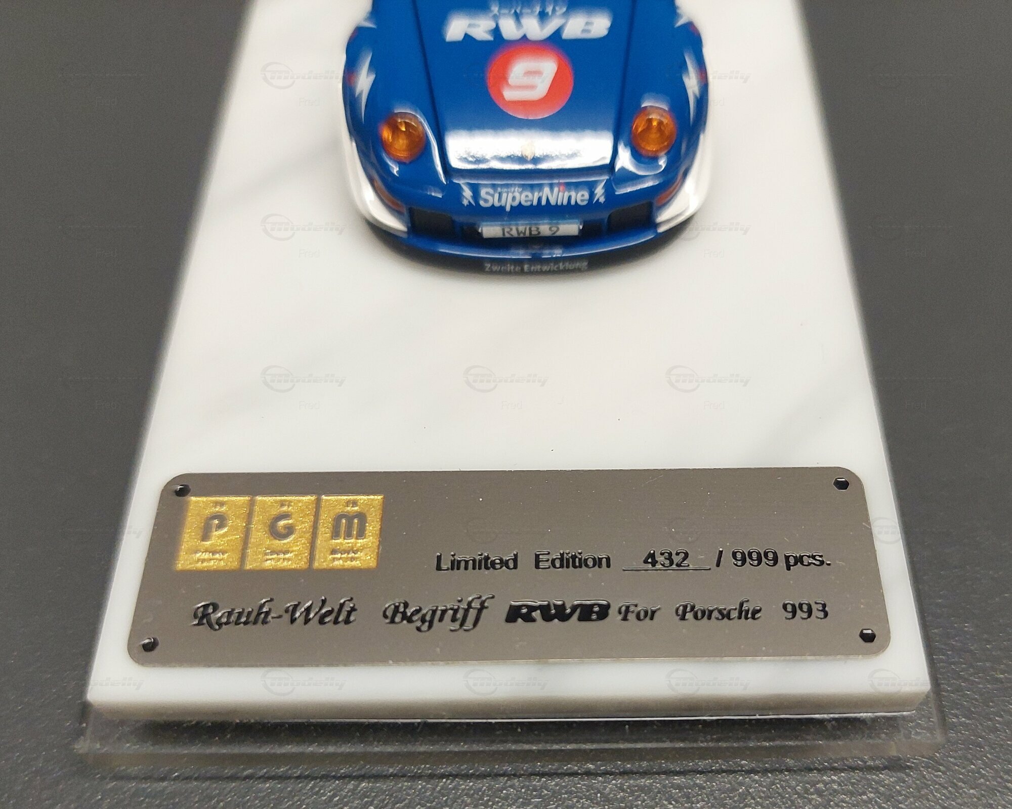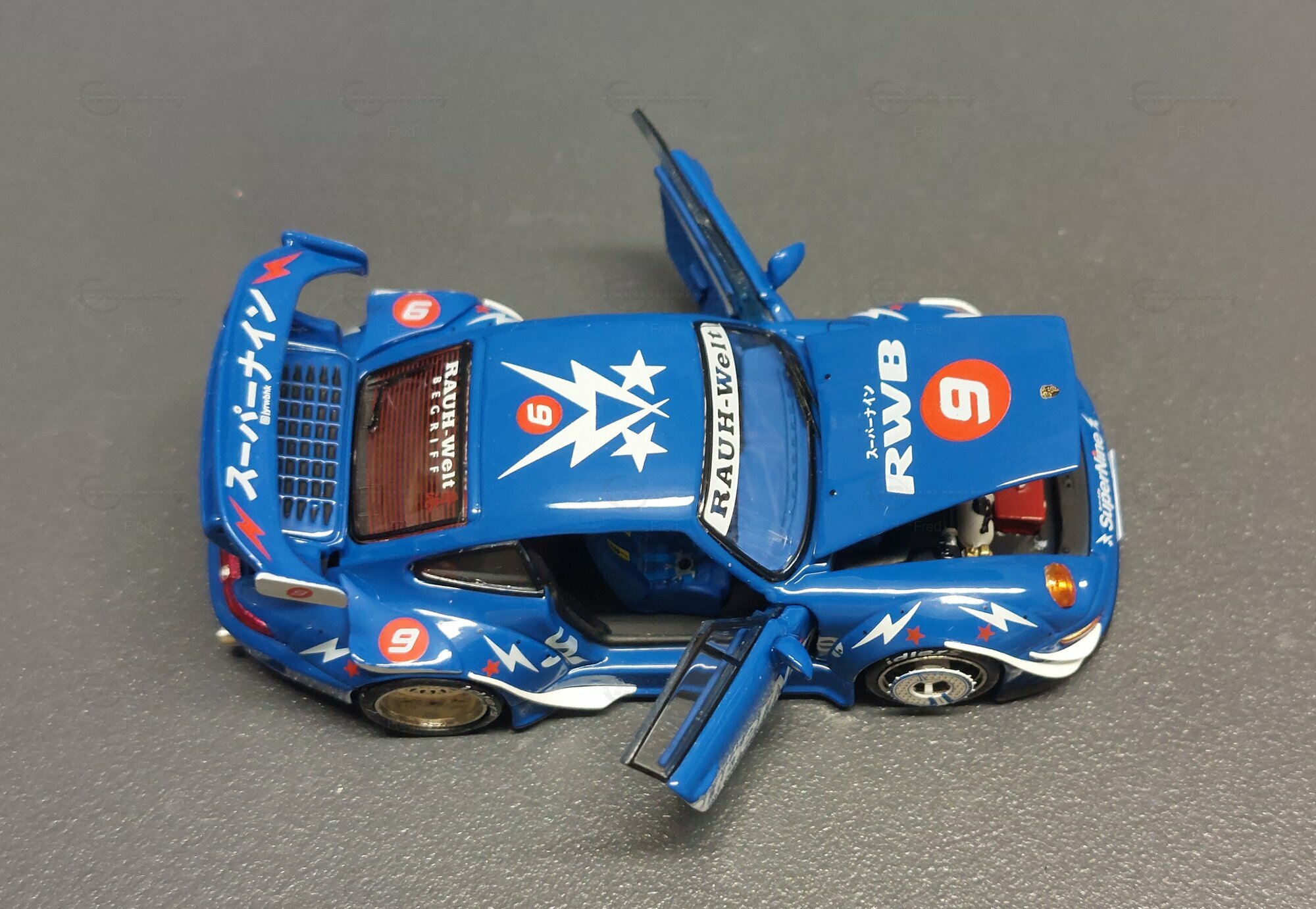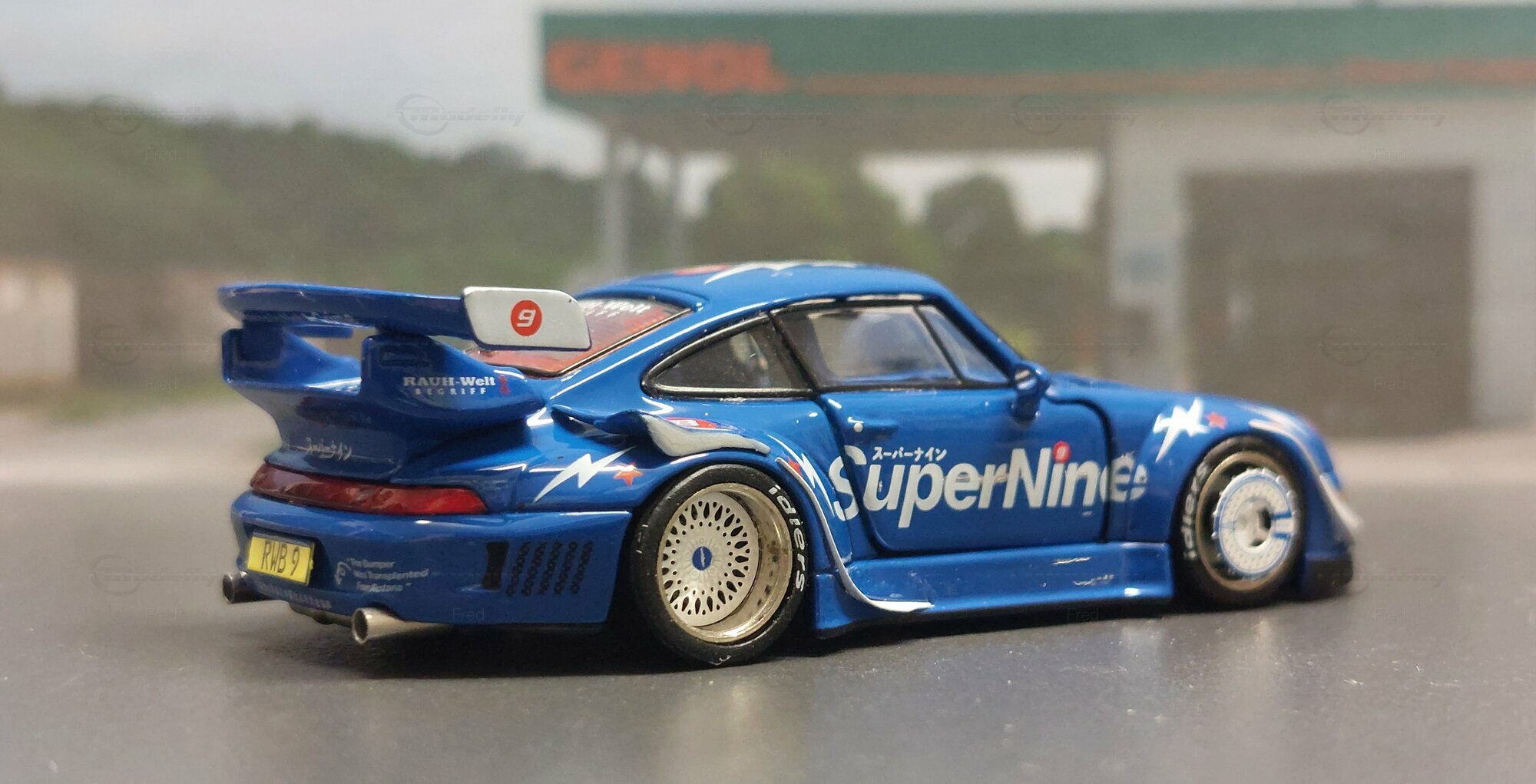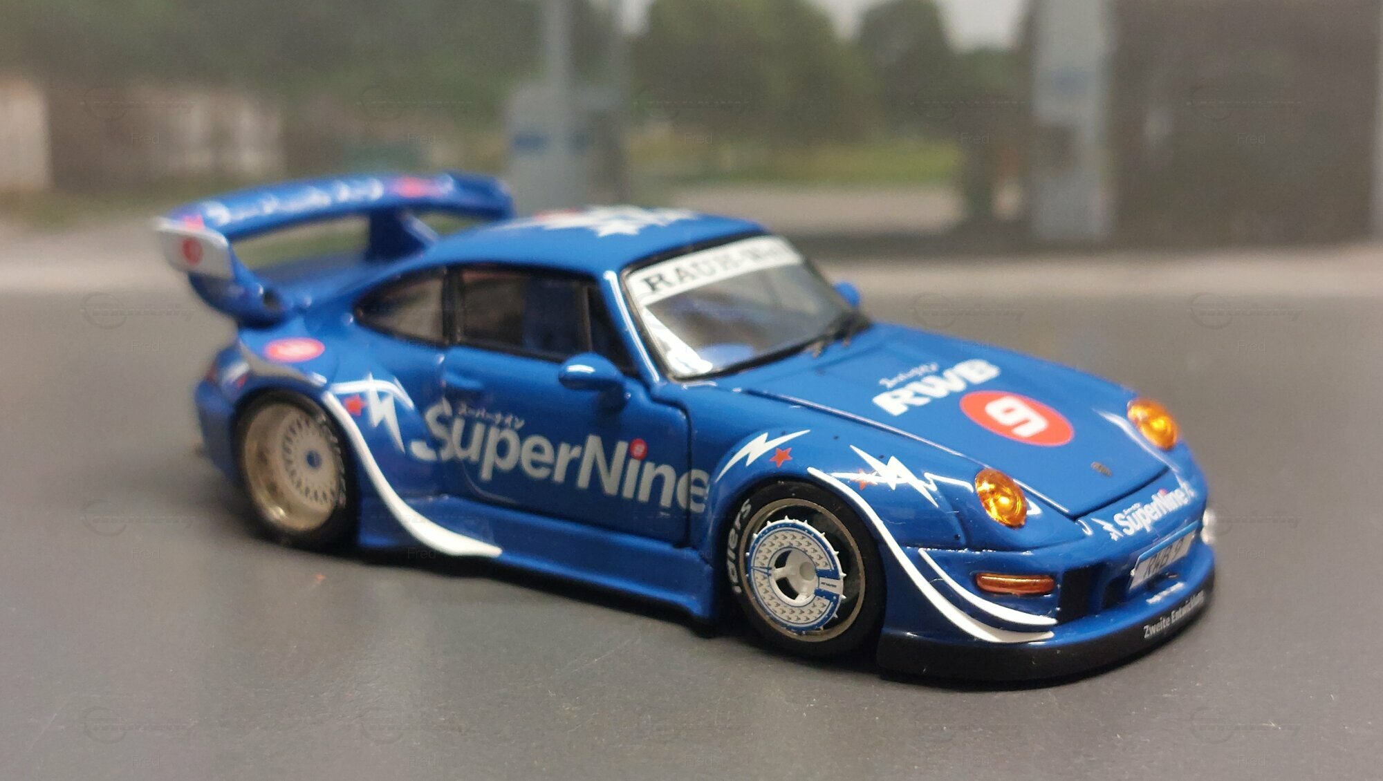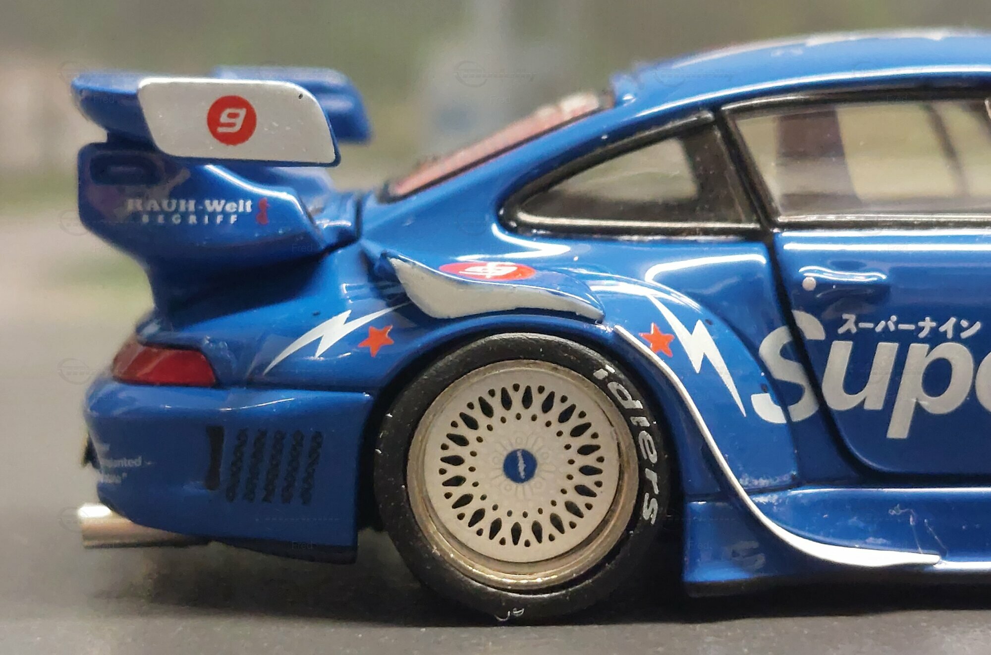 Die Details des Modells von Peako im Maßstab 1:64 sind beeindruckend - von den markanten „RAUH-Welt“ Schriftzügen auf der Windschutzscheibe bis hin zur präzise dargestellten Lackierung in einem kräftigen Blau mit weißen Akzenten und Sternengrafiken. Die Räder vom Typ BBS ergänzen das aggressive Aussehen perfekt. Die seltene Farbgebung und die sorgfältig reproduzierten Details machen diese Miniatur zu einem wertvollen Schaustück. Die limitierte Auflage von 999 Stück weltweit verstärkt den Reiz dieses Modells und macht es zu einem begehrten Sammlerstück. Ein wahres Schmuckstück für jeden Modellauto-Enthusiasten, der einen Hauch des legendären Porsche 911 (993) RWB Super Nine in seiner Sammlung haben möchten.