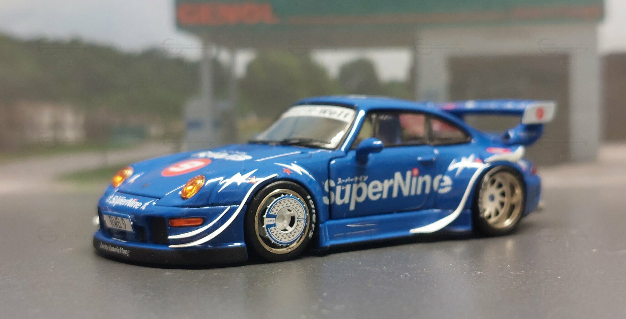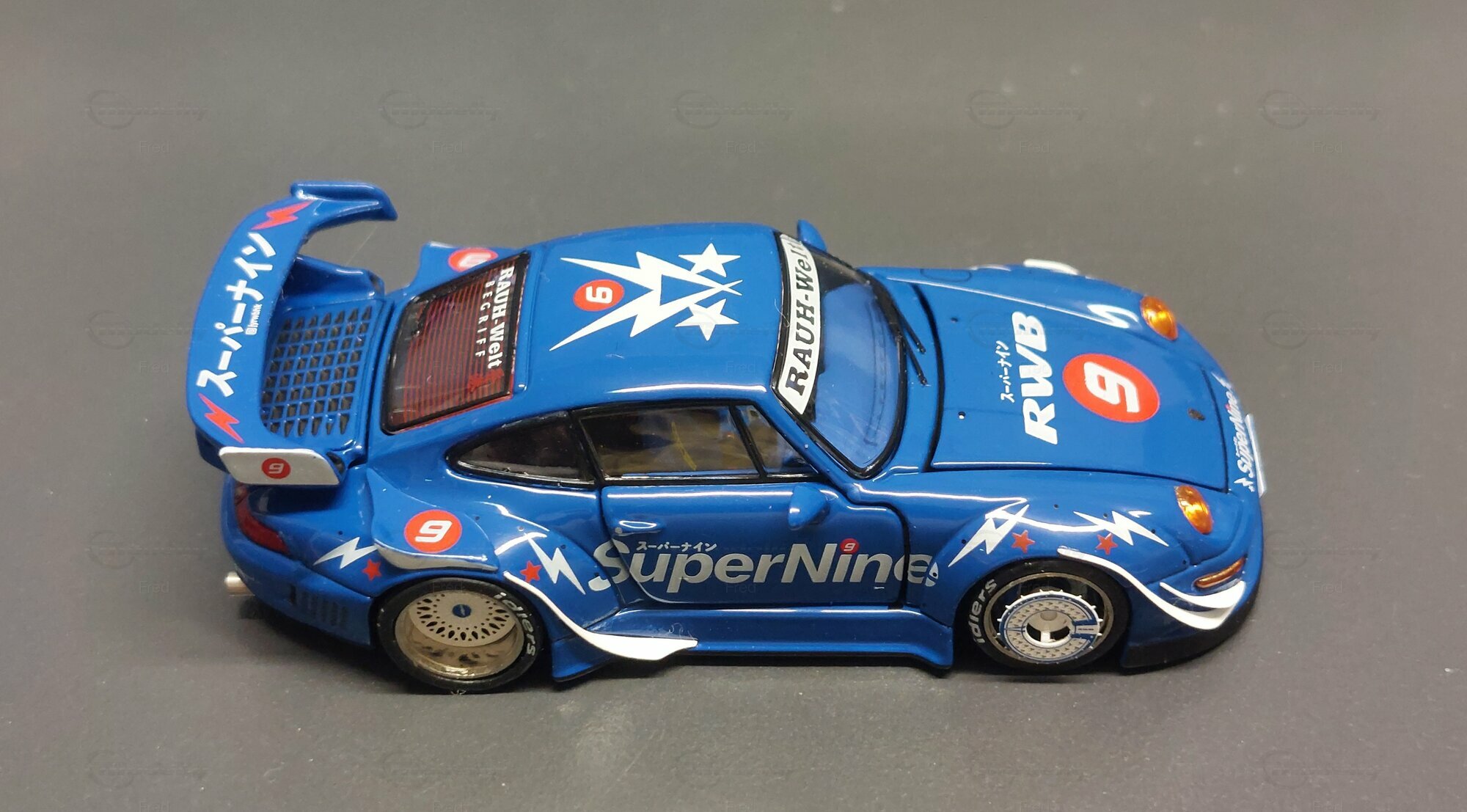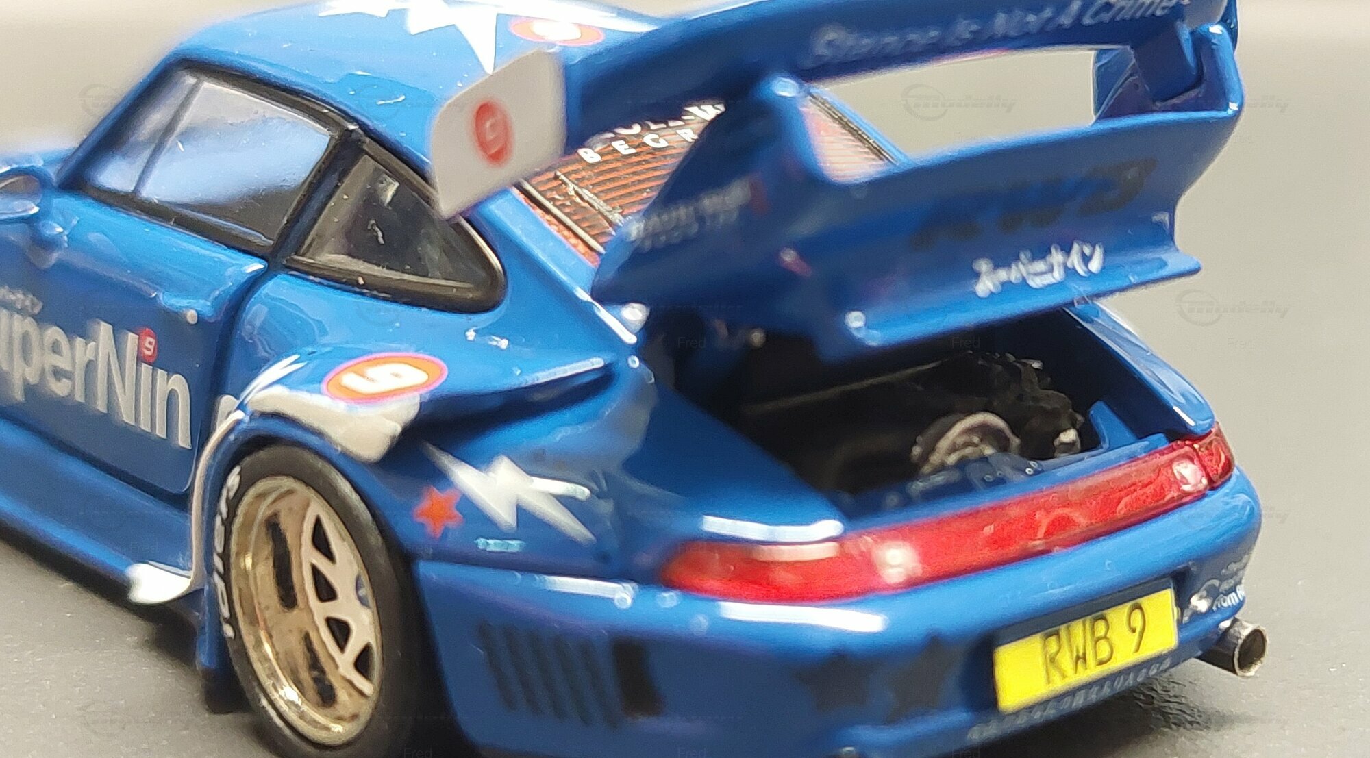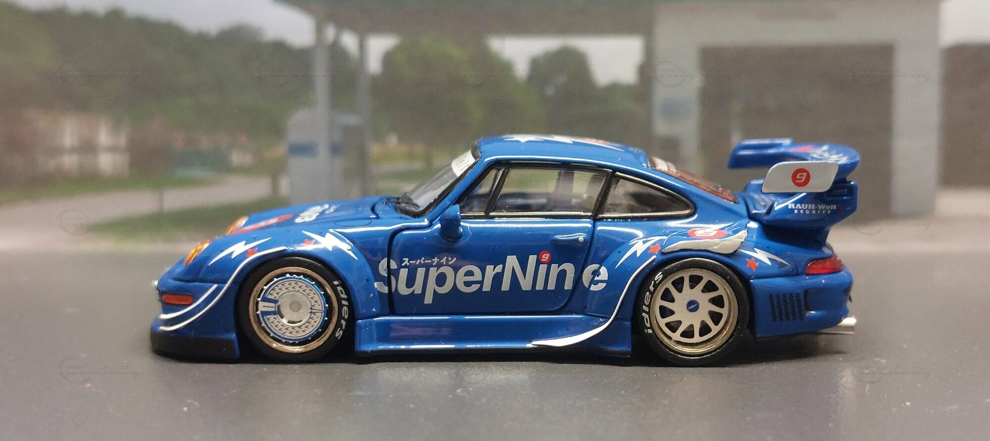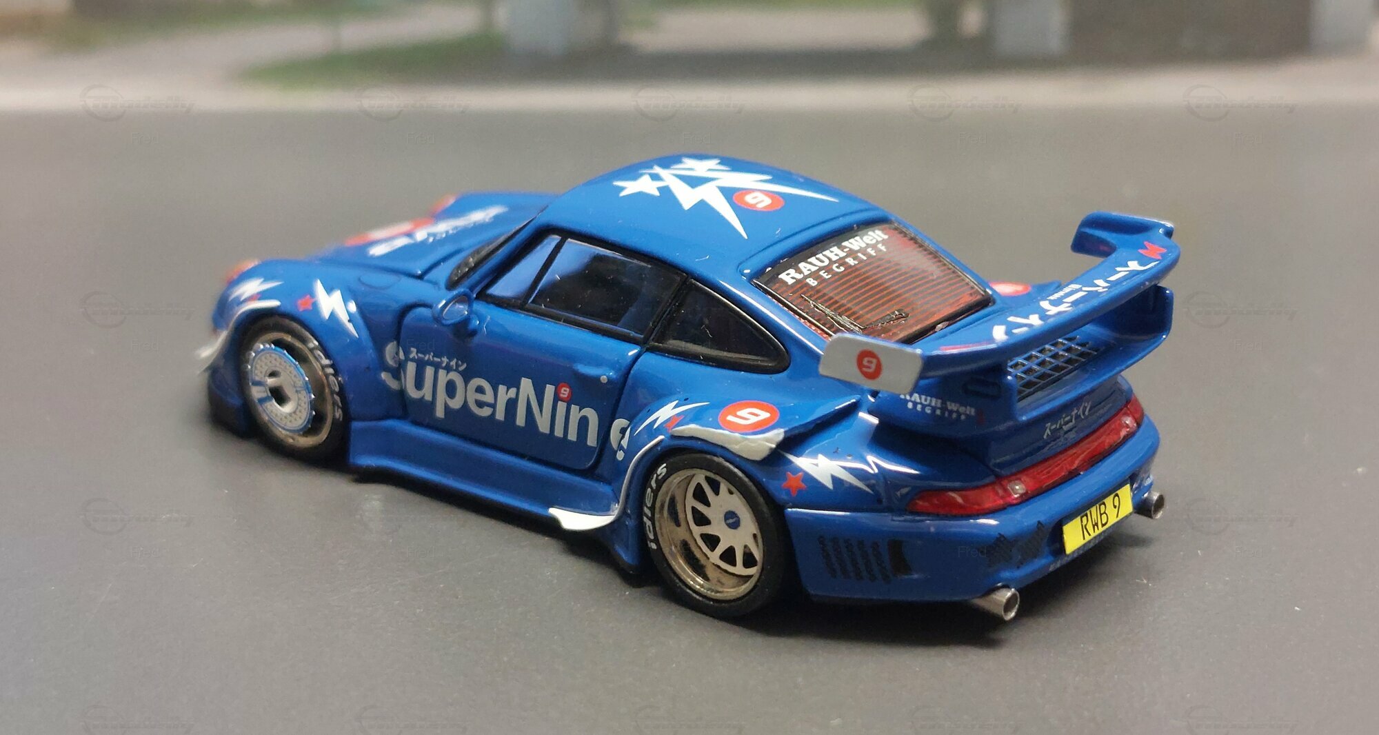 Die Details des Modells von Peako im Maßstab 1:64 sind beeindruckend - von den markanten „RAUH-Welt“ Schriftzügen auf der Windschutzscheibe bis hin zur präzise dargestellten Lackierung in einem kräftigen Blau mit weißen Akzenten und Sternengrafiken. Die Räder vom Typ BBS ergänzen das aggressive Aussehen perfekt. Die seltene Farbgebung und die sorgfältig reproduzierten Details machen diese Miniatur zu einem wertvollen Schaustück. Die limitierte Auflage von 999 Stück weltweit verstärkt den Reiz dieses Modells und macht es zu einem begehrten Sammlerstück. Ein wahres Schmuckstück für jeden Modellauto-Enthusiasten, der einen Hauch des legendären Porsche 911 (993) RWB Super Nine in seiner Sammlung haben möchten.