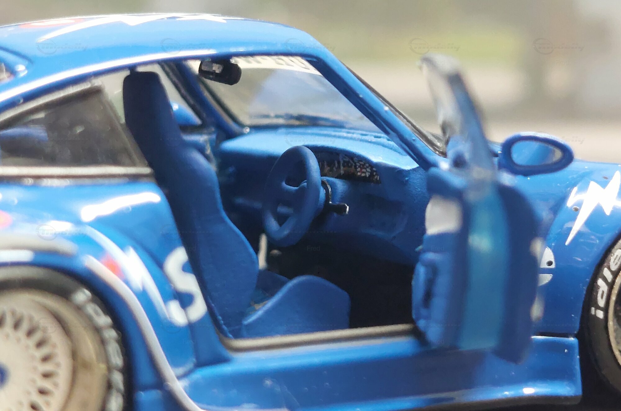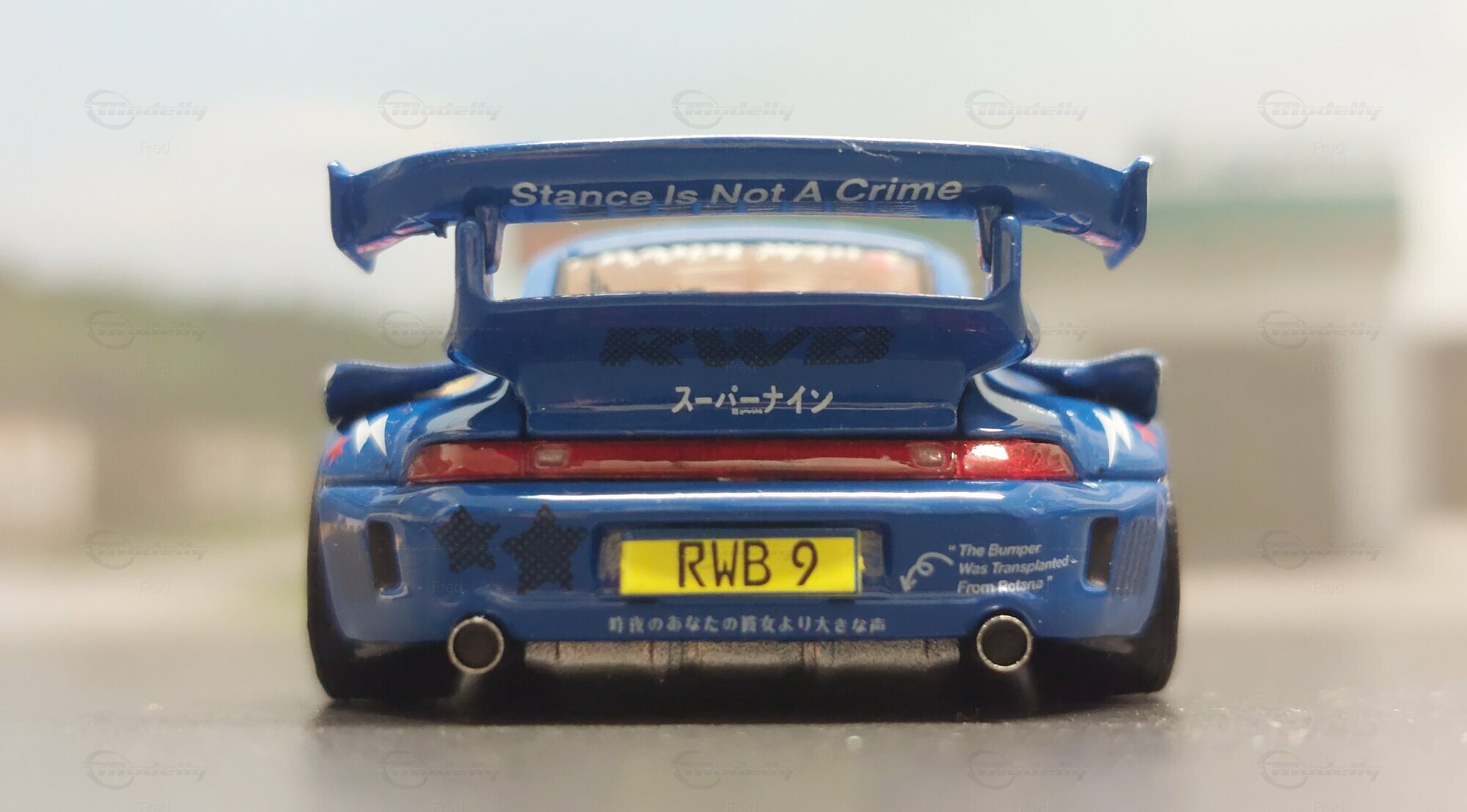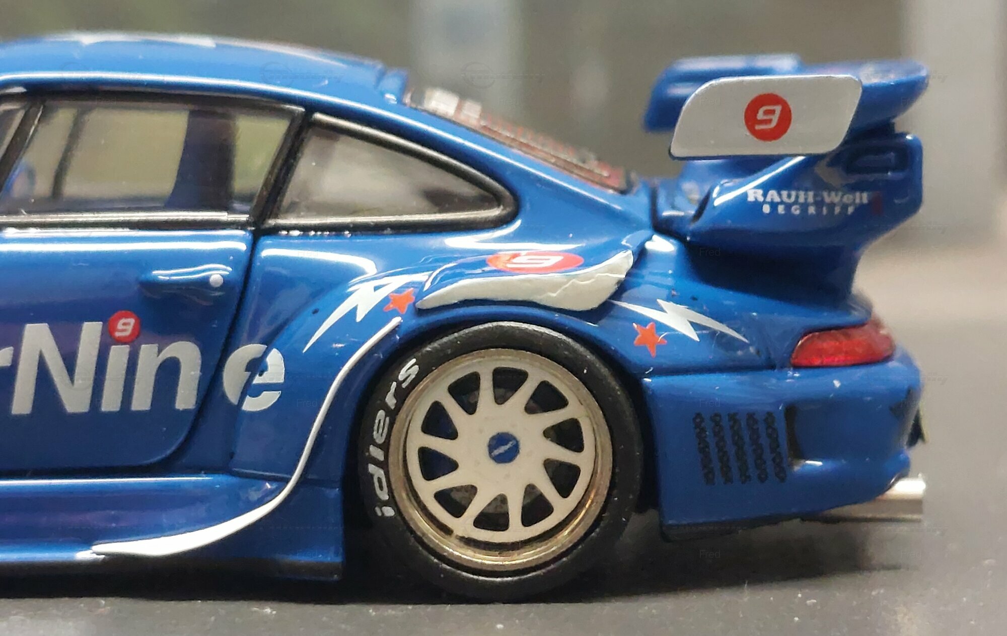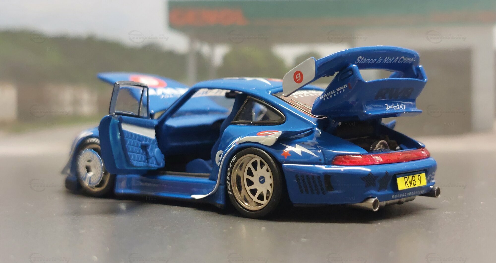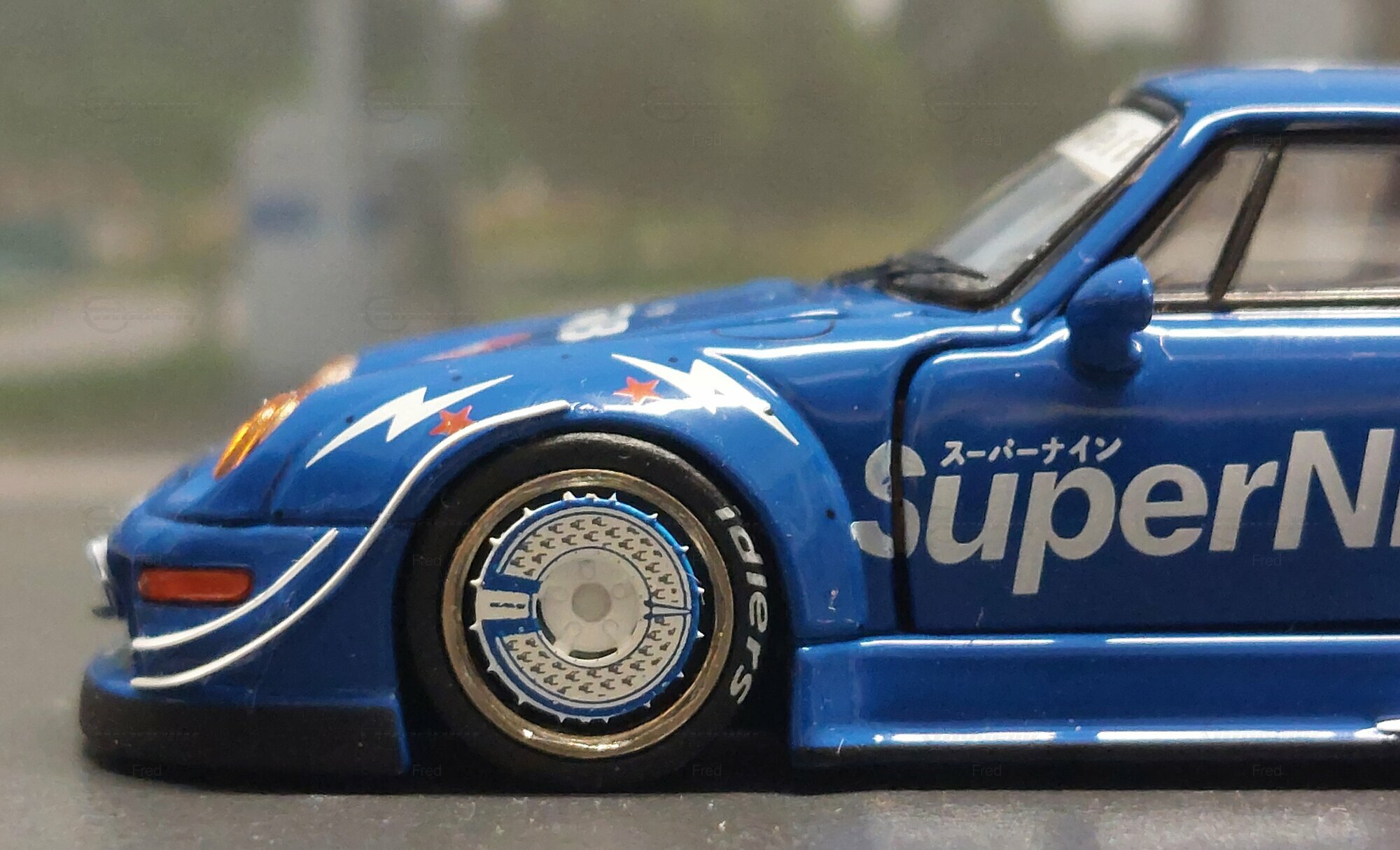 Die Details des Modells von Peako im Maßstab 1:64 sind beeindruckend - von den markanten „RAUH-Welt“ Schriftzügen auf der Windschutzscheibe bis hin zur präzise dargestellten Lackierung in einem kräftigen Blau mit weißen Akzenten und Sternengrafiken. Die Räder vom Typ BBS ergänzen das aggressive Aussehen perfekt. Die seltene Farbgebung und die sorgfältig reproduzierten Details machen diese Miniatur zu einem wertvollen Schaustück. Die limitierte Auflage von 999 Stück weltweit verstärkt den Reiz dieses Modells und macht es zu einem begehrten Sammlerstück. Ein wahres Schmuckstück für jeden Modellauto-Enthusiasten, der einen Hauch des legendären Porsche 911 (993) RWB Super Nine in seiner Sammlung haben möchten.