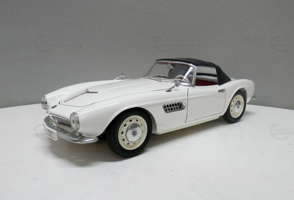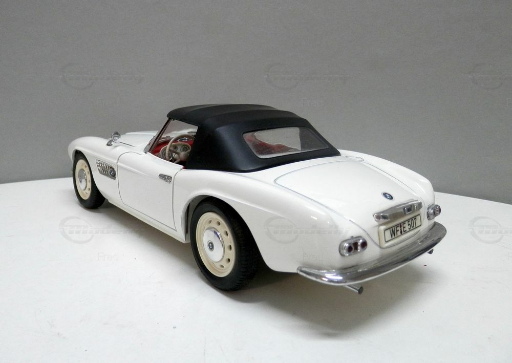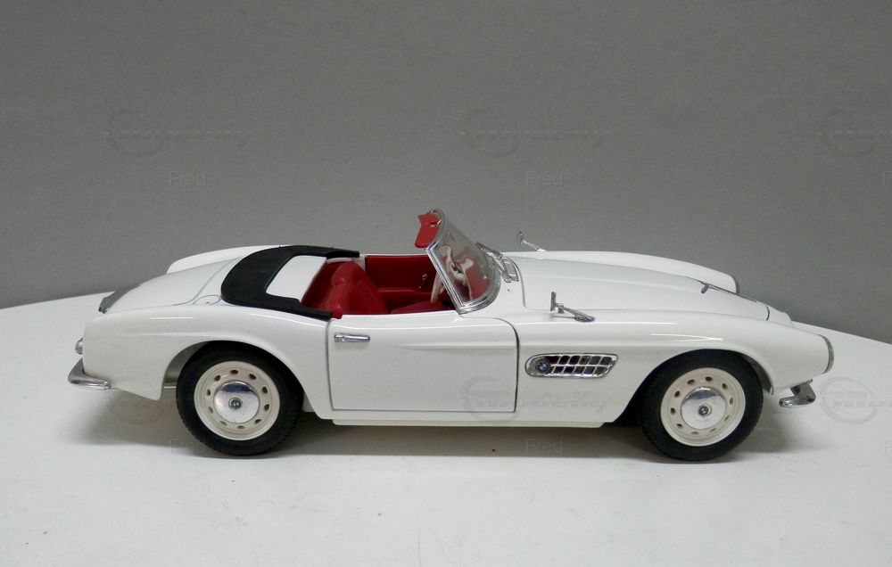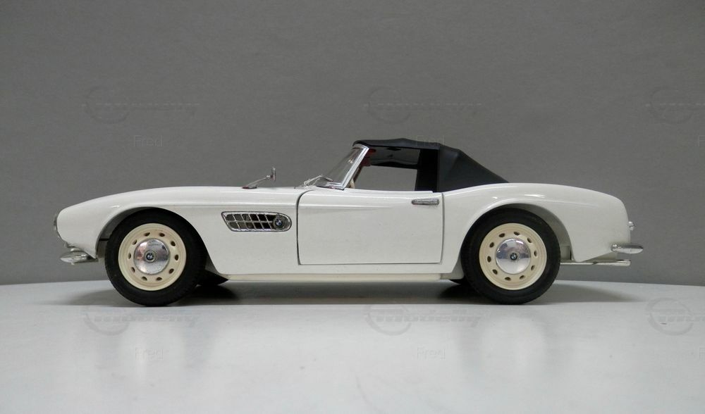 In der Kollektion von Modelly-Mitglied „Fred“ befindet sich ein exaktes 1:18 Modell des BMW 507 von Revell. Dieses Modellauto im 1:18 Maßstab ist vollständig aus Diecast-Material gefertigt und zeichnet sich durch seine detailgetreue Umsetzung aus. Die Karosserie des Modells zeigt eine weiße Lackierung, die in matt gehalten ist, während die edlen Chromdetails an Front- und Heckstoßfänger, Türgriffen und seitlichen Lufteinlässen die Linienführung des Originals sachlich widerspiegeln. Auffällig ist, dass das Interieur des Modells in einem rötlichen Farbton gestaltet ist – ein Charakteristikum vieler originaler BMW 507 aus diesem Bauzeitraum. Die Felgen sind, dem Original entsprechend, cremefarben und mit silbernem Zentralverschluss gehalten, wie sie auch an den tatsächlich ausgelieferten Fahrzeugen zu sehen waren. Besonders zu erwähnen ist das Stoffverdeck in Schwarz, das die klassische Silhouette des Roadsters unterstreicht. Der Tankdeckel auf der rechten hinteren Seite ist filigran nachgebildet, ebenso die Luftauslässe und die geschwungene Motorhaube mit Längssicken.