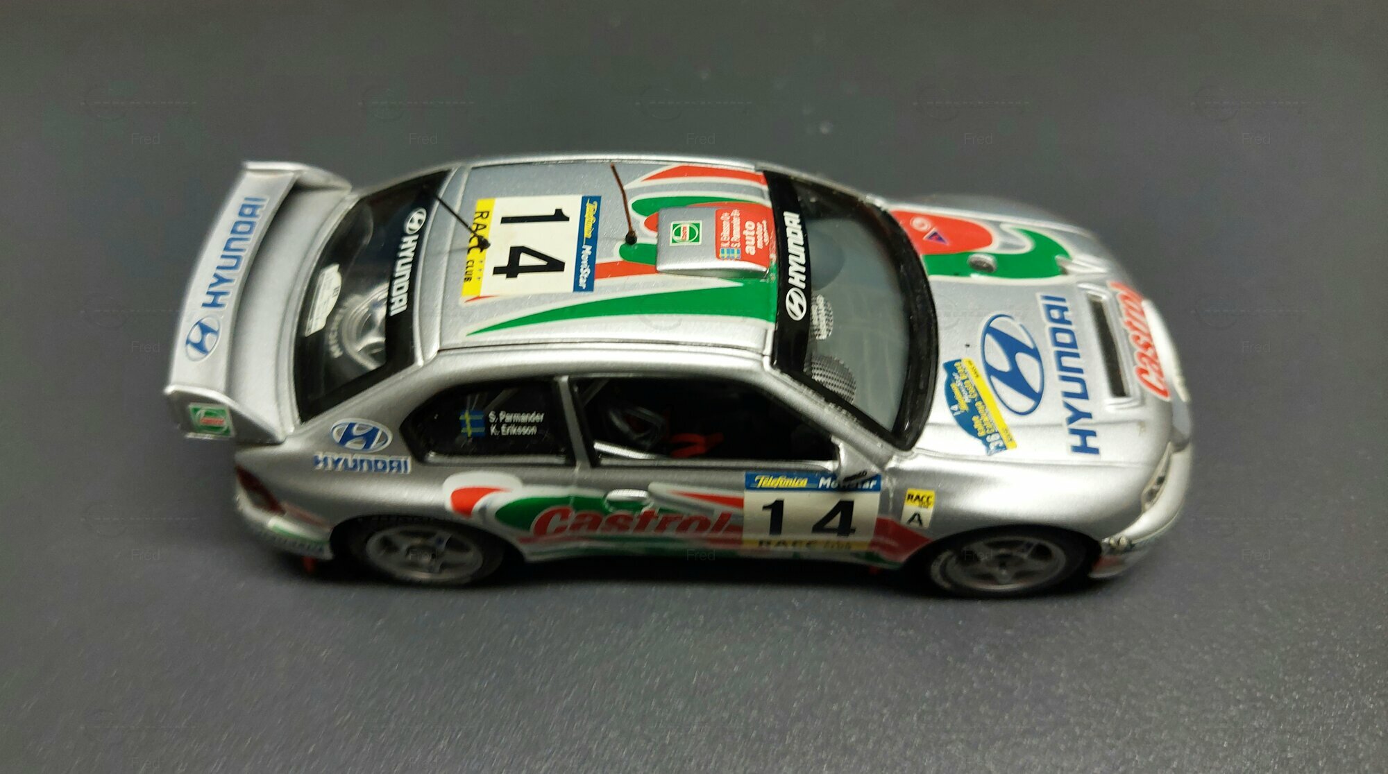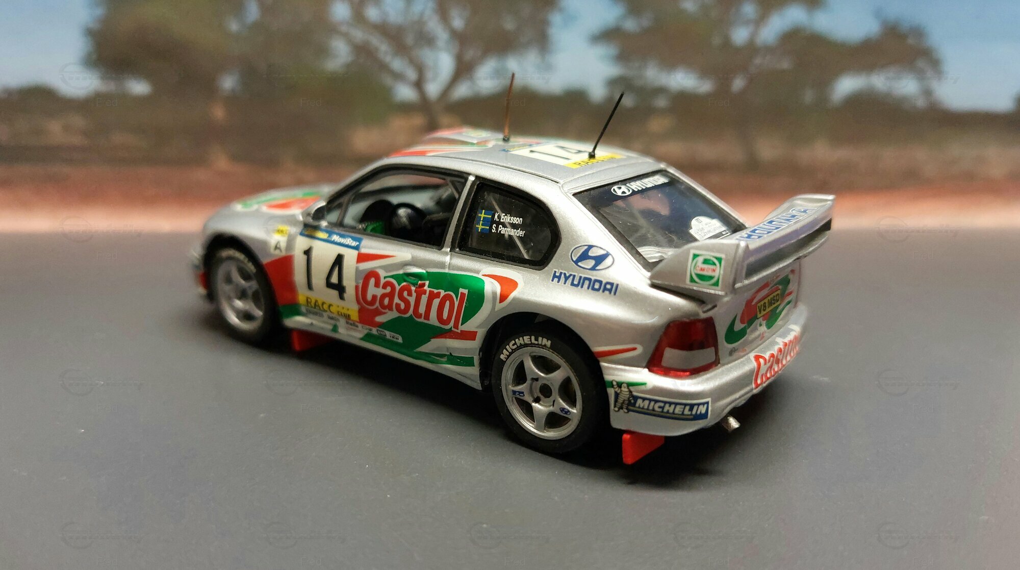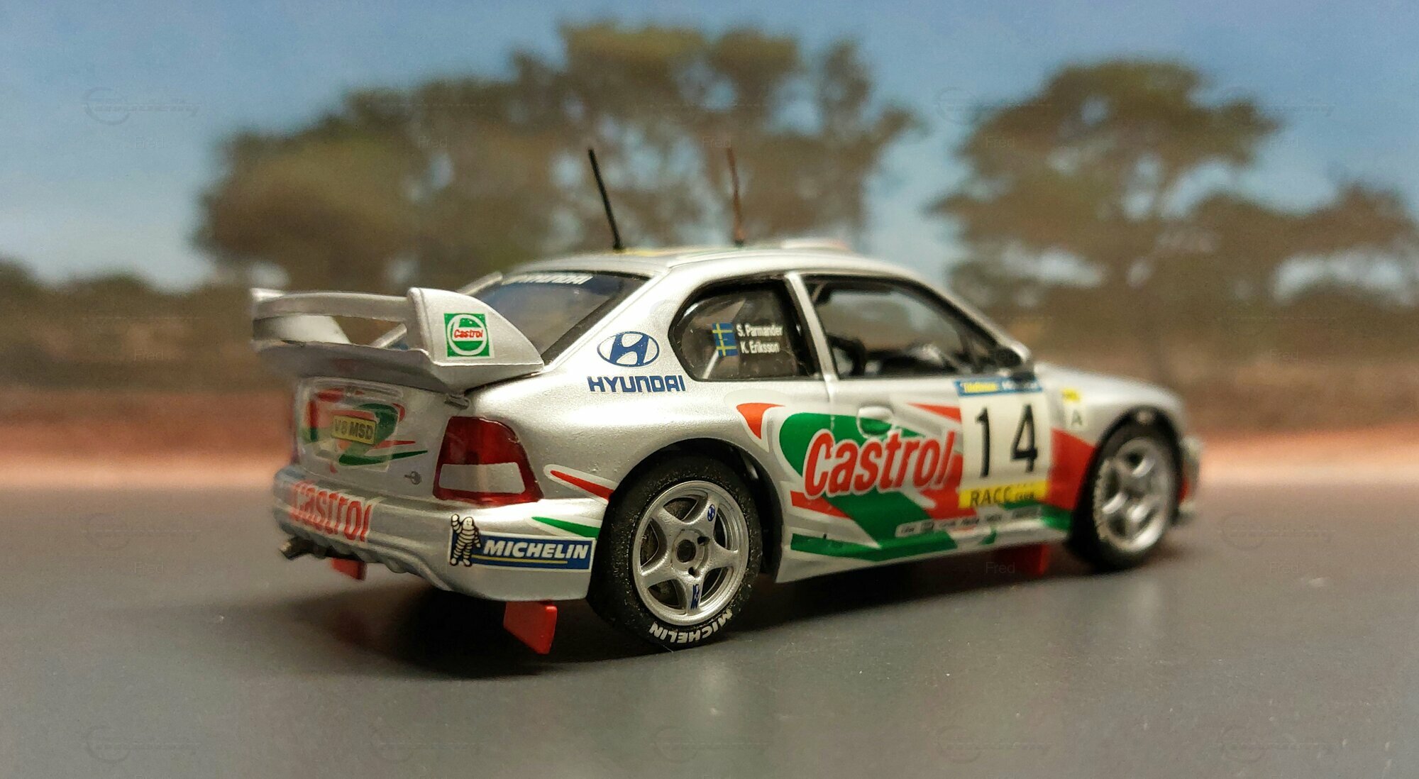 Die Lackierung und Optik des Hyundai Accent WRC sind unverkennbar. Die Miniatur, die von Skid im Maßstab 1:43 gefertigt wurde, spiegelt dies perfekt wider. Die auffällige Lackierung in Silber mit den grünen und roten Akzenten ist charakteristisch für das Castrol-Rallye-Team. Auf den Fotos des Modells, das Sammler Fred gehört, sind die detaillierten Sponsorenaufkleber von Castrol, Hyundai, Michelin und weiteren gut zu erkennen. Sie unterstreichen die historische Authentizität des Modells. Die präzise Nachbildung der Scheinwerfer, Stoßstangen und der großen Heckspoiler liefern einen Eindruck von der aerodynamischen Raffinesse des Originals.
