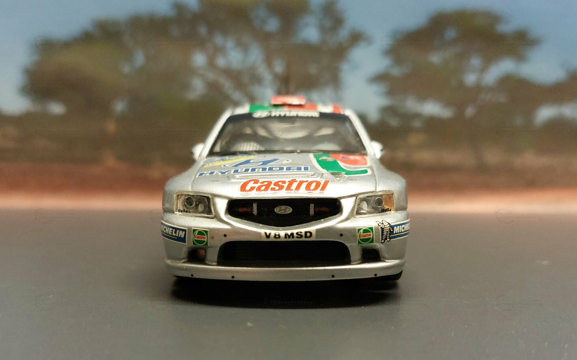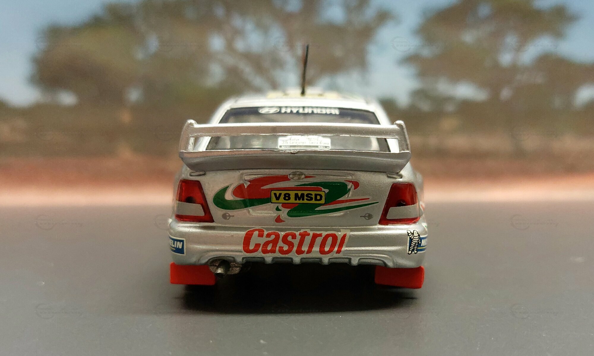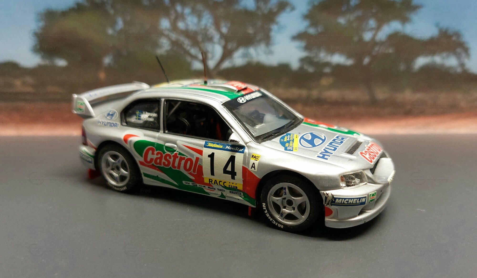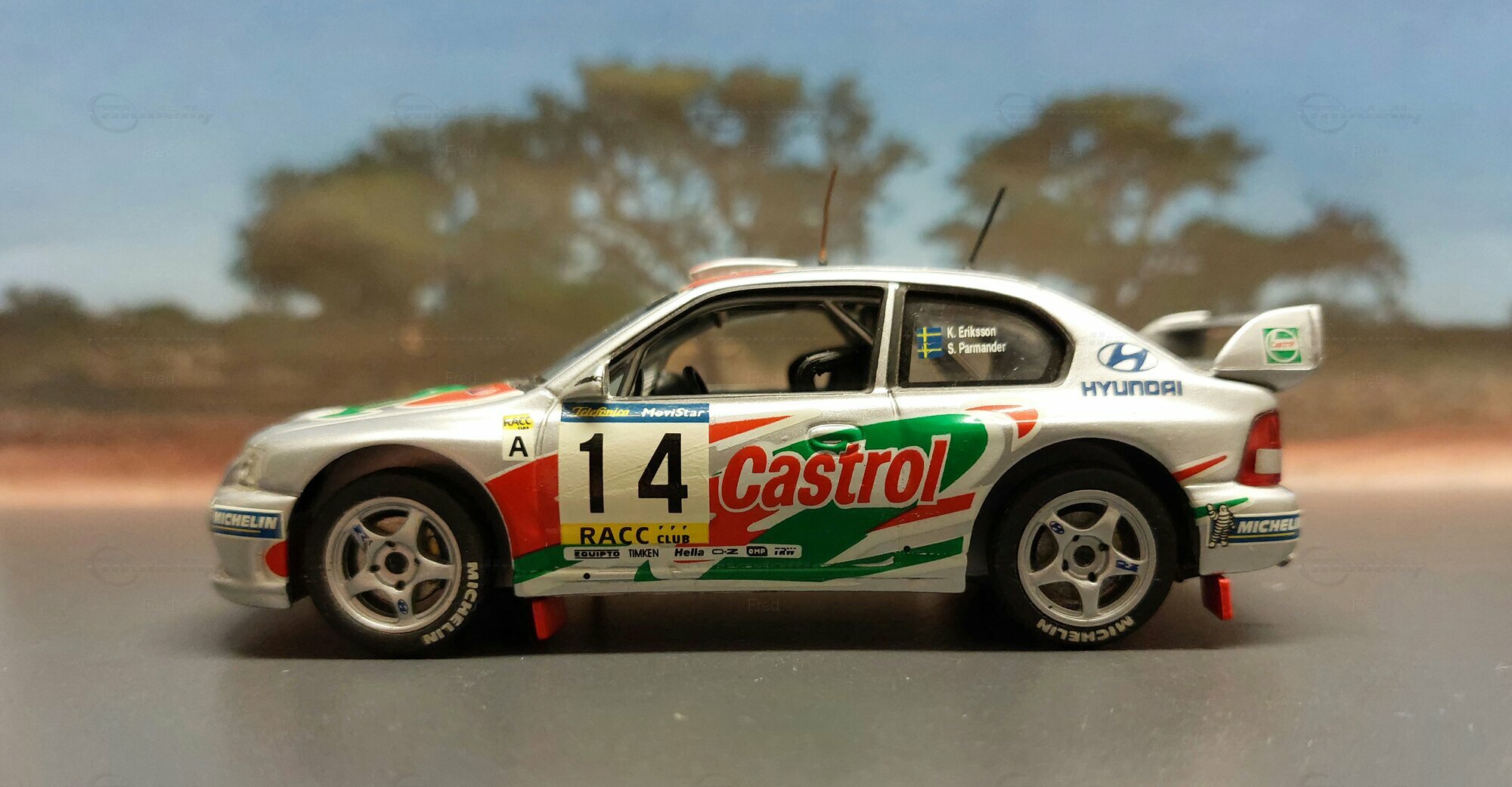 Die Lackierung und Optik des Hyundai Accent WRC sind unverkennbar. Die Miniatur, die von Skid im Maßstab 1:43 gefertigt wurde, spiegelt dies perfekt wider. Die auffällige Lackierung in Silber mit den grünen und roten Akzenten ist charakteristisch für das Castrol-Rallye-Team. Auf den Fotos des Modells, das Sammler Fred gehört, sind die detaillierten Sponsorenaufkleber von Castrol, Hyundai, Michelin und weiteren gut zu erkennen. Sie unterstreichen die historische Authentizität des Modells. Die präzise Nachbildung der Scheinwerfer, Stoßstangen und der großen Heckspoiler liefern einen Eindruck von der aerodynamischen Raffinesse des Originals.