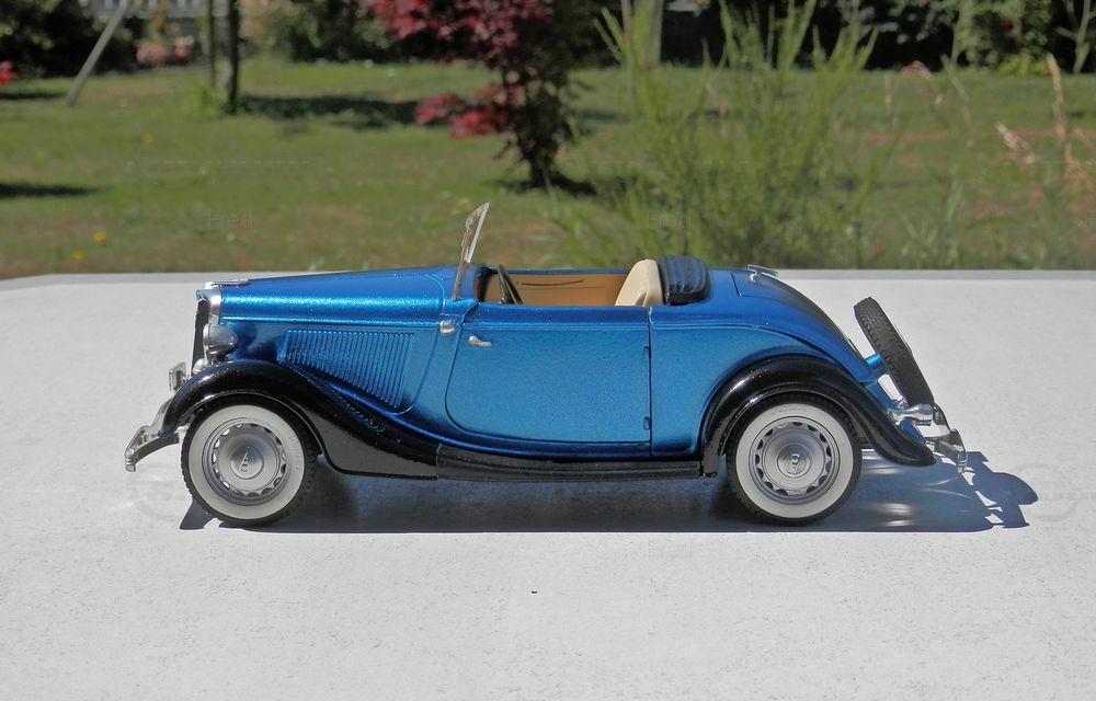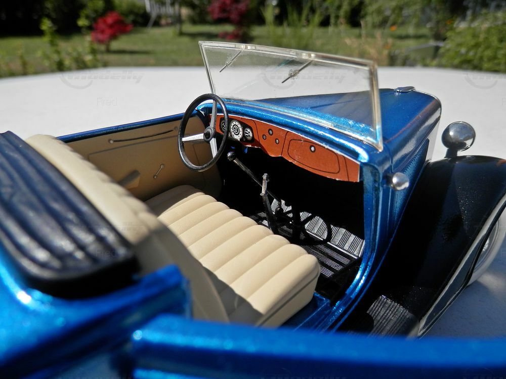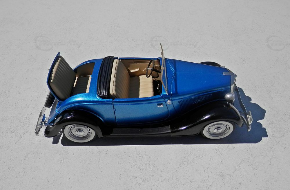 Das hier gezeigte Miniaturmodell ist eine modifizierte Version des 1:18-Maßstabs. Hergestellt von Solido, wurde das Modell aus hochwertigem Diecast-Material gefertigt und weist eine beeindruckende Detailtreue auf. Bevor wir weiter darauf eingehen, ist es wichtig zu betonen, dass diese Miniatur modifiziert wurde und nicht den Zustand des Produkts widerspiegelt, wie es ursprünglich von Solido hergestellt wurde. Die Lackierung des Modells in einem tiefen Metallic-Blau mit schwarzen Akzenten betont die elegante Linienführung des Roadsters. Die Innenausstattung, derselben charakteristischen Periode nachempfunden, erinnert mit ihrer detaillierten Instrumententafel und den präzise nachgebildeten Sitzen an das Original.