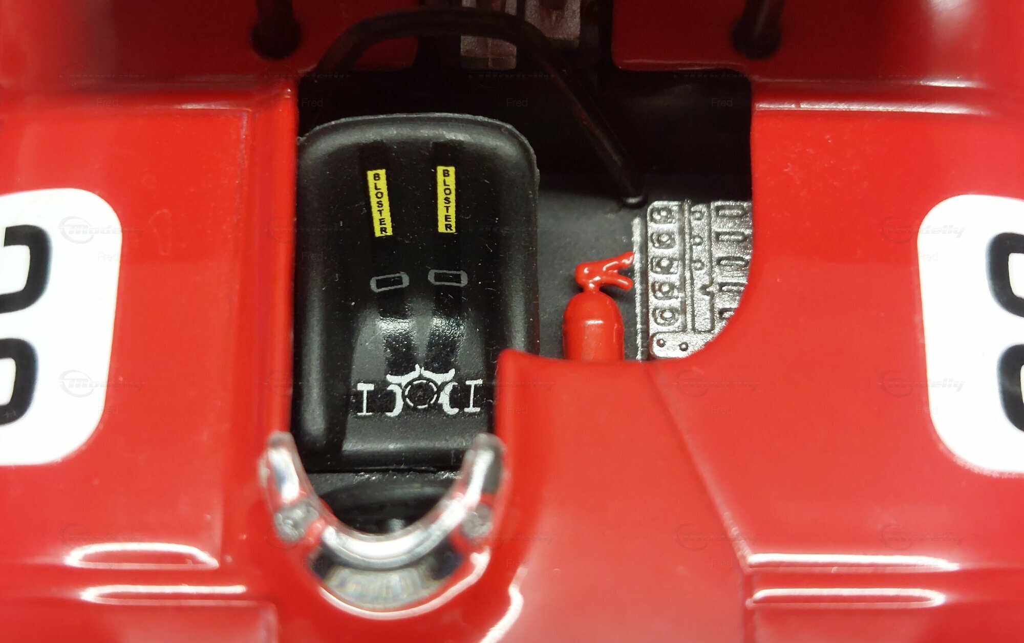 Die lackierte Oberfläche des Modells ist in einem leuchtenden Rot gehalten, das den ikonischen Ferrari-Stil verkörpert. Die goldfarbenen Felgen und die schwarzen Akzente runden das Erscheinungsbild ab und verleihen dem Modell eine sportliche und zugleich elegante Note. Auch die Gestaltung der Rückseite des Modells ist bemerkenswert: Die offenen Auspuffrohre und die scharfen Linien der Heckpartie wurden detailgetreu nachempfunden. Ein Blickfang ist der große Heckflügel, der sowohl in der Funktion als auch im Design eine Schlüsselfunktion im Erscheinungsbild des Wagens einnimmt.