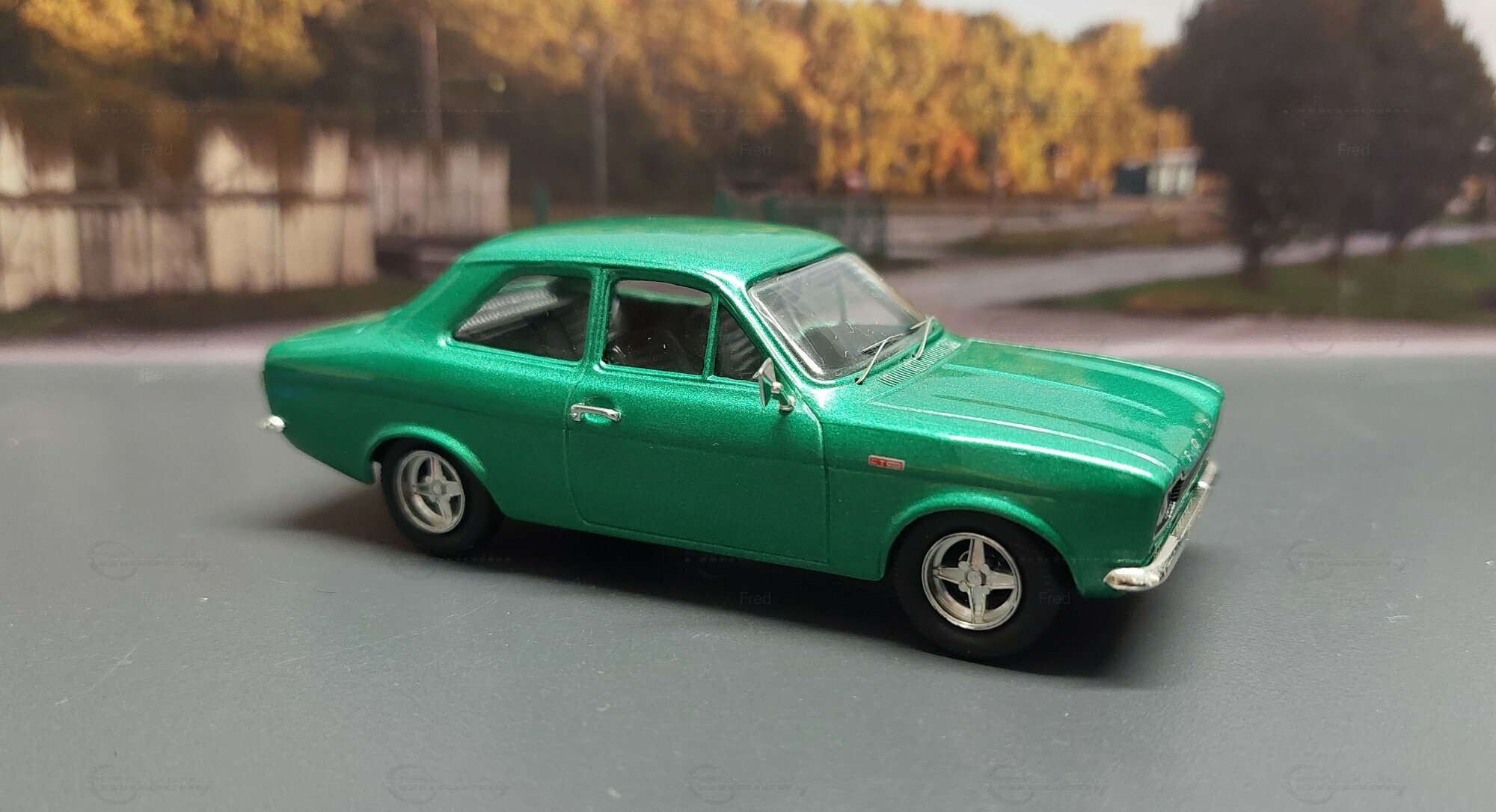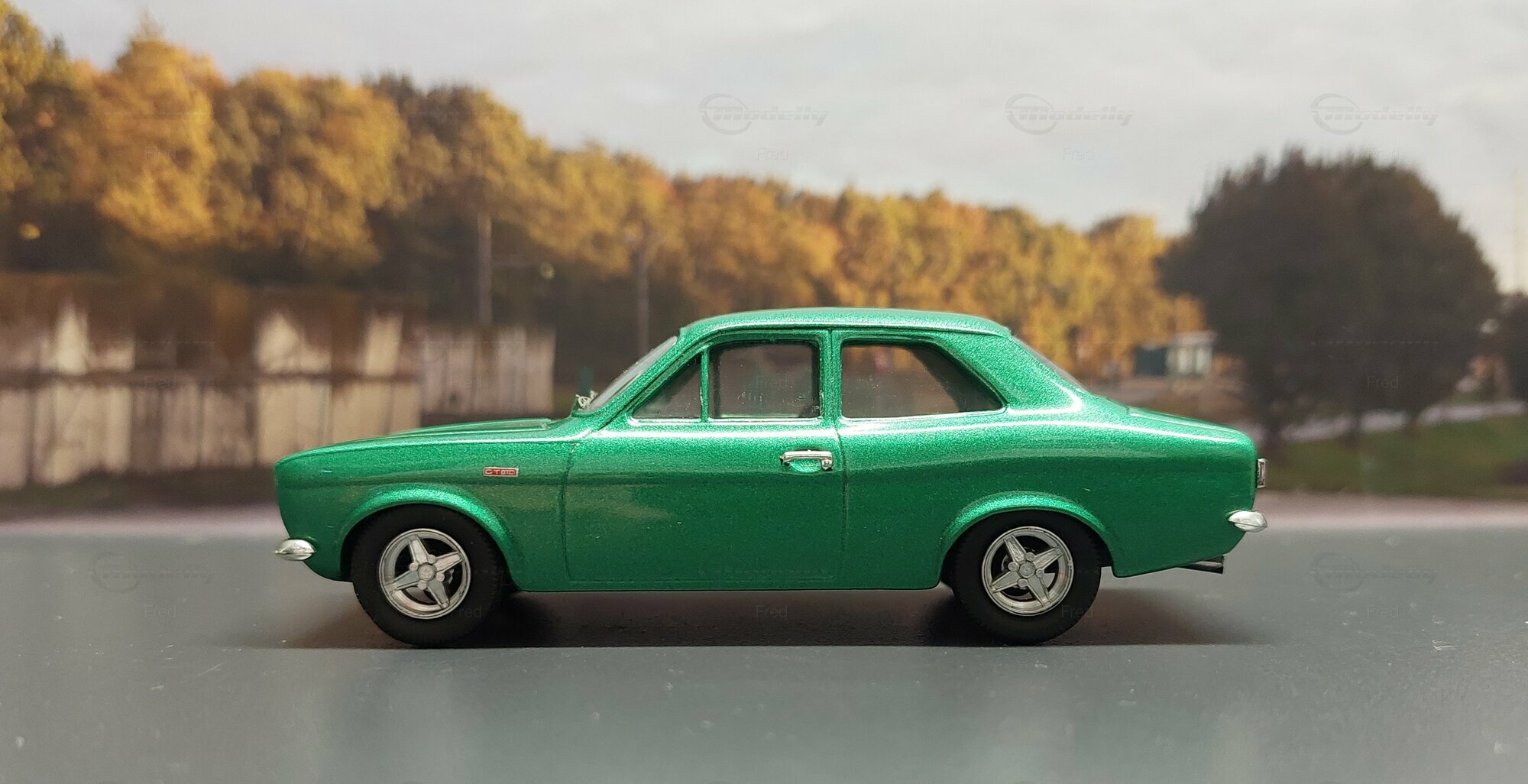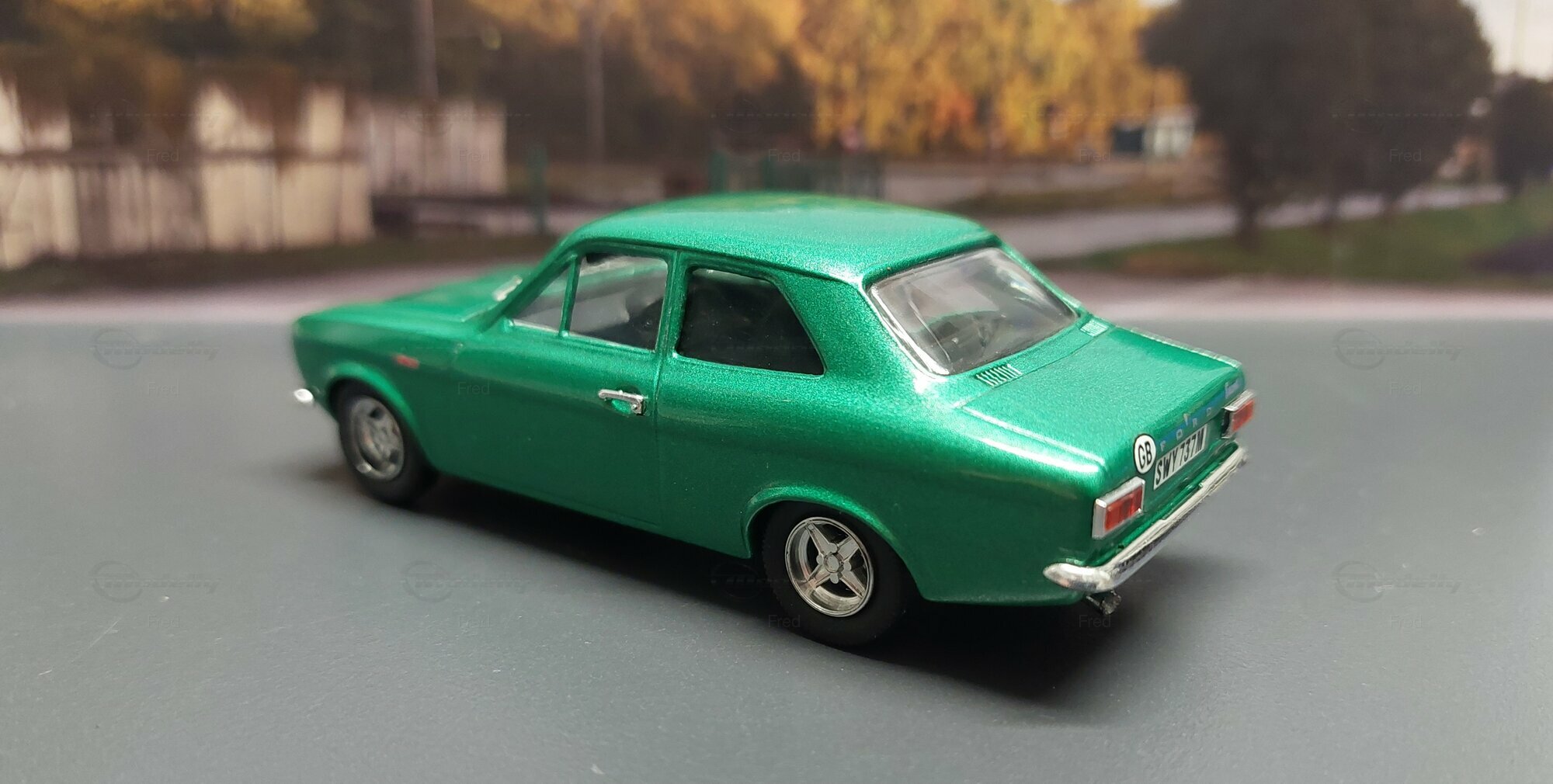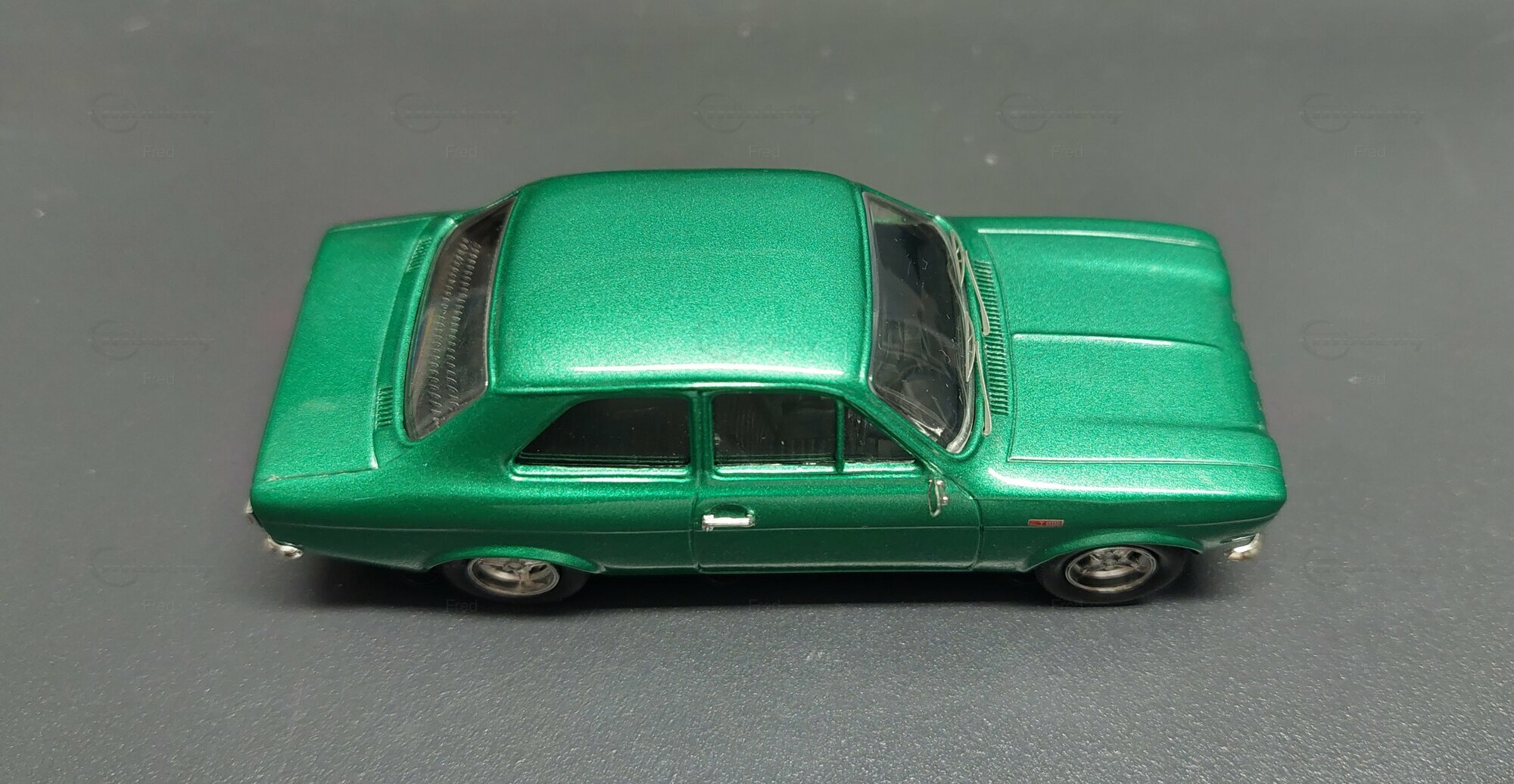 Die auf den Fotos erkennbare Lackierung des Modells ist auffällig und einzigartig. Das glänzende Grün verleiht dem Modellauto eine besondere Note und ahmt die möglicherweise gleiche Farbe eines Originalfahrzeugs nach. Der Ford-Schriftzug an der Front, die verchromten Stoßstangen und die einzelnen Details wie die Scheinwerfer und Rücklichter wurden sorgfältig umgesetzt. Außerdem fallen besonders die Felgen auf, die dem Fahrzeug eine sportliche Note verleihen und möglicherweise von einem speziellen Hersteller wie Revolution RFX entworfen wurden. Auf der linken Seite des Modells ist das "GT 1300" Emblem, ein Hinweis auf die sportlichere Ausstattung dieses Fahrzeugs, gut sichtbar.