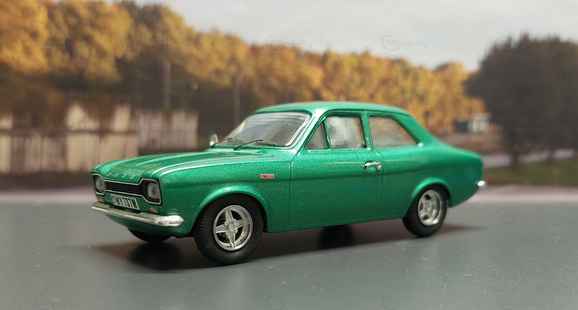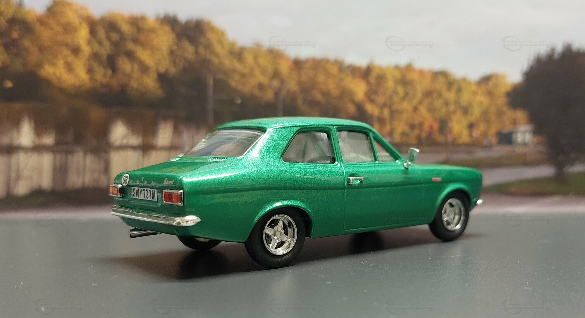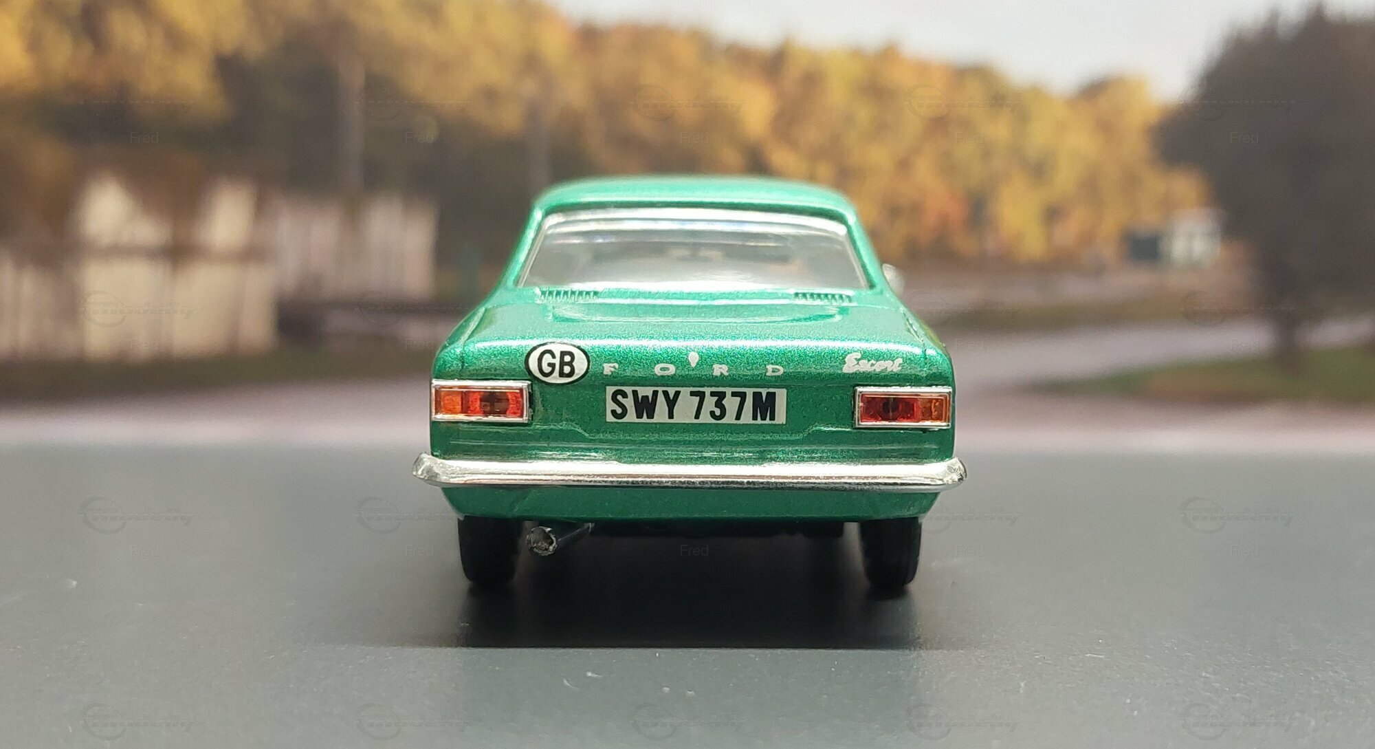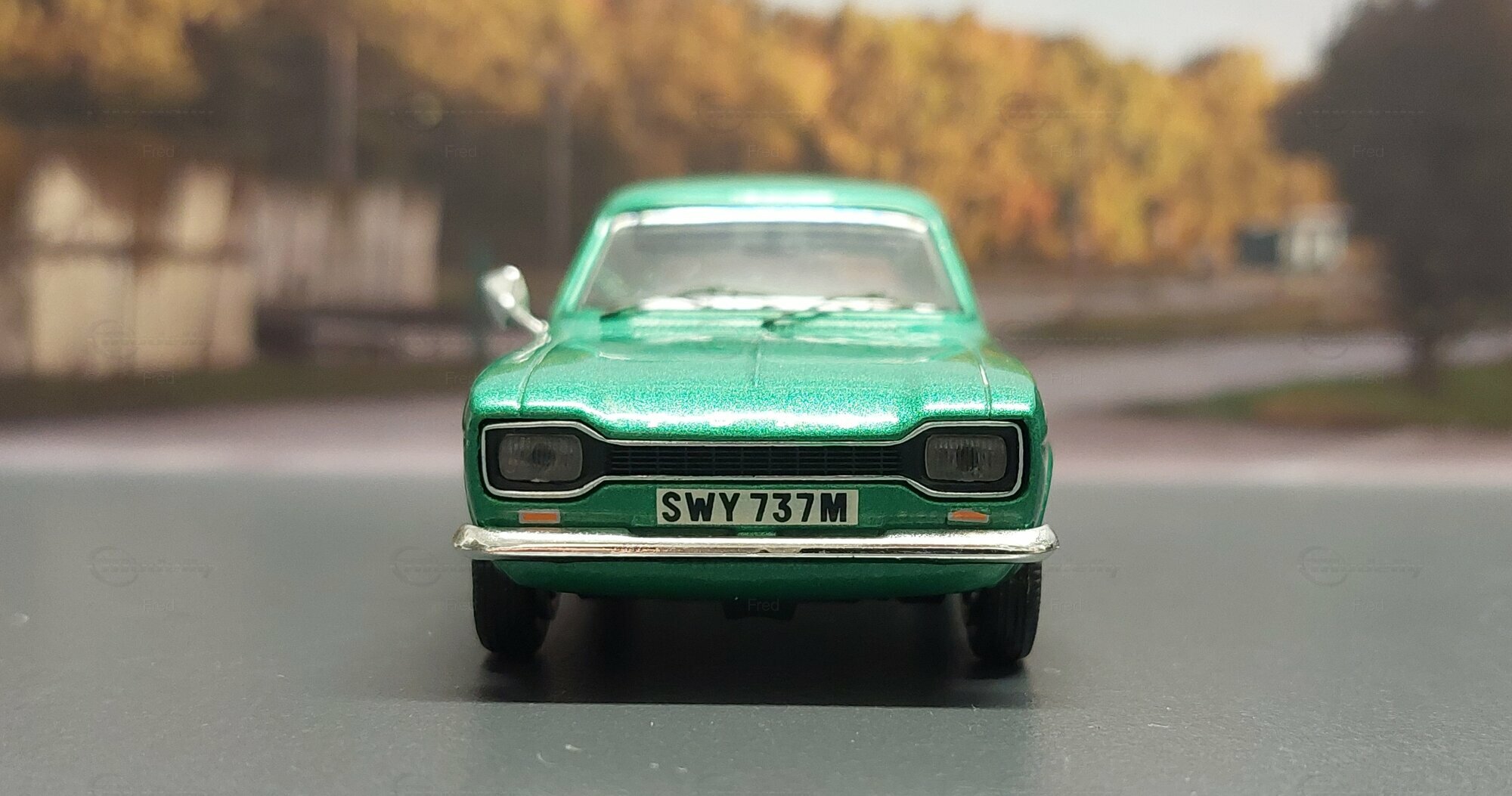 Die auf den Fotos erkennbare Lackierung des Modells ist auffällig und einzigartig. Das glänzende Grün verleiht dem Modellauto eine besondere Note und ahmt die möglicherweise gleiche Farbe eines Originalfahrzeugs nach. Der Ford-Schriftzug an der Front, die verchromten Stoßstangen und die einzelnen Details wie die Scheinwerfer und Rücklichter wurden sorgfältig umgesetzt. Außerdem fallen besonders die Felgen auf, die dem Fahrzeug eine sportliche Note verleihen und möglicherweise von einem speziellen Hersteller wie Revolution RFX entworfen wurden. Auf der linken Seite des Modells ist das "GT 1300" Emblem, ein Hinweis auf die sportlichere Ausstattung dieses Fahrzeugs, gut sichtbar.