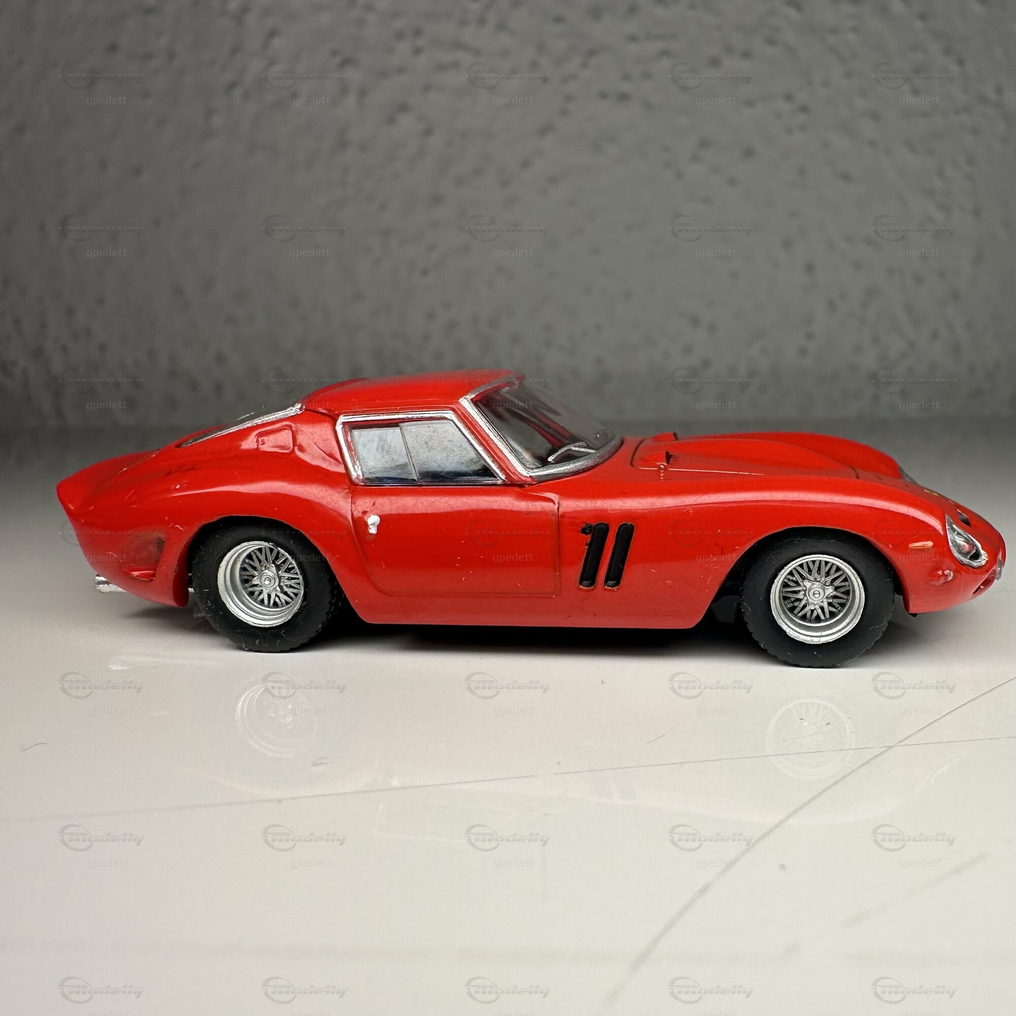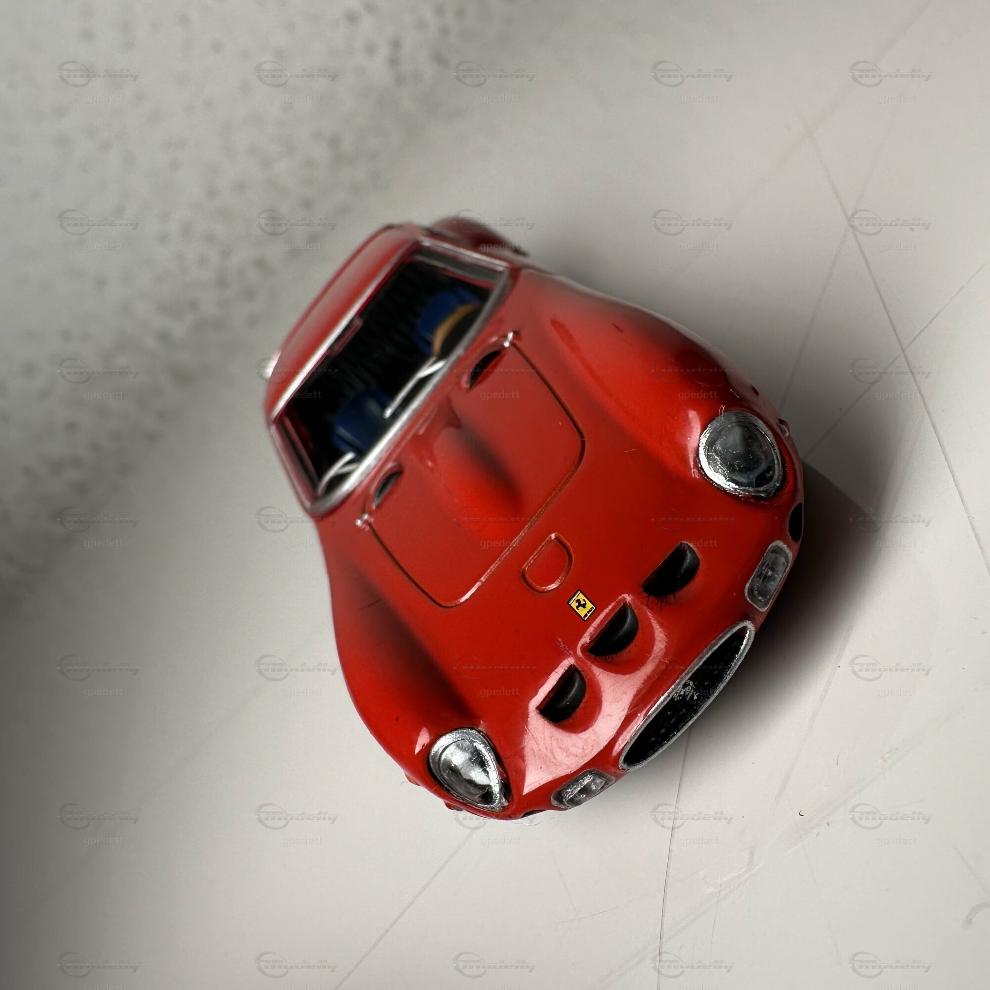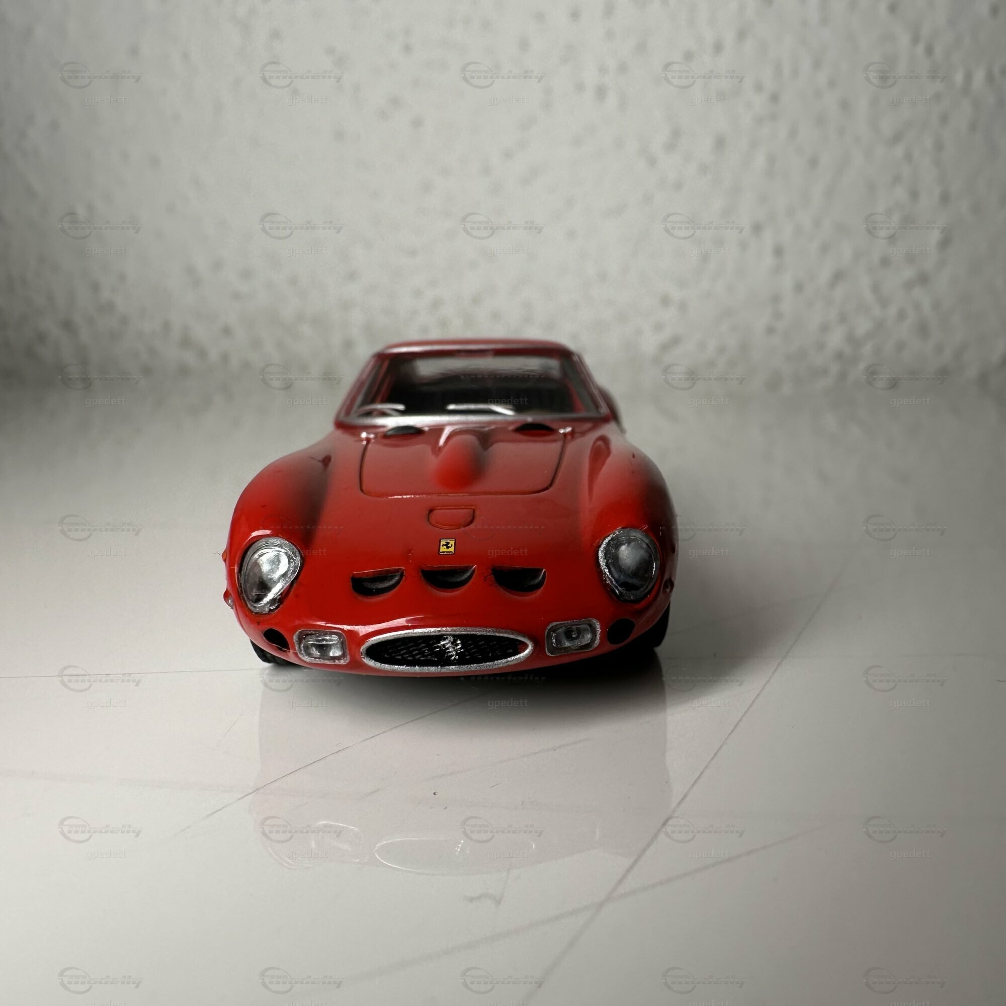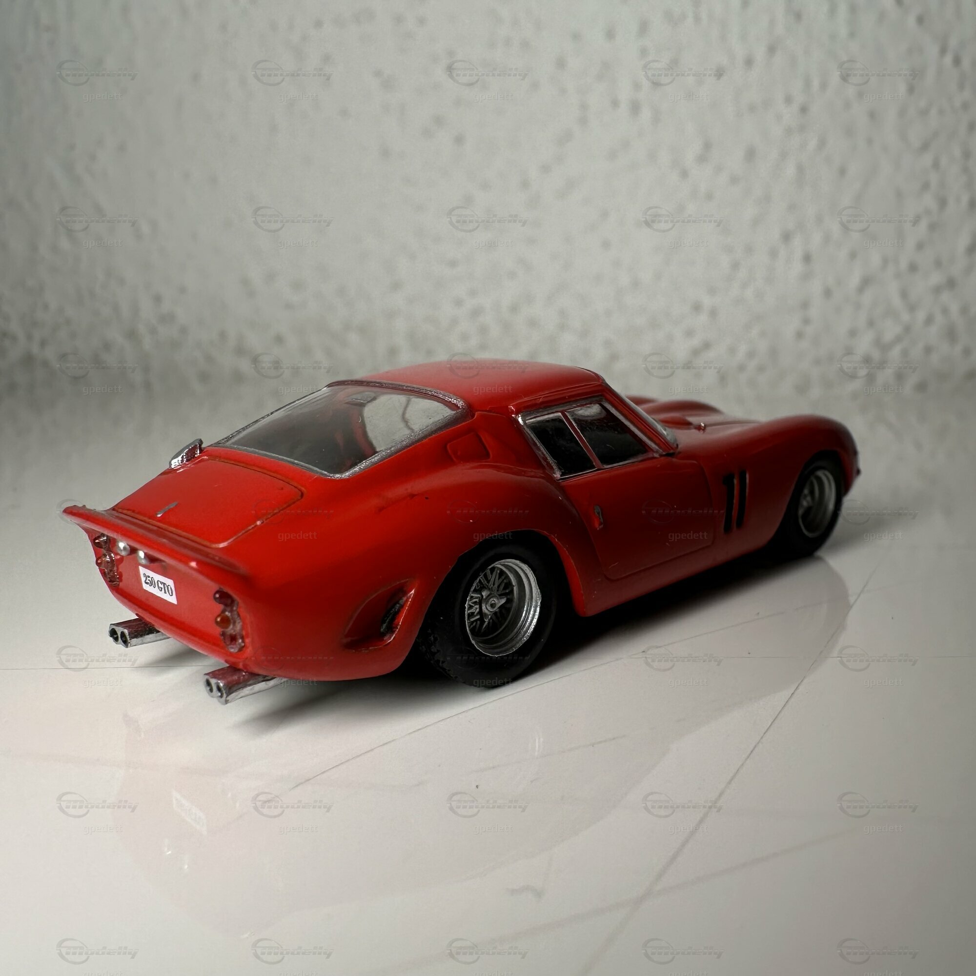 Die hier gezeigte Miniatur im Maßstab 1:64 stammt vom Hersteller Centauria und repräsentiert den Ferrari 250 GTO in beeindruckender Detailtreue. Diese Modellfahrzeug wurde aus dem Material Diecast gefertigt, was dafür sorgt, dass die Miniatur robust und langlebig ist. Das Modell besticht durch seine präzise Nachbildung der Linien und Kurven des Originals. Besondere Merkmale, wie die auffälligen Lufteinlässe auf der Motorhaube und die tief liegenden Scheinwerfer, sind akkurat nachgebildet und vermitteln einen authentischen Eindruck des legendären Sportwagens. Ein weiteres interessantes Detail ist die Nummer "11" an den Seiten, welche das Modell zu einem echten Sammlerstück für jeden Enthusiasten macht.