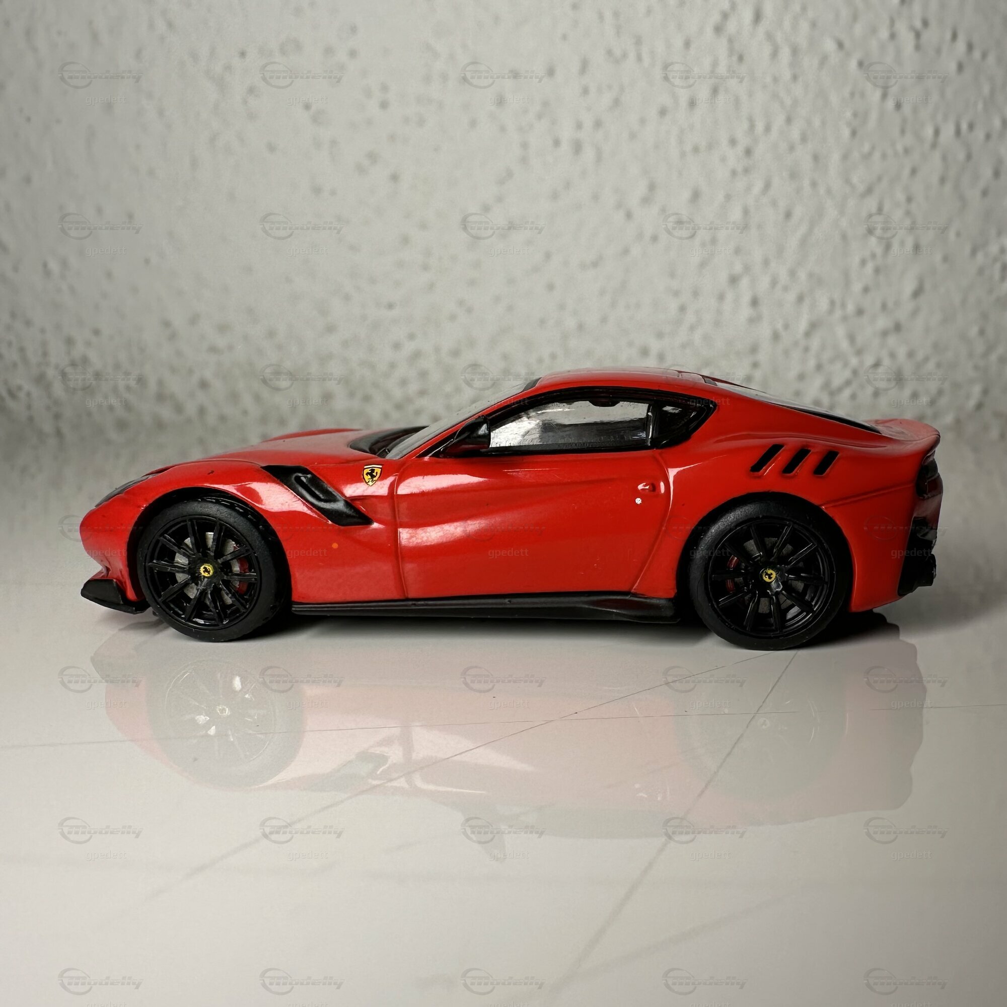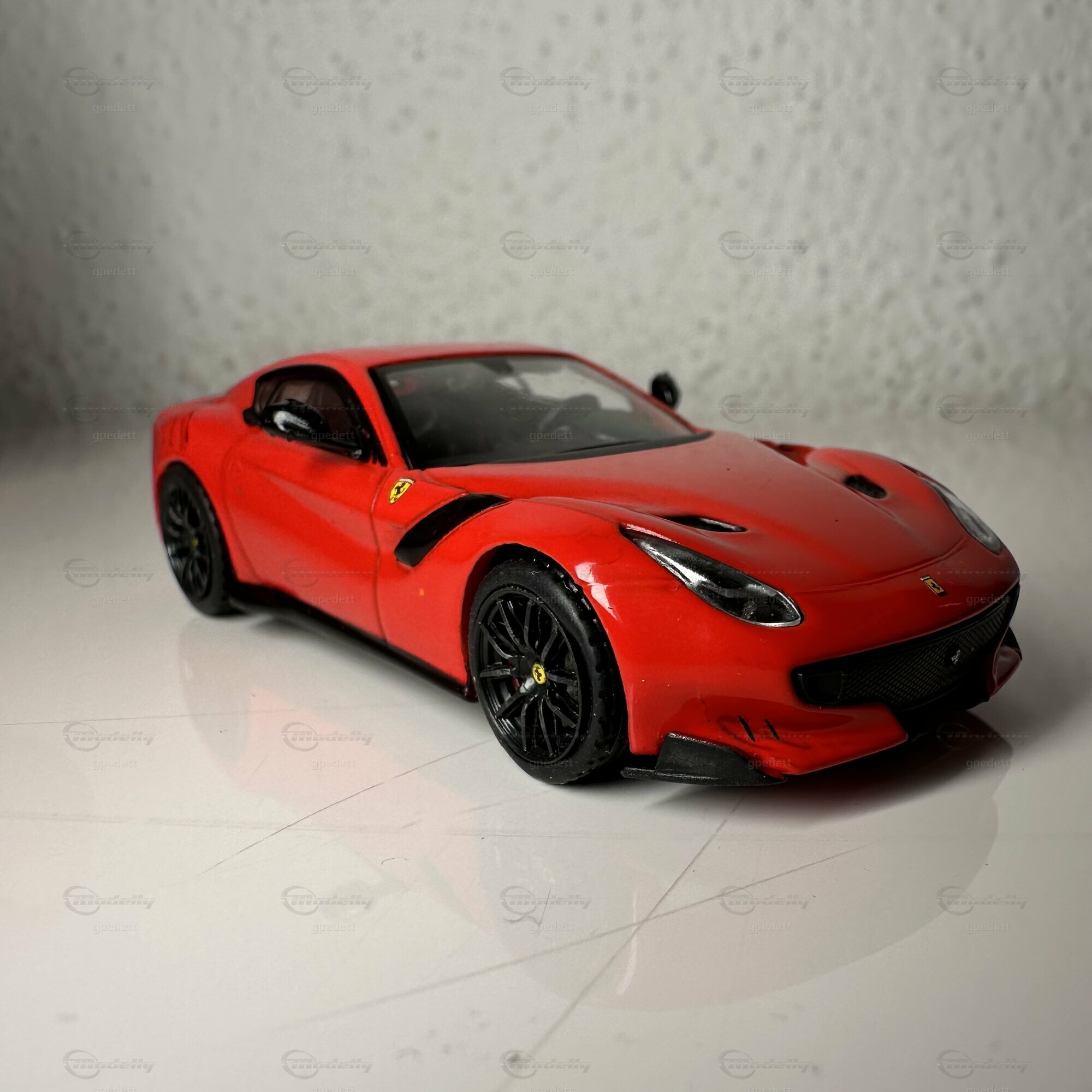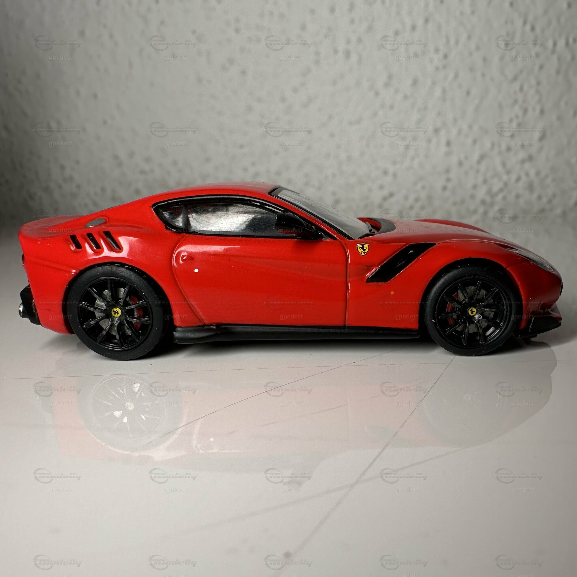 Das hier vorgestellte Modellauto im 1:64 Maßstab ist eine präzise Nachbildung des Ferrari F12 TDF und wurde von Centauria hergestellt. Dieses Modell ist aus hochwertigem Diecast-Material gefertigt, was seine Robustheit und Detailtiefe unterstreicht. Die rote Lackierung des Modells spiegelt die ikonische Rosso Corsa Farbe von Ferrari wider, ergänzt durch schwarz lackierte Elemente wie die Frontlippe und die Seitenschweller. Die Lackierung weist keinerlei Muster oder Aufkleber auf, sondern bleibt dem schlichten, sportlichen Look des Originals treu. Auffallend sind die dreifachen Kiemen auf den hinteren Kotflügeln und das detaillierte GT-ähnliche Heck mit Diffusor und vier Endrohren, die das aggressive Design des Originalfahrzeugs perfekt einfangen.