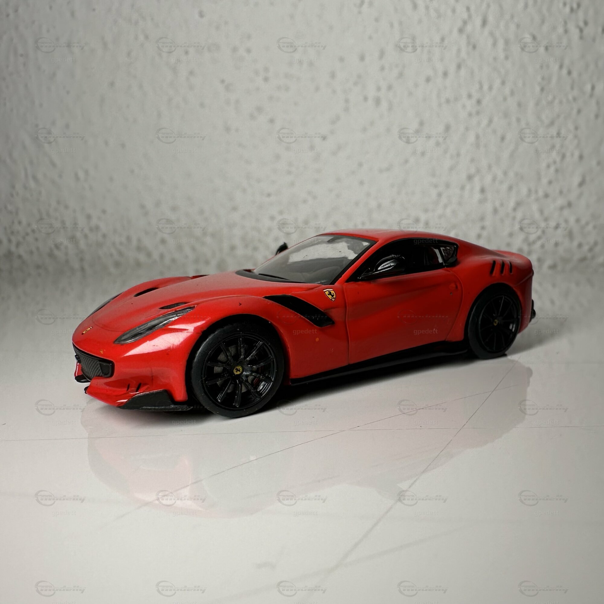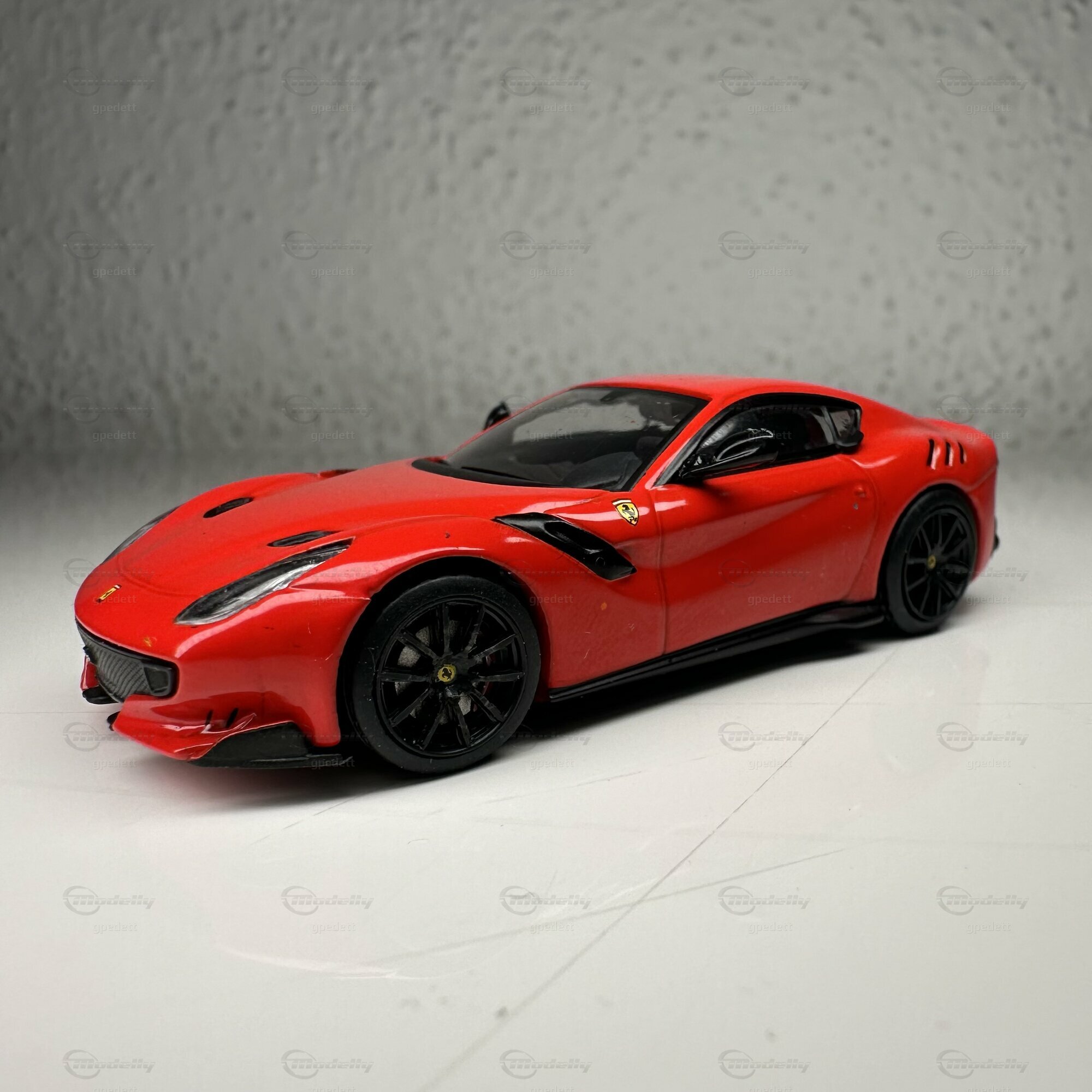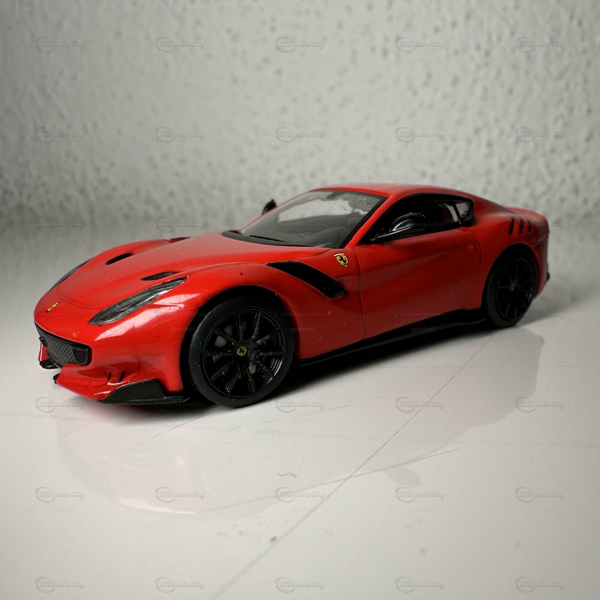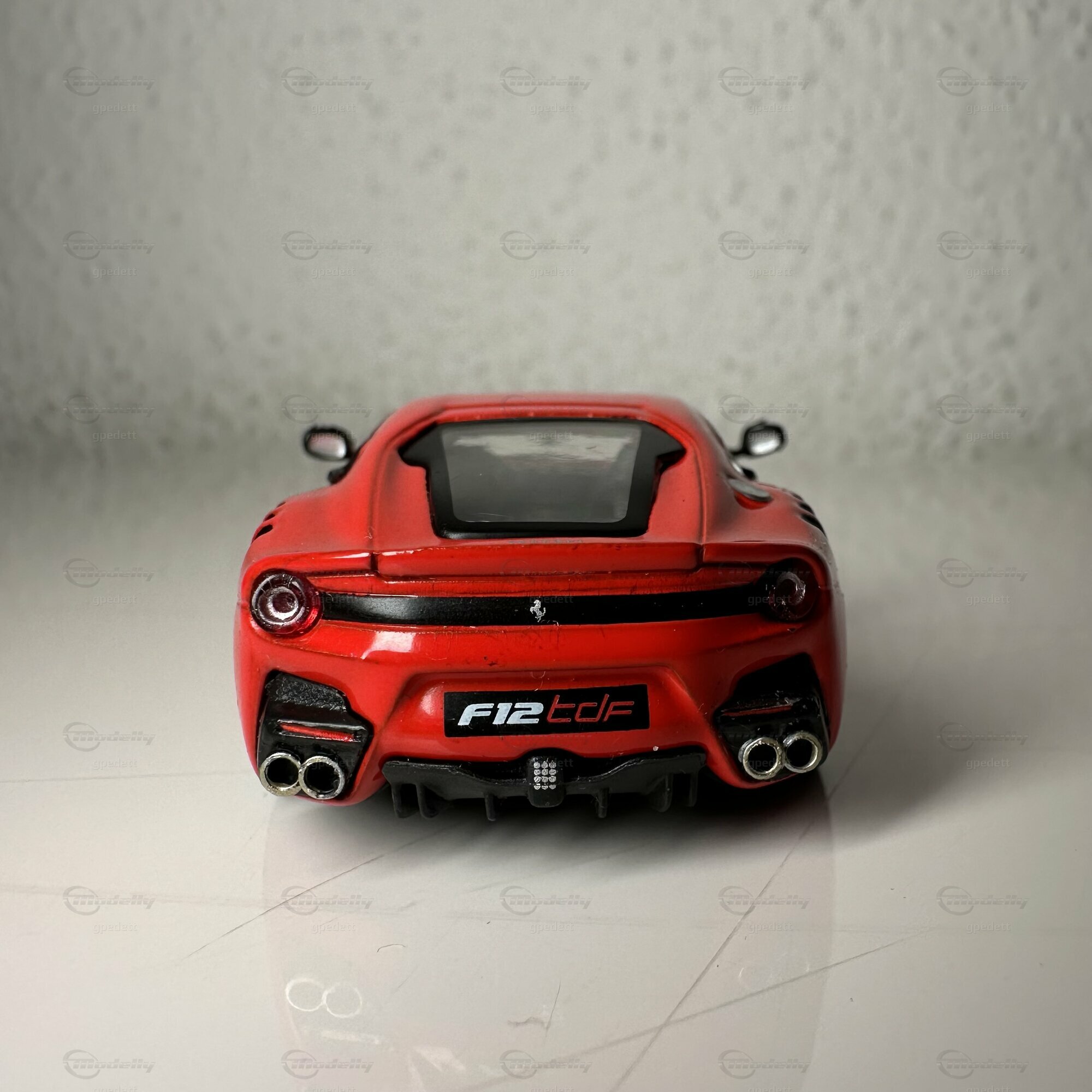Das hier vorgestellte Modellauto im 1:64 Maßstab ist eine präzise Nachbildung des Ferrari F12 TDF und wurde von Centauria hergestellt. Dieses Modell ist aus hochwertigem Diecast-Material gefertigt, was seine Robustheit und Detailtiefe unterstreicht. Die rote Lackierung des Modells spiegelt die ikonische Rosso Corsa Farbe von Ferrari wider, ergänzt durch schwarz lackierte Elemente wie die Frontlippe und die Seitenschweller. Die Lackierung weist keinerlei Muster oder Aufkleber auf, sondern bleibt dem schlichten, sportlichen Look des Originals treu. Auffallend sind die dreifachen Kiemen auf den hinteren Kotflügeln und das detaillierte GT-ähnliche Heck mit Diffusor und vier Endrohren, die das aggressive Design des Originalfahrzeugs perfekt einfangen.