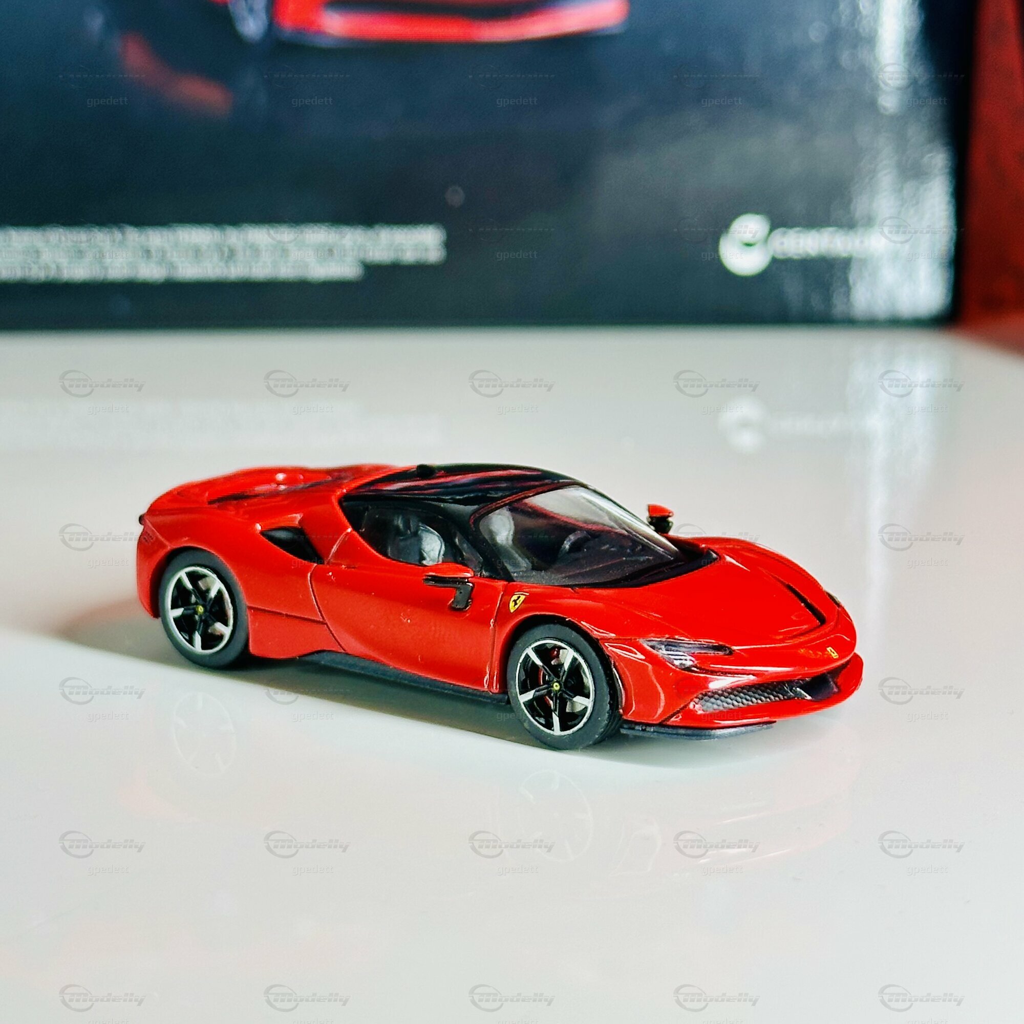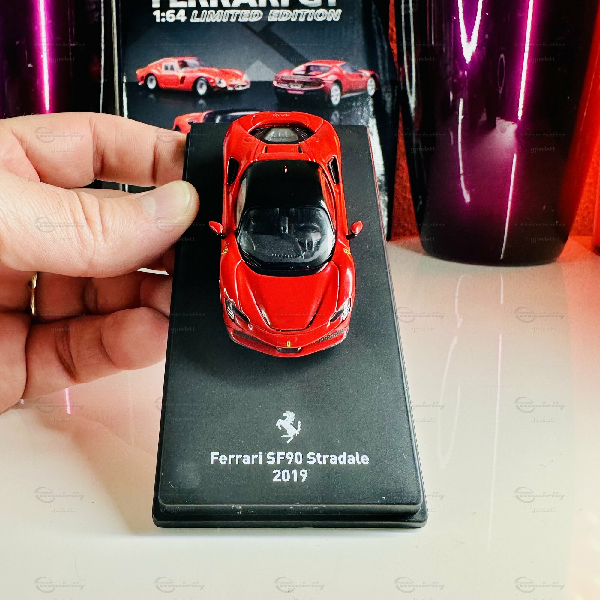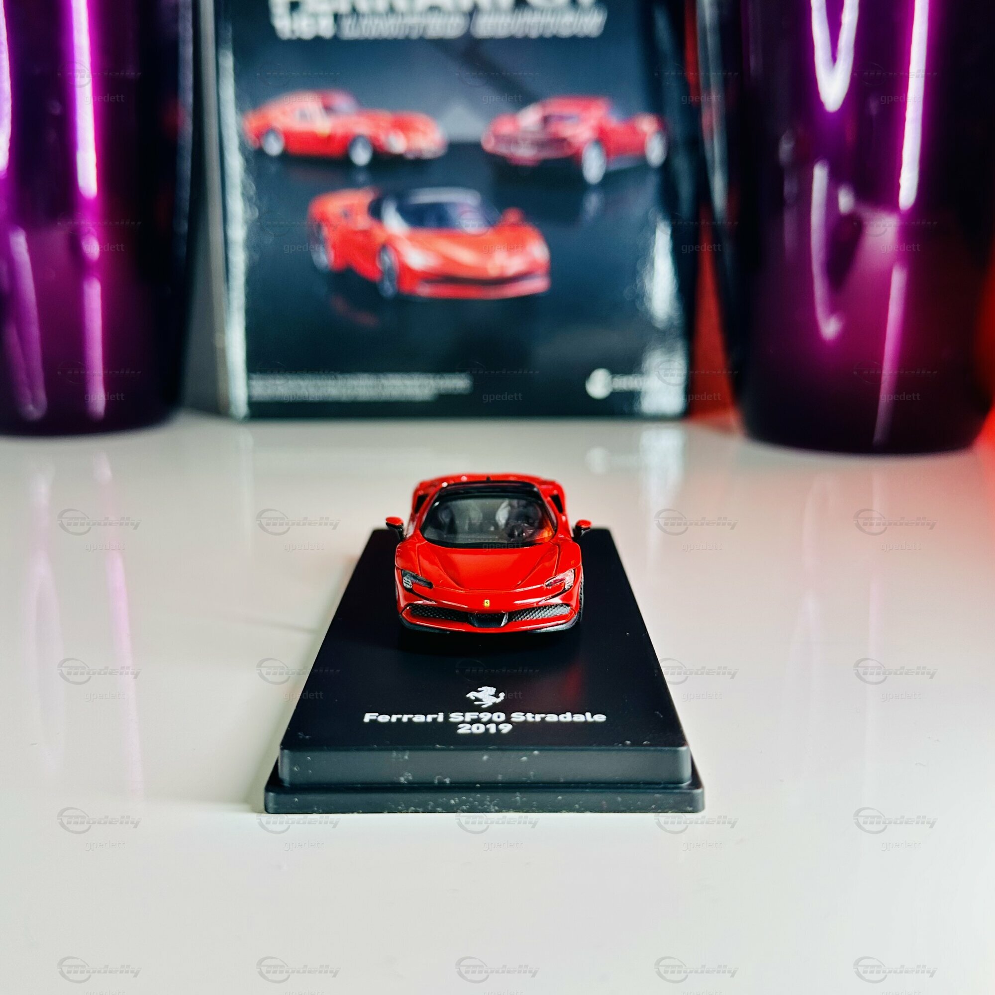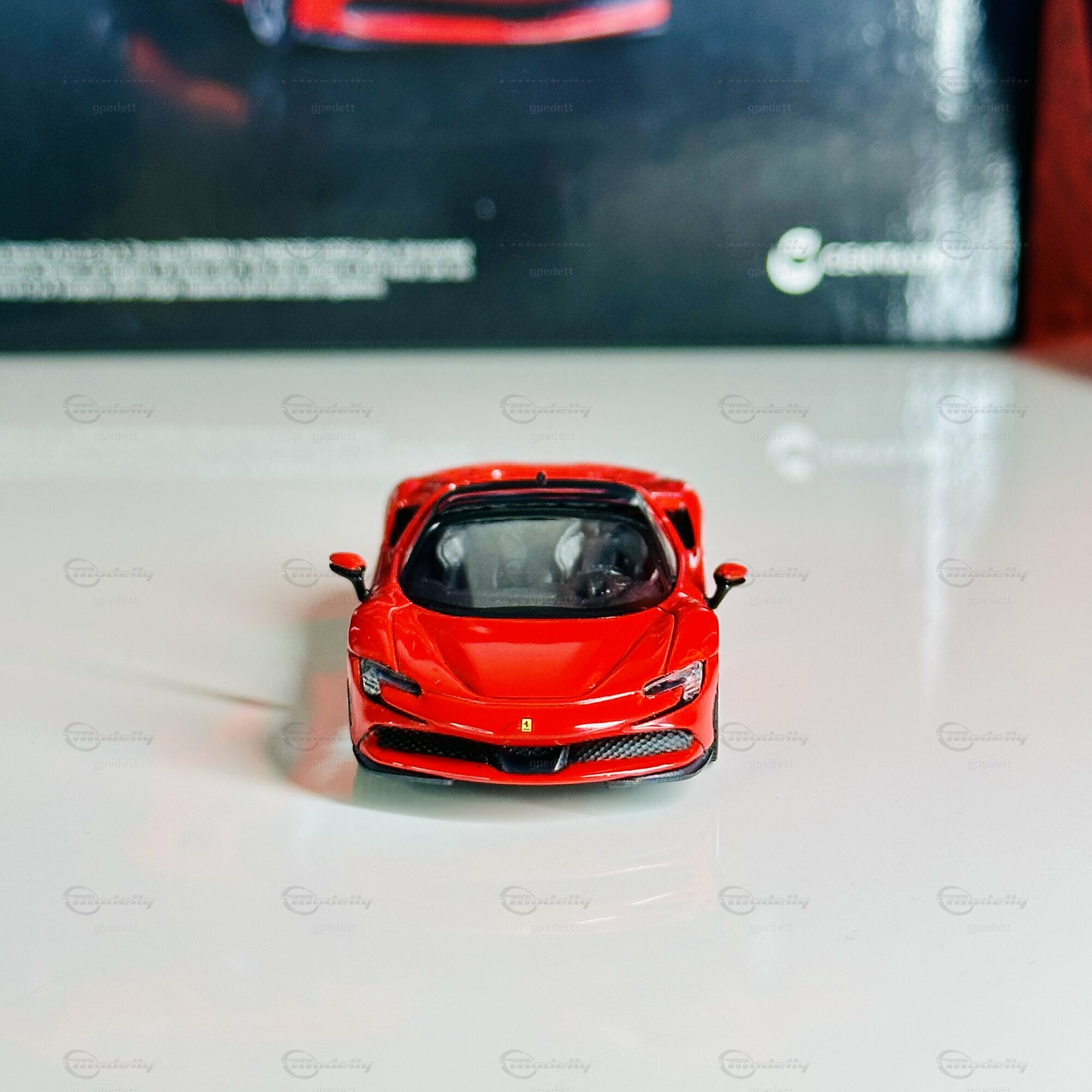Das hier gezeigte Modellauto von Centauria ist eine präzise Nachbildung des Ferrari SF90 Stradale im Maßstab 1:64 und wurde aus hochwertigem Diecast-Material hergestellt. Es besticht durch seine Detailtreue und Realismus. Die Lackierung spiegelt das leuchtende Rot des Originalfahrzeugs wider und ist mit den typischen Ferrari-Badges versehen. Jedes Detail, von den Scheinwerfern bis zu den feinen Linien der Karosserie, wurde sorgfältig nachgebildet. Die klar definierten Formen und komplexen Strukturen machen dieses Modell zu einem faszinierenden Stück für Sammler. Das Markenlogo und die Schriftzüge von Ferrari sind ebenfalls exakt nachgebildet und verleihen dem Modell ein authentisches Erscheinungsbild. Dieses Modell ist Teil der Sammlung des Modelly-Mitglieds "gpedett" und zeugt von der Qualität der Arbeit von Centauria.