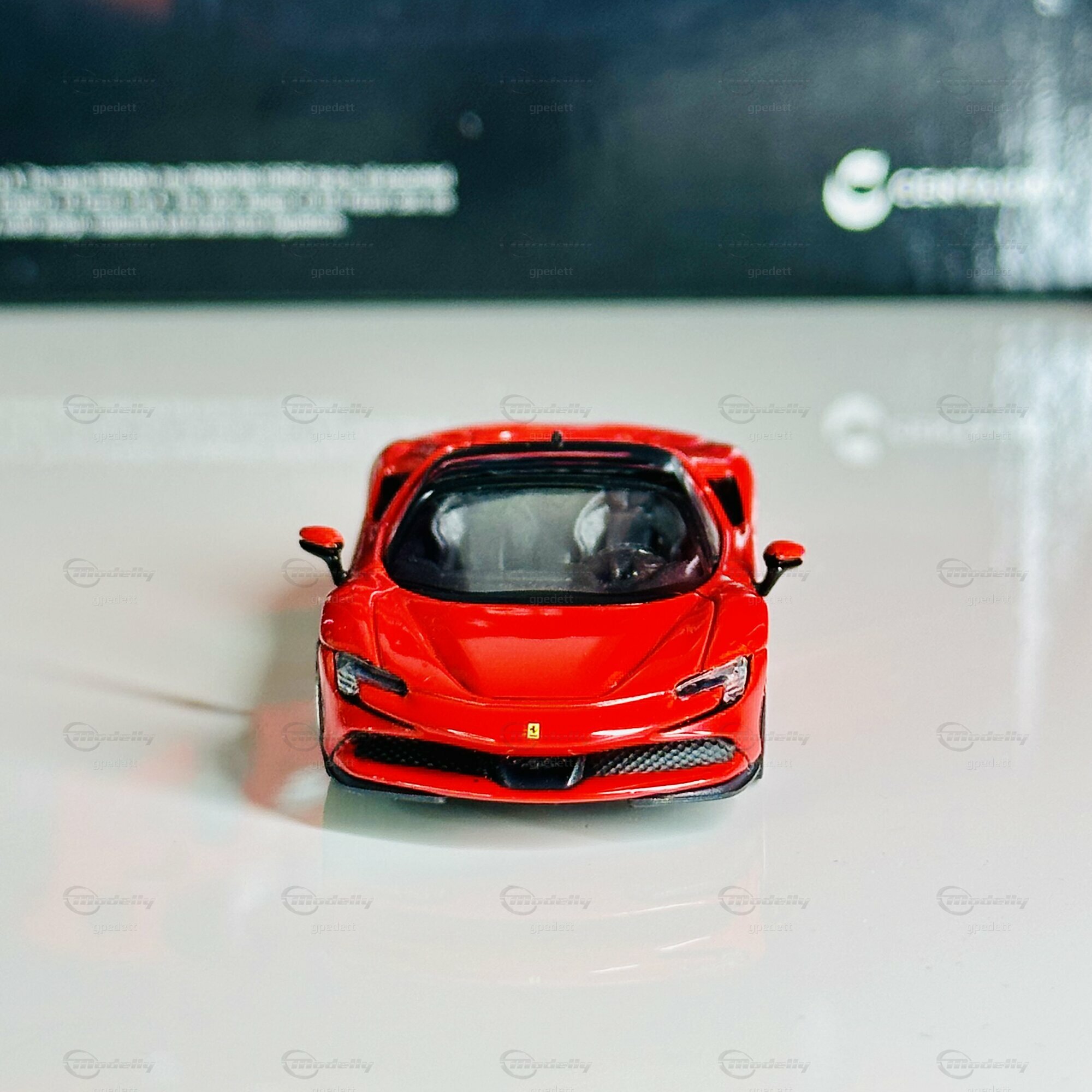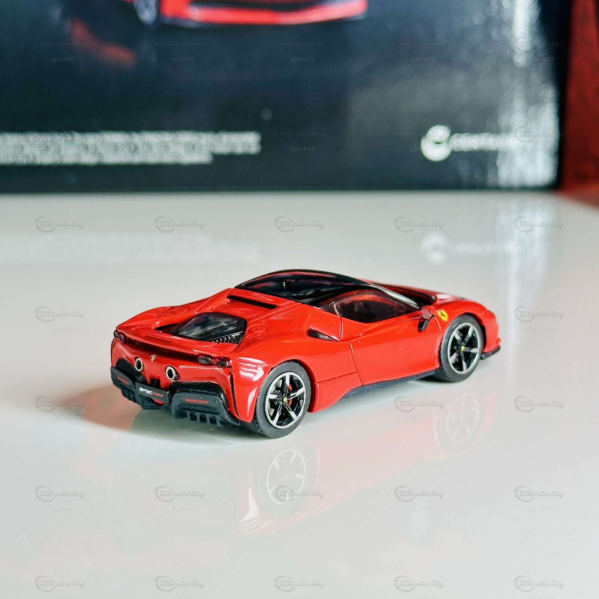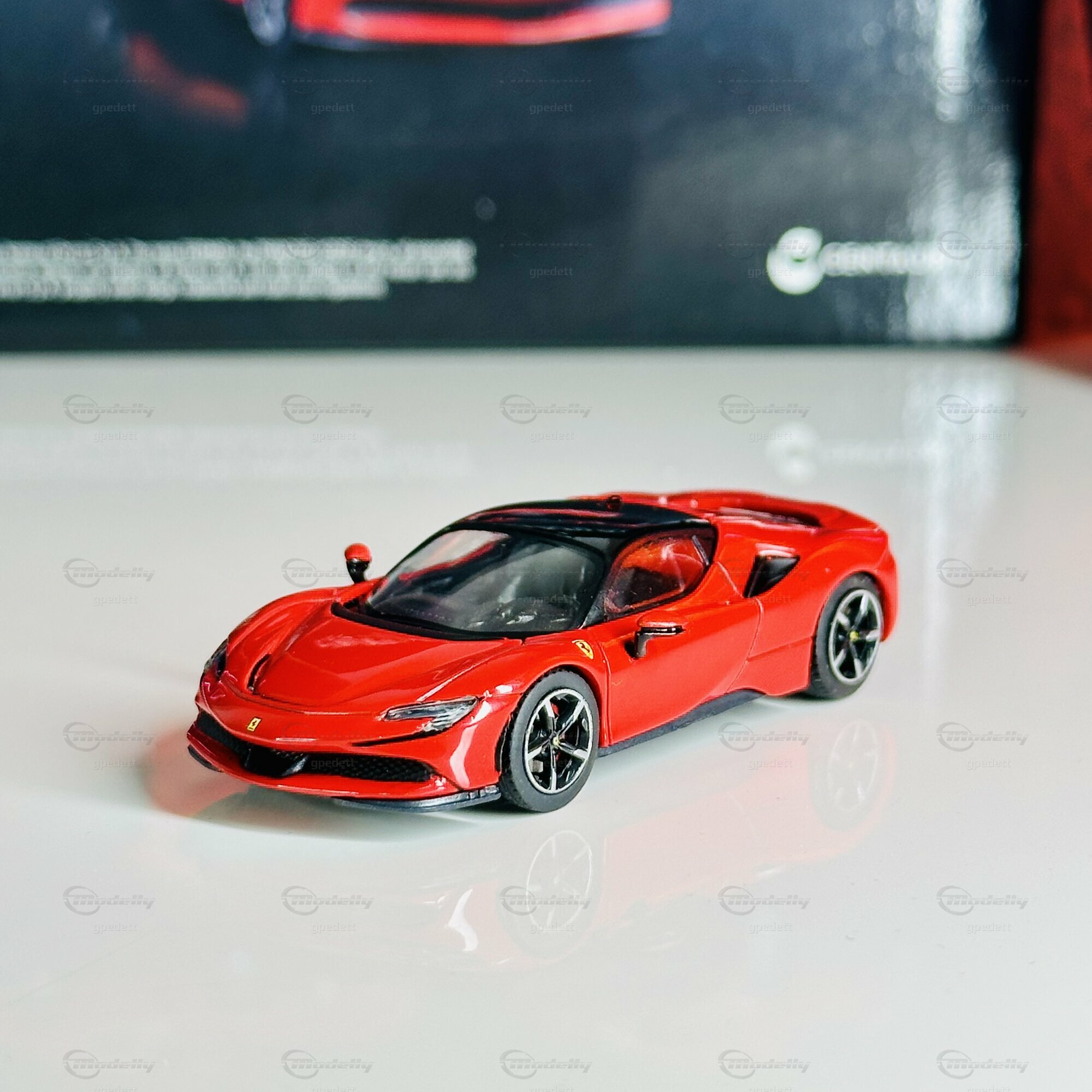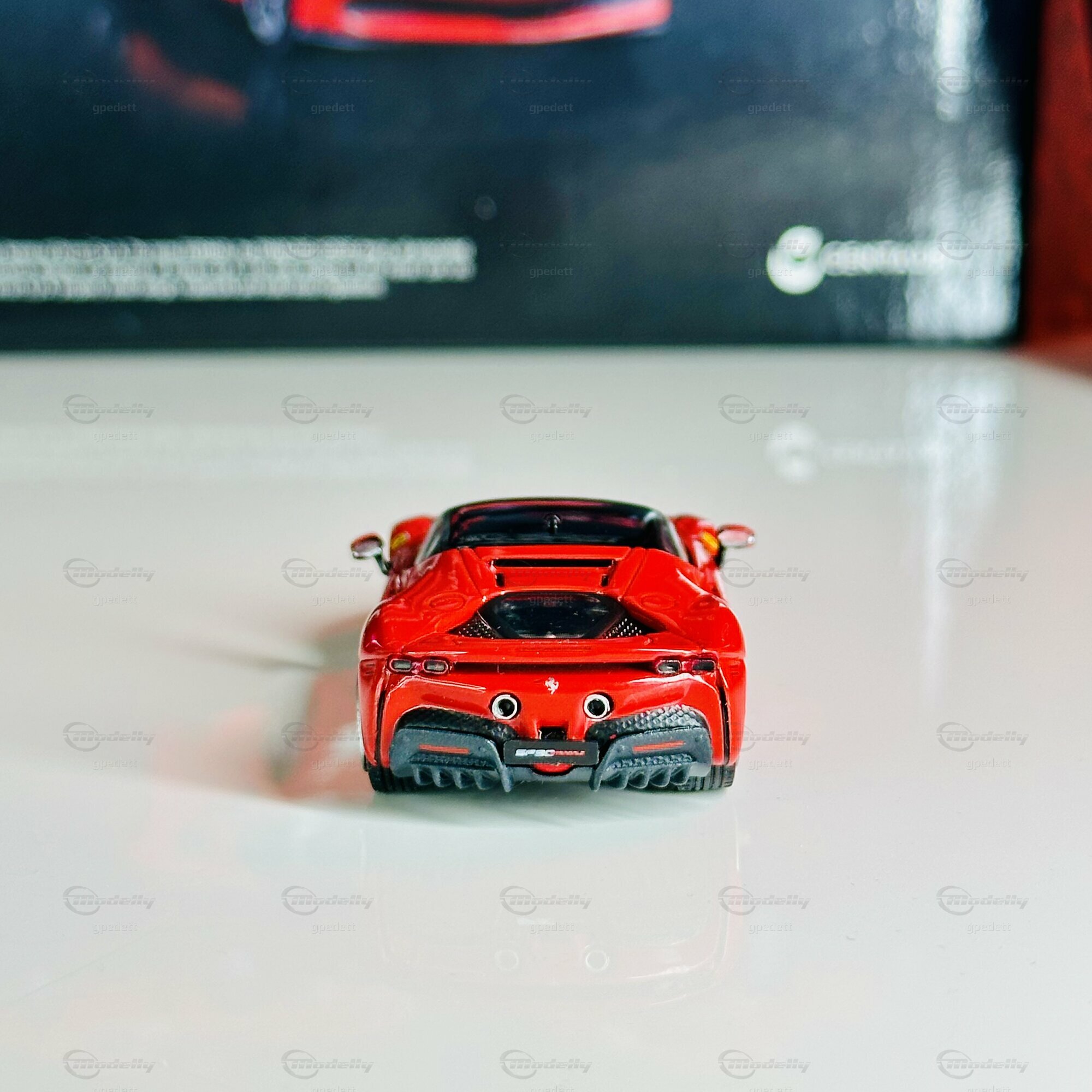 Das hier gezeigte Modellauto von Centauria ist eine präzise Nachbildung des Ferrari SF90 Stradale im Maßstab 1:64 und wurde aus hochwertigem Diecast-Material hergestellt. Es besticht durch seine Detailtreue und Realismus. Die Lackierung spiegelt das leuchtende Rot des Originalfahrzeugs wider und ist mit den typischen Ferrari-Badges versehen. Jedes Detail, von den Scheinwerfern bis zu den feinen Linien der Karosserie, wurde sorgfältig nachgebildet. Die klar definierten Formen und komplexen Strukturen machen dieses Modell zu einem faszinierenden Stück für Sammler. Das Markenlogo und die Schriftzüge von Ferrari sind ebenfalls exakt nachgebildet und verleihen dem Modell ein authentisches Erscheinungsbild. Dieses Modell ist Teil der Sammlung des Modelly-Mitglieds "gpedett" und zeugt von der Qualität der Arbeit von Centauria.