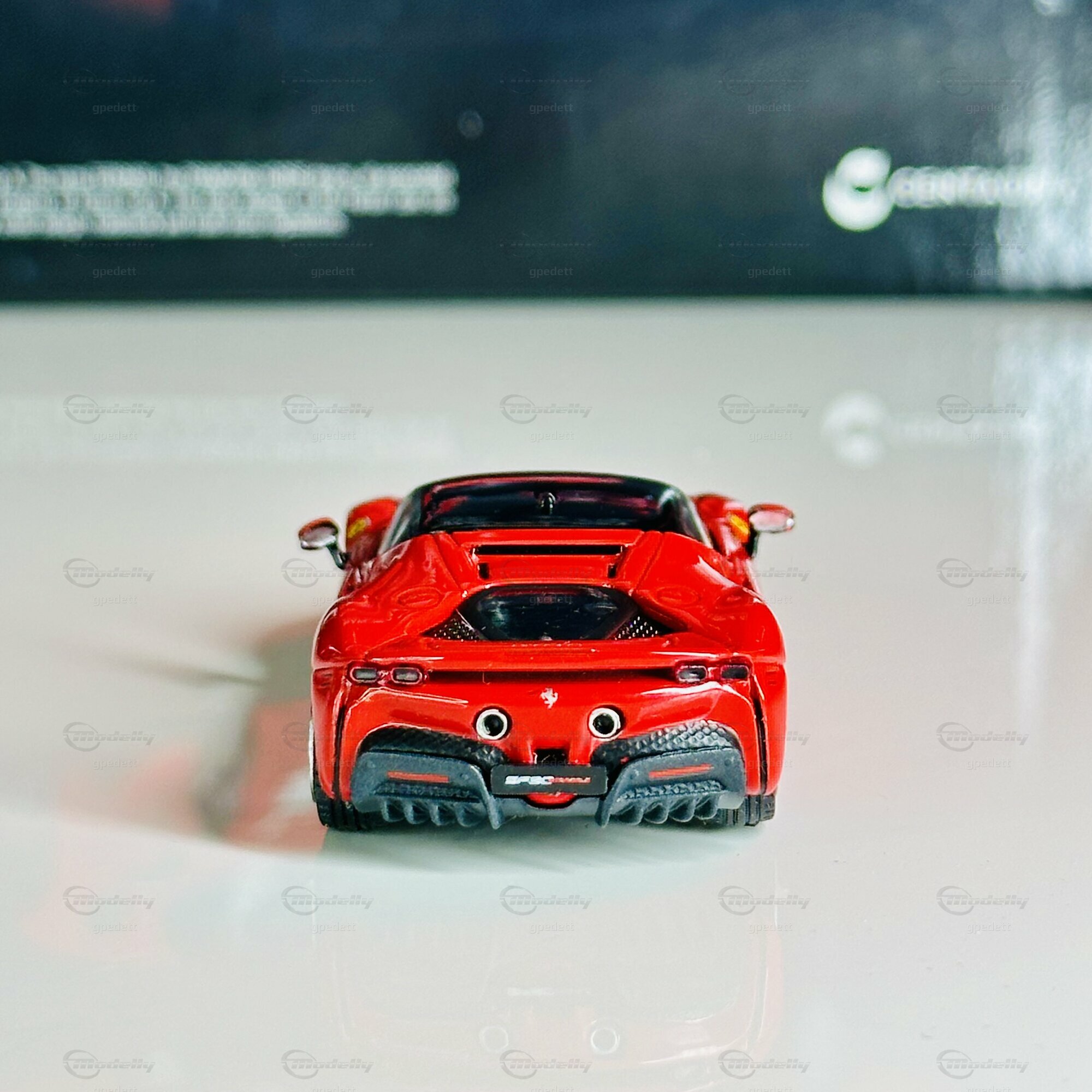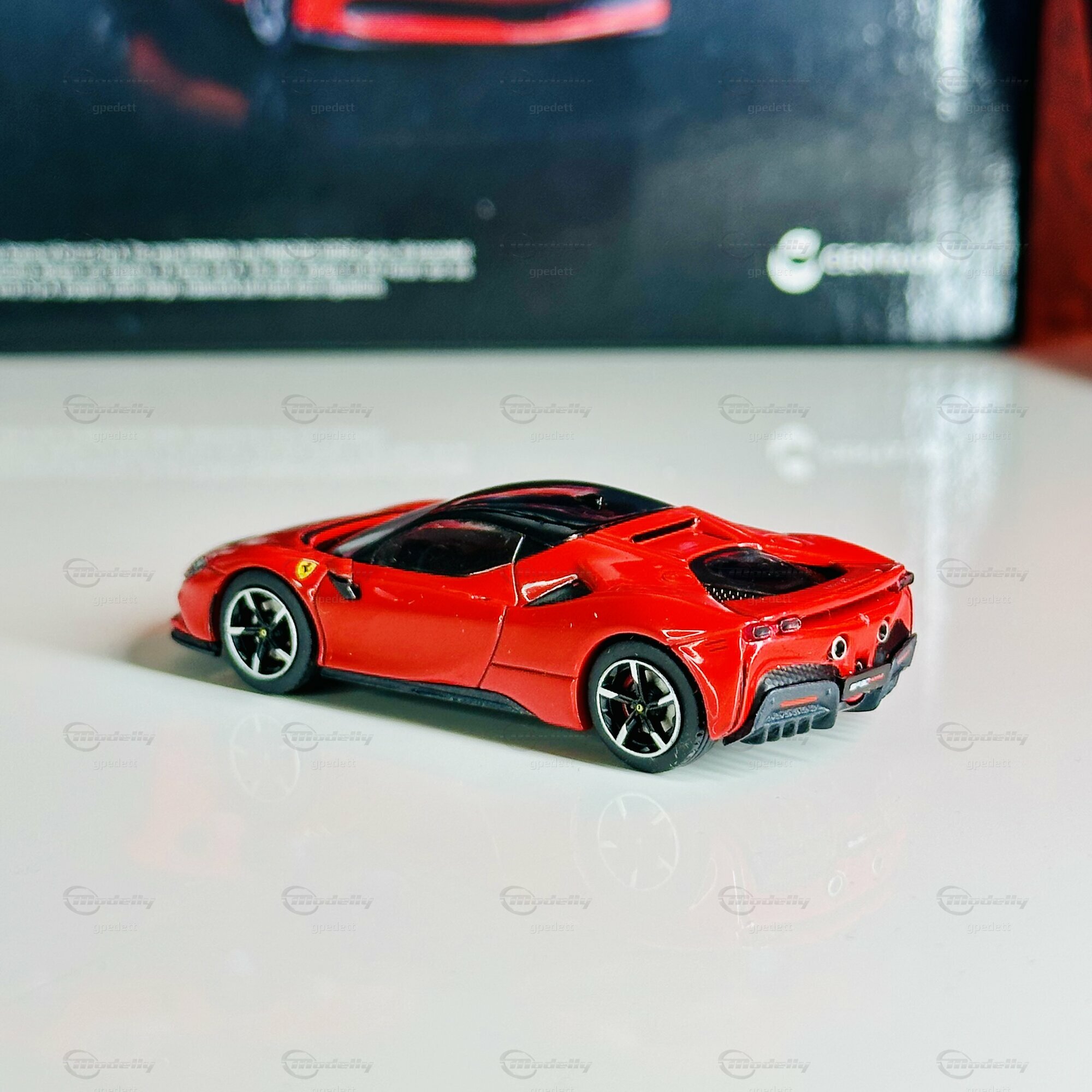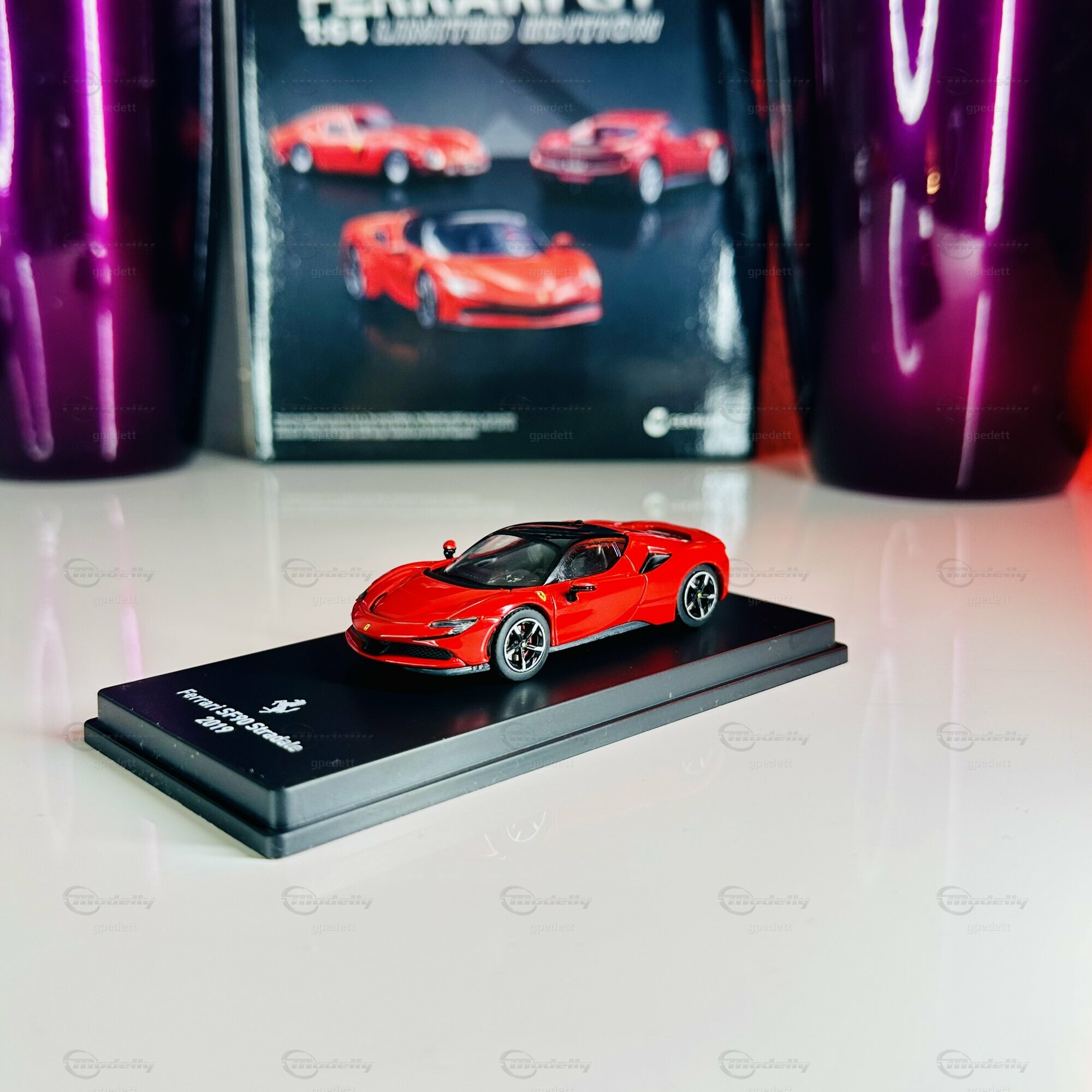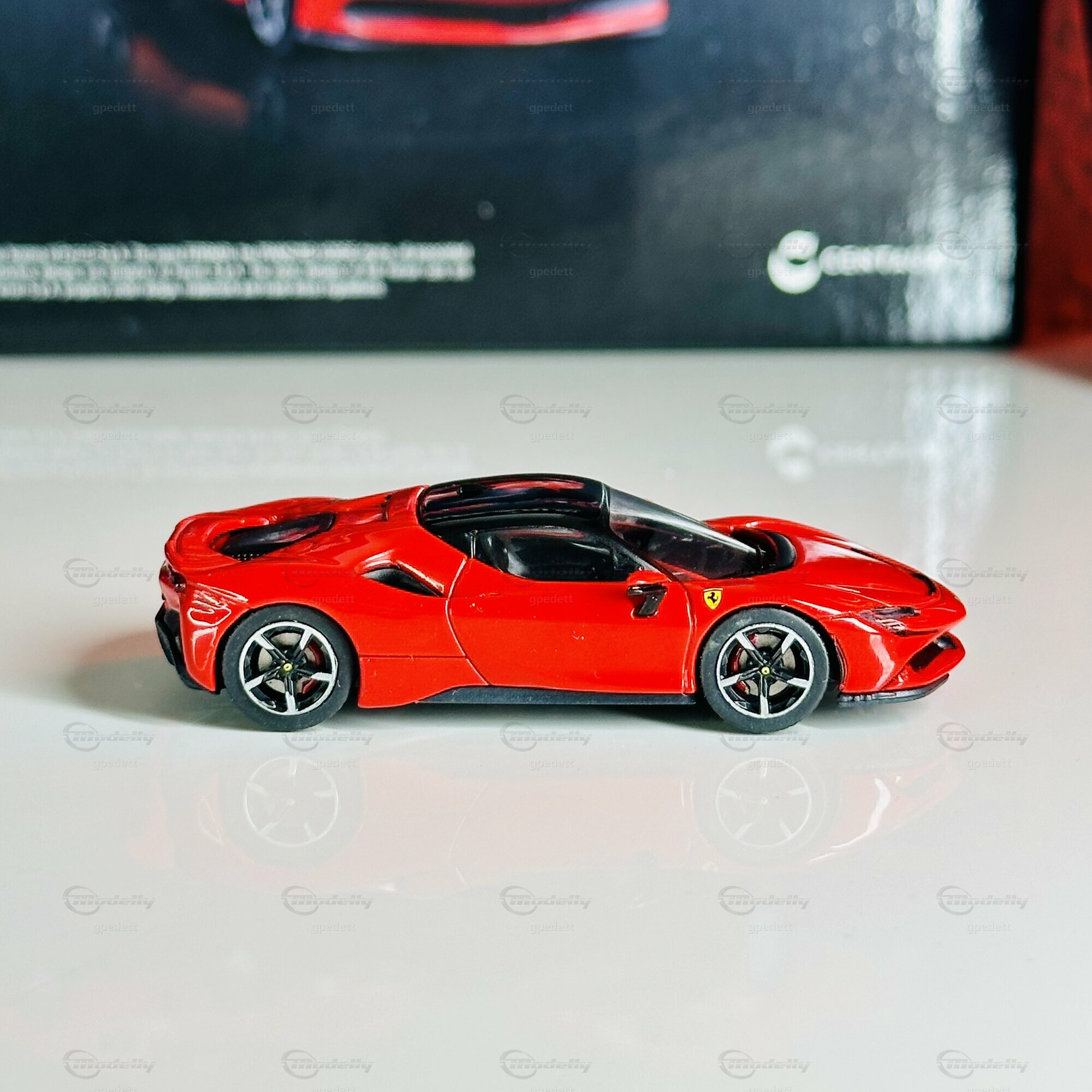 Das hier gezeigte Modellauto von Centauria ist eine präzise Nachbildung des Ferrari SF90 Stradale im Maßstab 1:64 und wurde aus hochwertigem Diecast-Material hergestellt. Es besticht durch seine Detailtreue und Realismus. Die Lackierung spiegelt das leuchtende Rot des Originalfahrzeugs wider und ist mit den typischen Ferrari-Badges versehen. Jedes Detail, von den Scheinwerfern bis zu den feinen Linien der Karosserie, wurde sorgfältig nachgebildet. Die klar definierten Formen und komplexen Strukturen machen dieses Modell zu einem faszinierenden Stück für Sammler. Das Markenlogo und die Schriftzüge von Ferrari sind ebenfalls exakt nachgebildet und verleihen dem Modell ein authentisches Erscheinungsbild. Dieses Modell ist Teil der Sammlung des Modelly-Mitglieds "gpedett" und zeugt von der Qualität der Arbeit von Centauria.