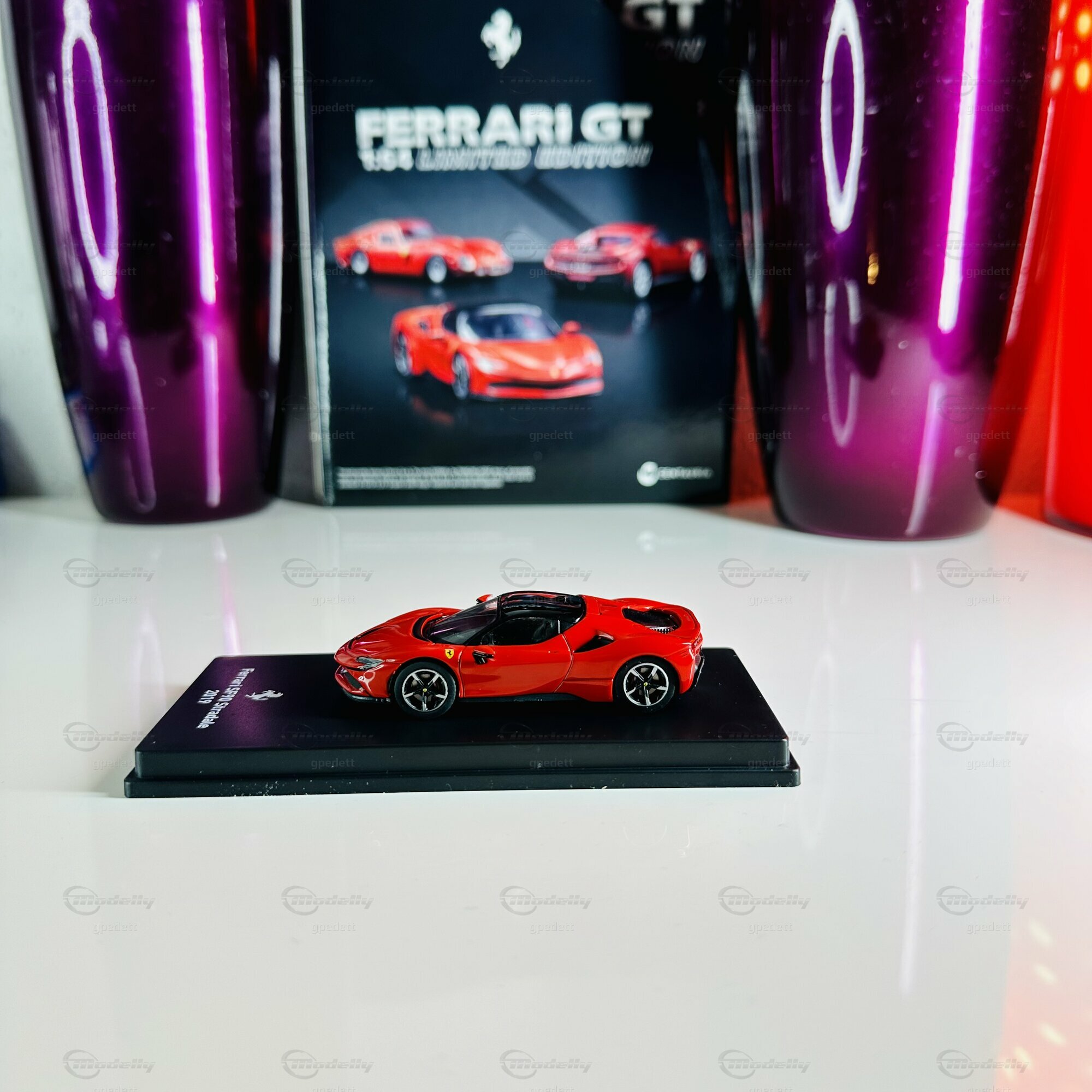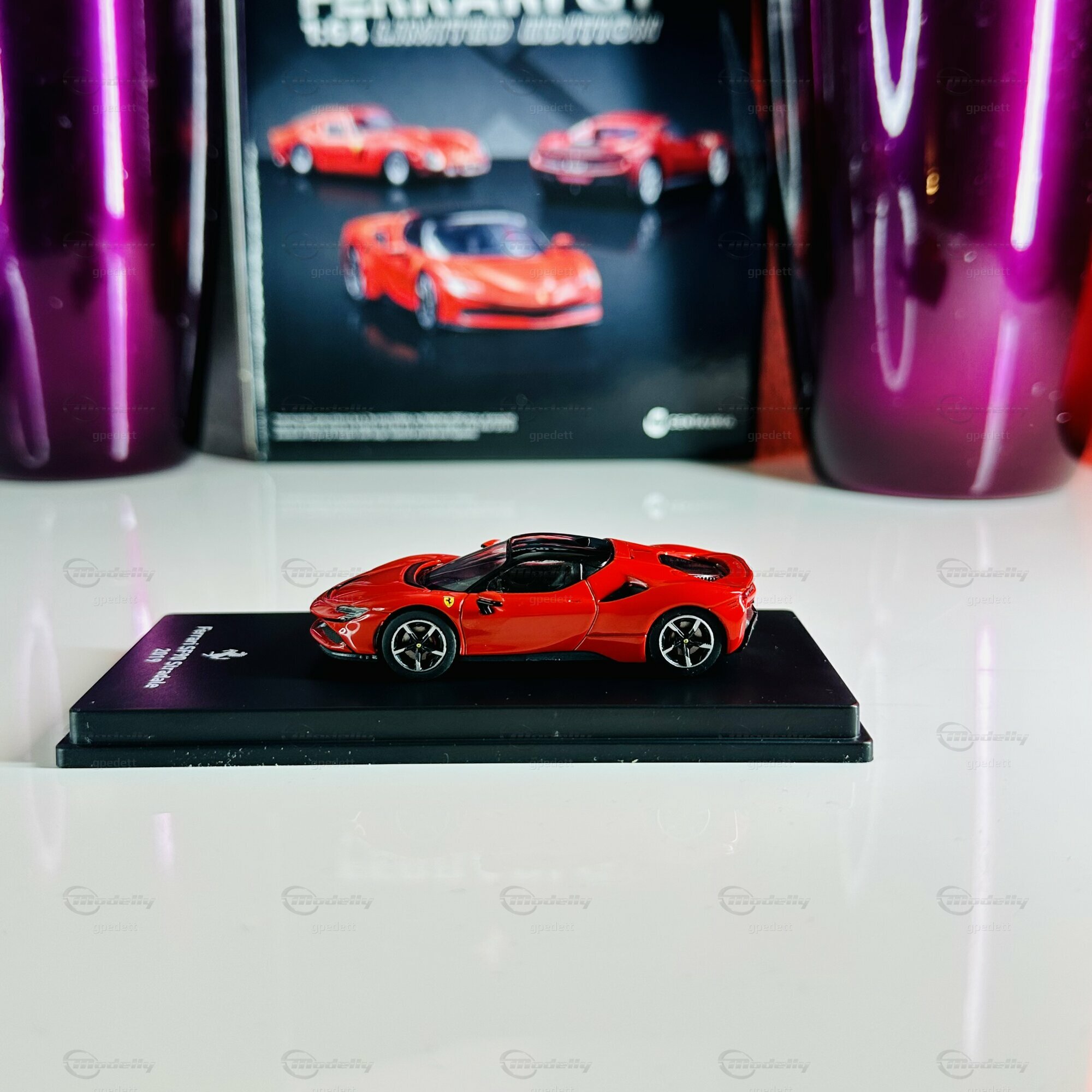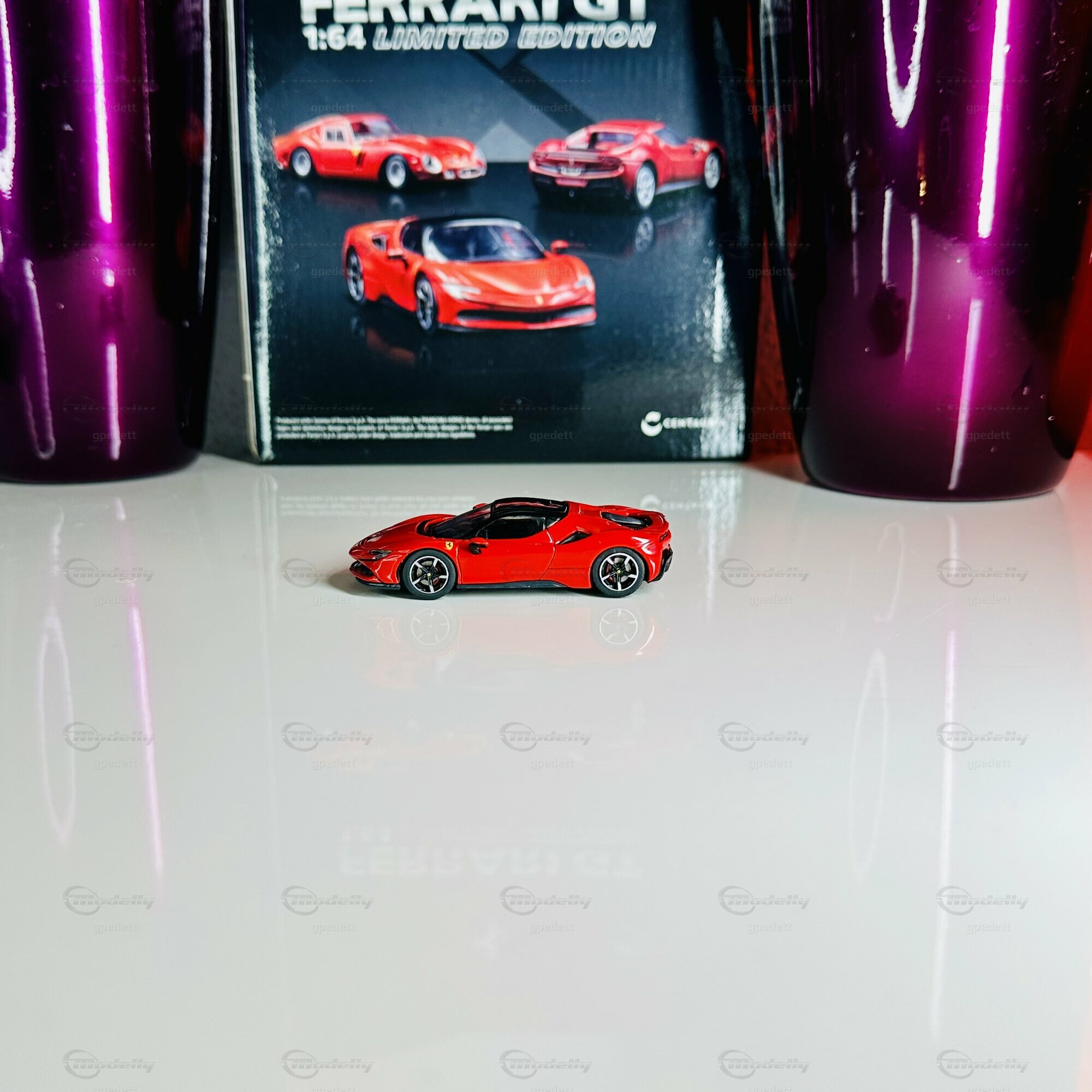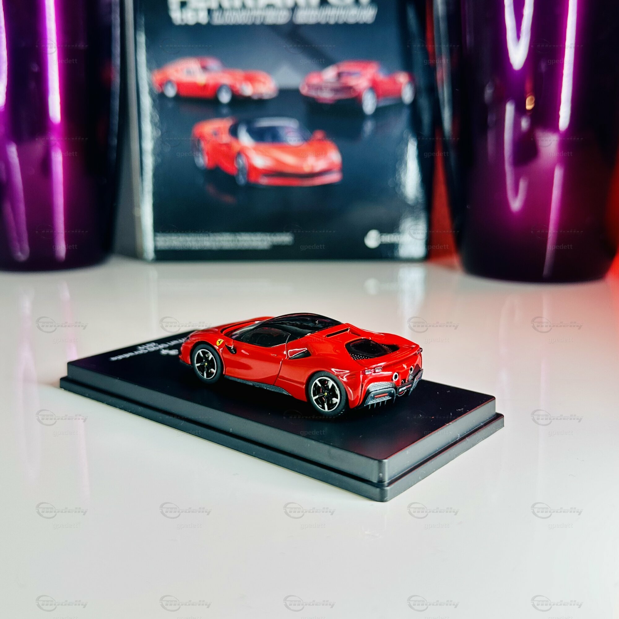Das hier gezeigte Modellauto von Centauria ist eine präzise Nachbildung des Ferrari SF90 Stradale im Maßstab 1:64 und wurde aus hochwertigem Diecast-Material hergestellt. Es besticht durch seine Detailtreue und Realismus. Die Lackierung spiegelt das leuchtende Rot des Originalfahrzeugs wider und ist mit den typischen Ferrari-Badges versehen. Jedes Detail, von den Scheinwerfern bis zu den feinen Linien der Karosserie, wurde sorgfältig nachgebildet. Die klar definierten Formen und komplexen Strukturen machen dieses Modell zu einem faszinierenden Stück für Sammler. Das Markenlogo und die Schriftzüge von Ferrari sind ebenfalls exakt nachgebildet und verleihen dem Modell ein authentisches Erscheinungsbild. Dieses Modell ist Teil der Sammlung des Modelly-Mitglieds "gpedett" und zeugt von der Qualität der Arbeit von Centauria.