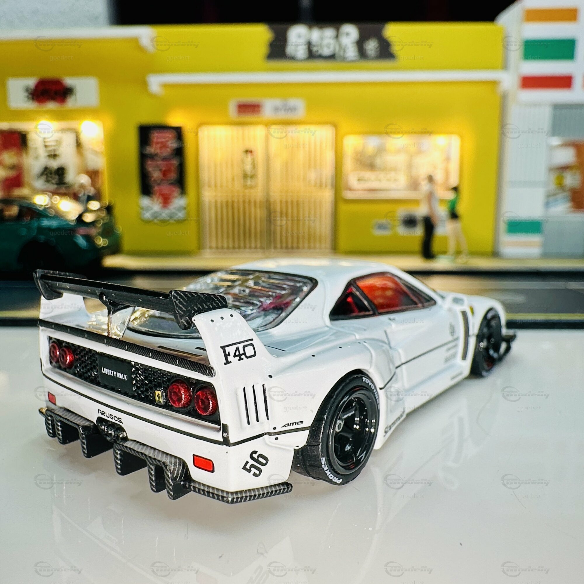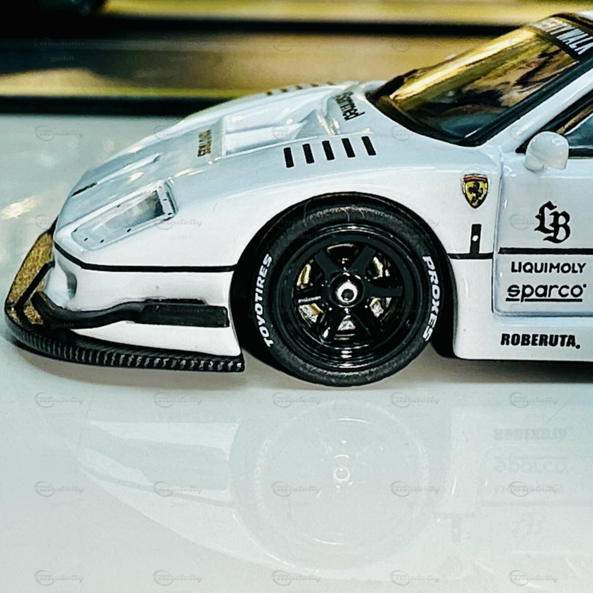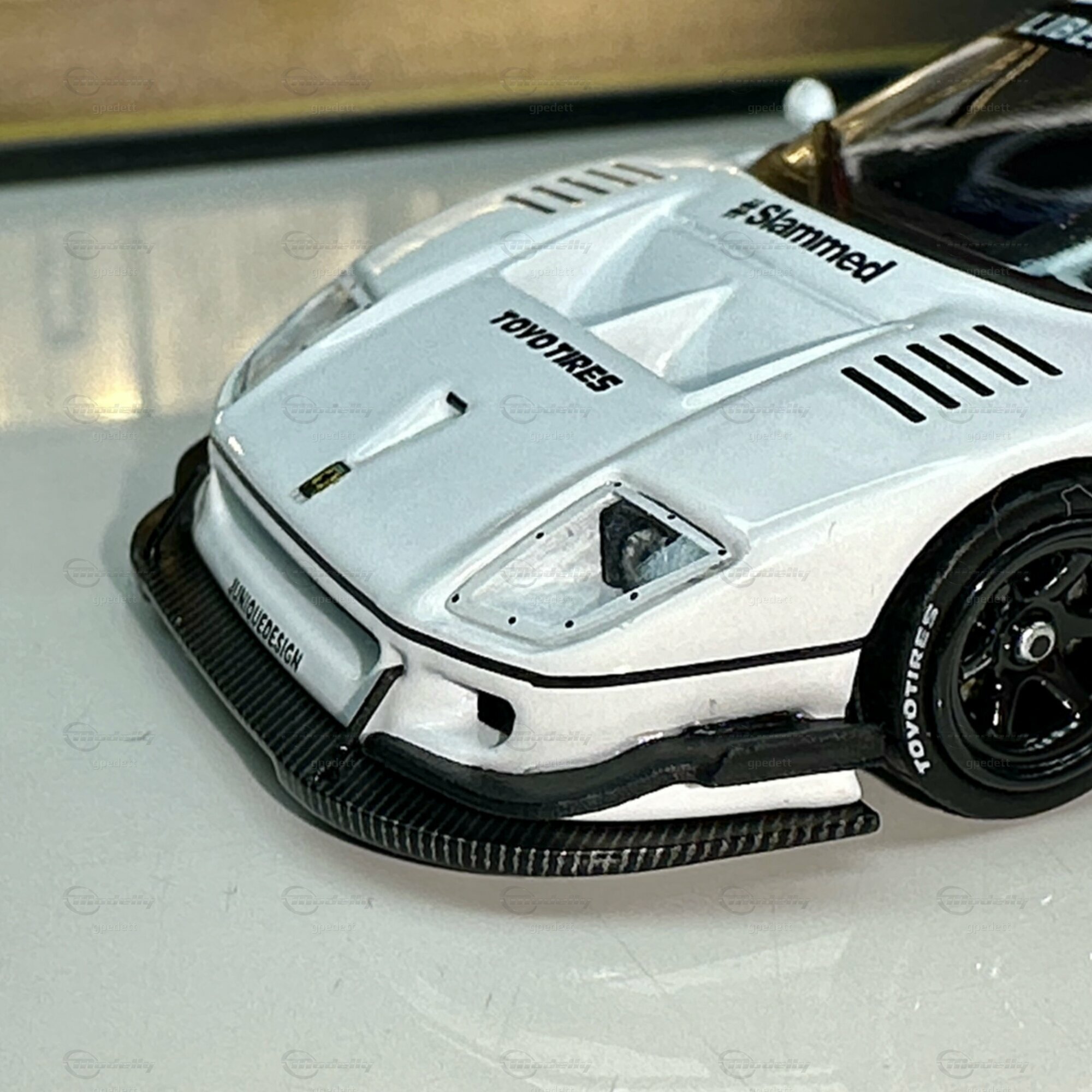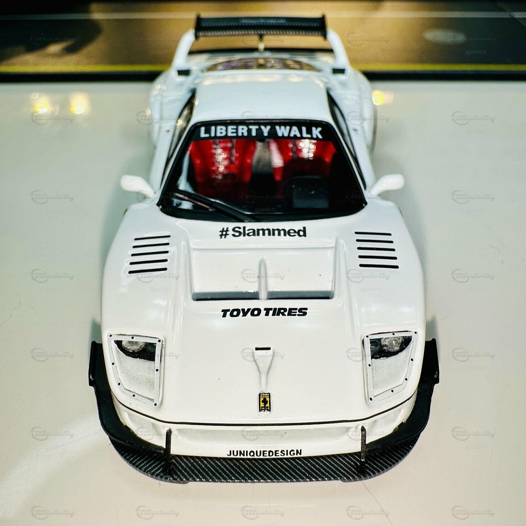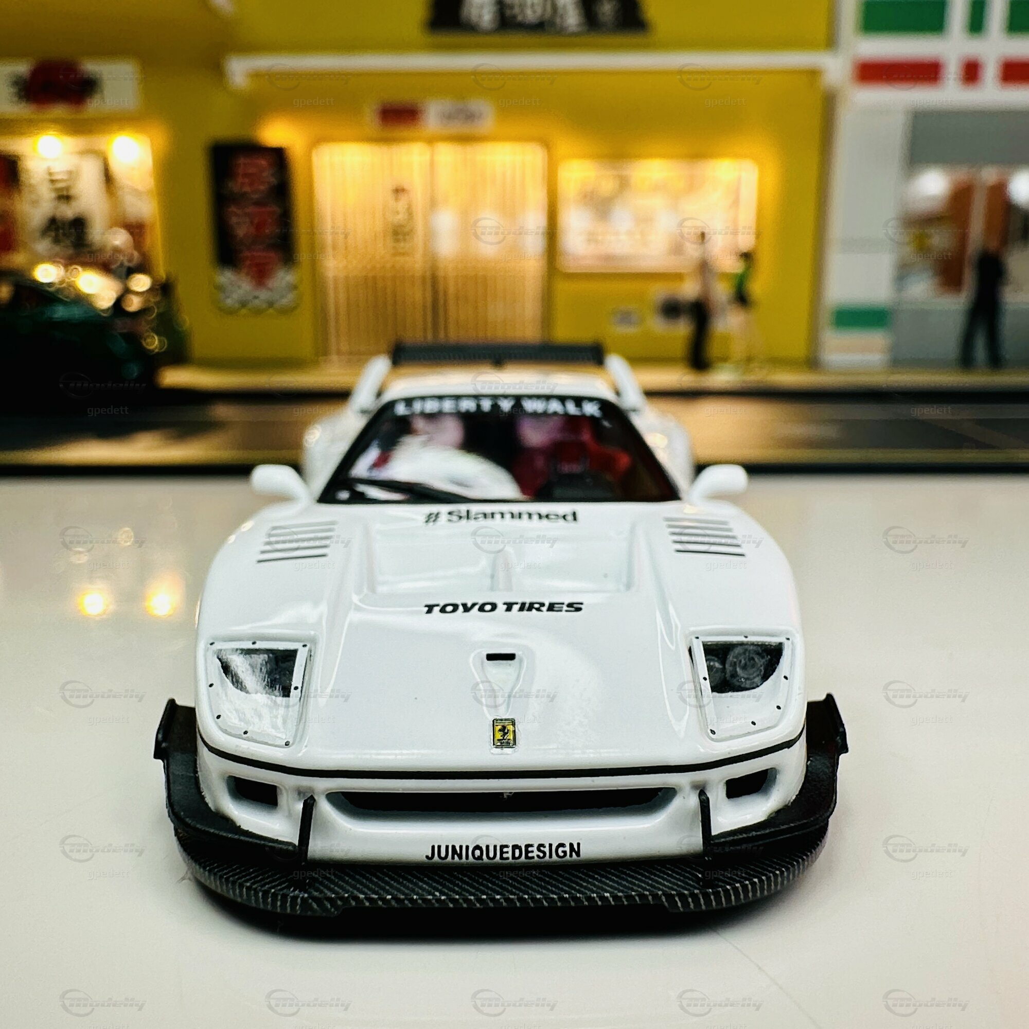 Das 1:64-Modell von Innomodels 64 ist eine detailtreue Nachbildung des Ferrari F40, die sich durch beeindruckende Präzision und Qualität auszeichnet. Dieses Modell, das Teil der Sammlung des Modelly-Mitglieds "gpedett" ist, reflektiert das ikonische Design und die fortschrittlichen technischen Details des Originals. Gefertigt aus hochwertigem Diecast-Material, ist das Modell auf die Bedürfnisse von Sammlern weltweit zugeschnitten. Besonders auffällig sind die zahlreichen Sponsorenlogos, die das Fahrzeug zieren, darunter Liberty Walk, Toyo Tires und Sparco. Die Bemalung in einem eleganten Weiß mit schwarzen Akzenten hebt die scharfen Linien und Dihedral-Türen hervor.