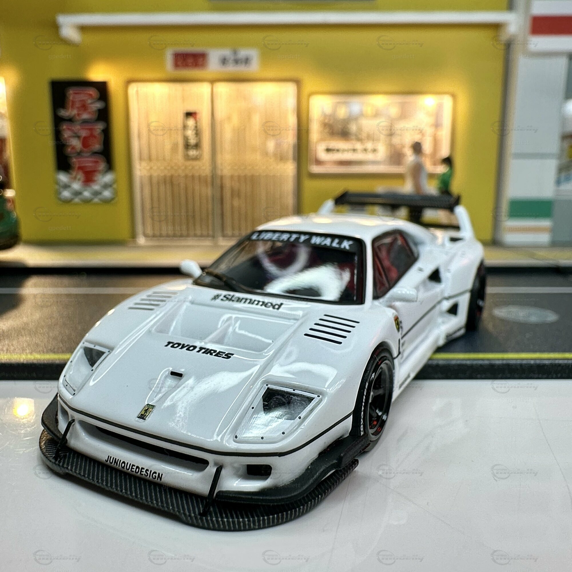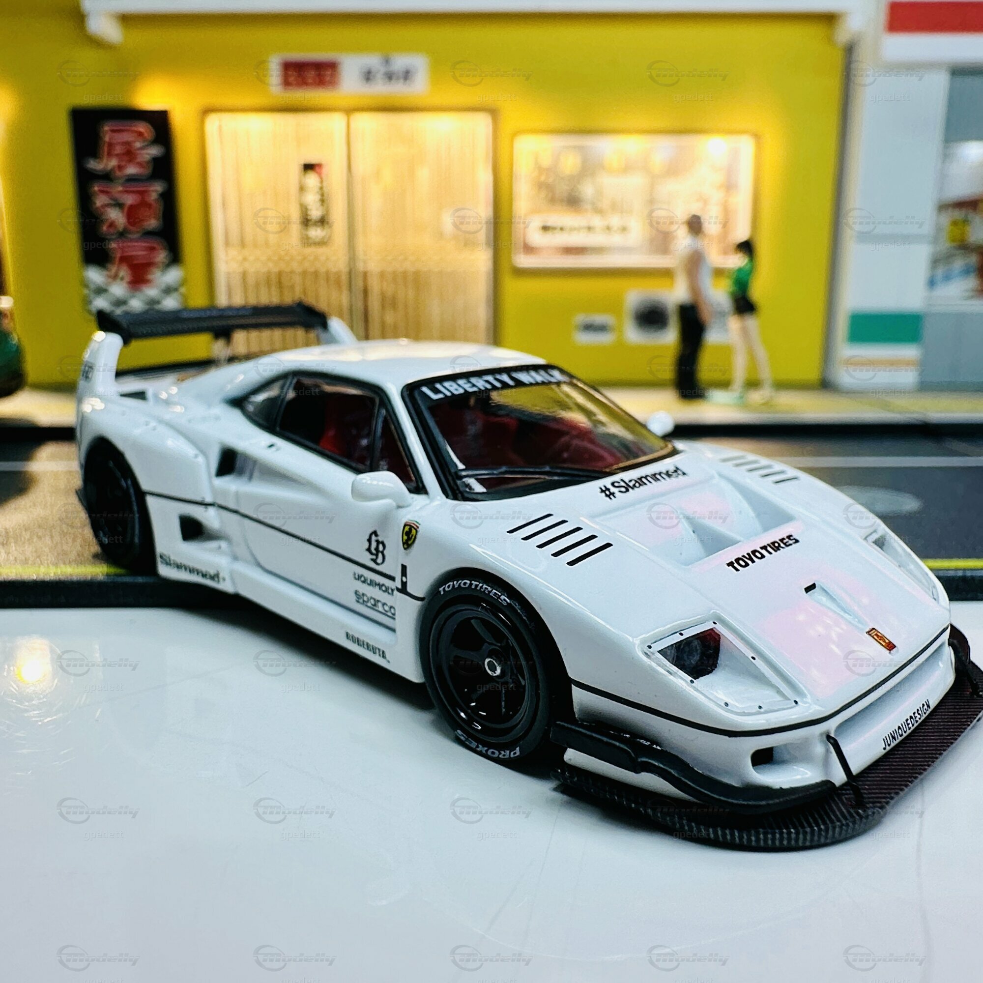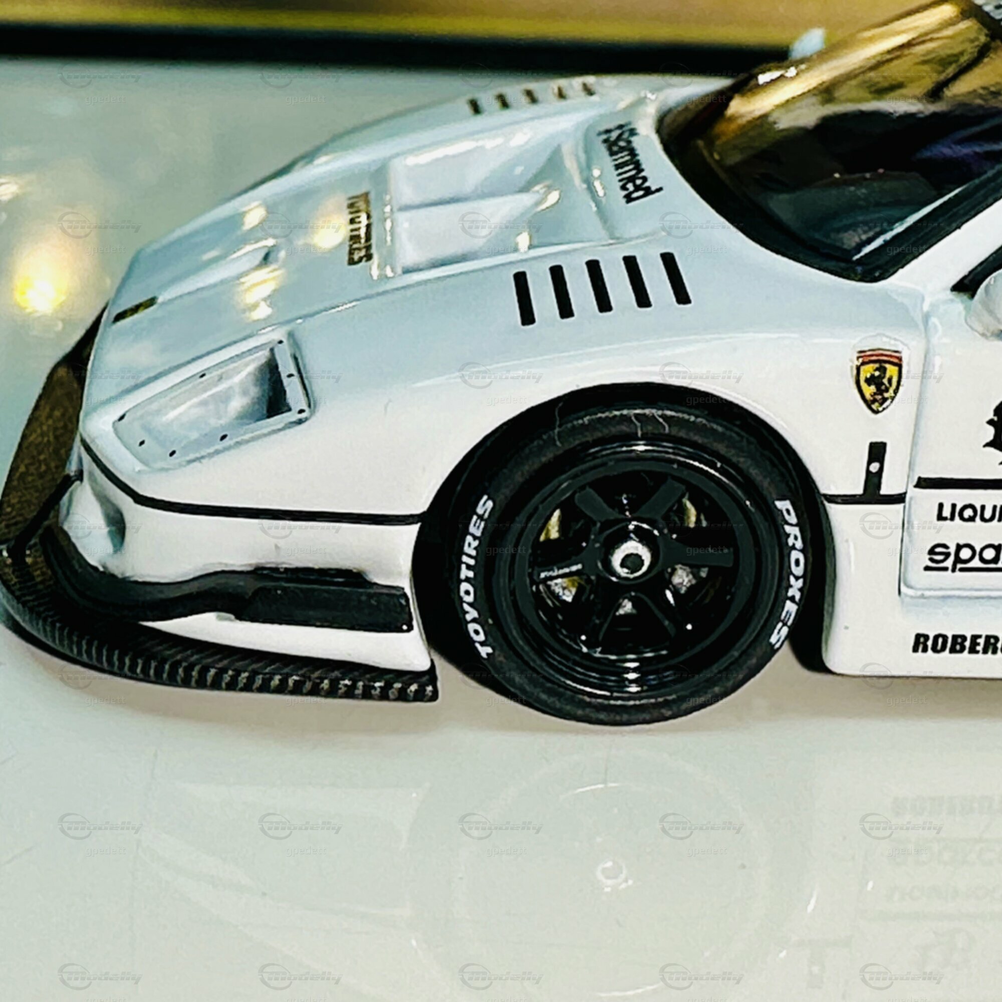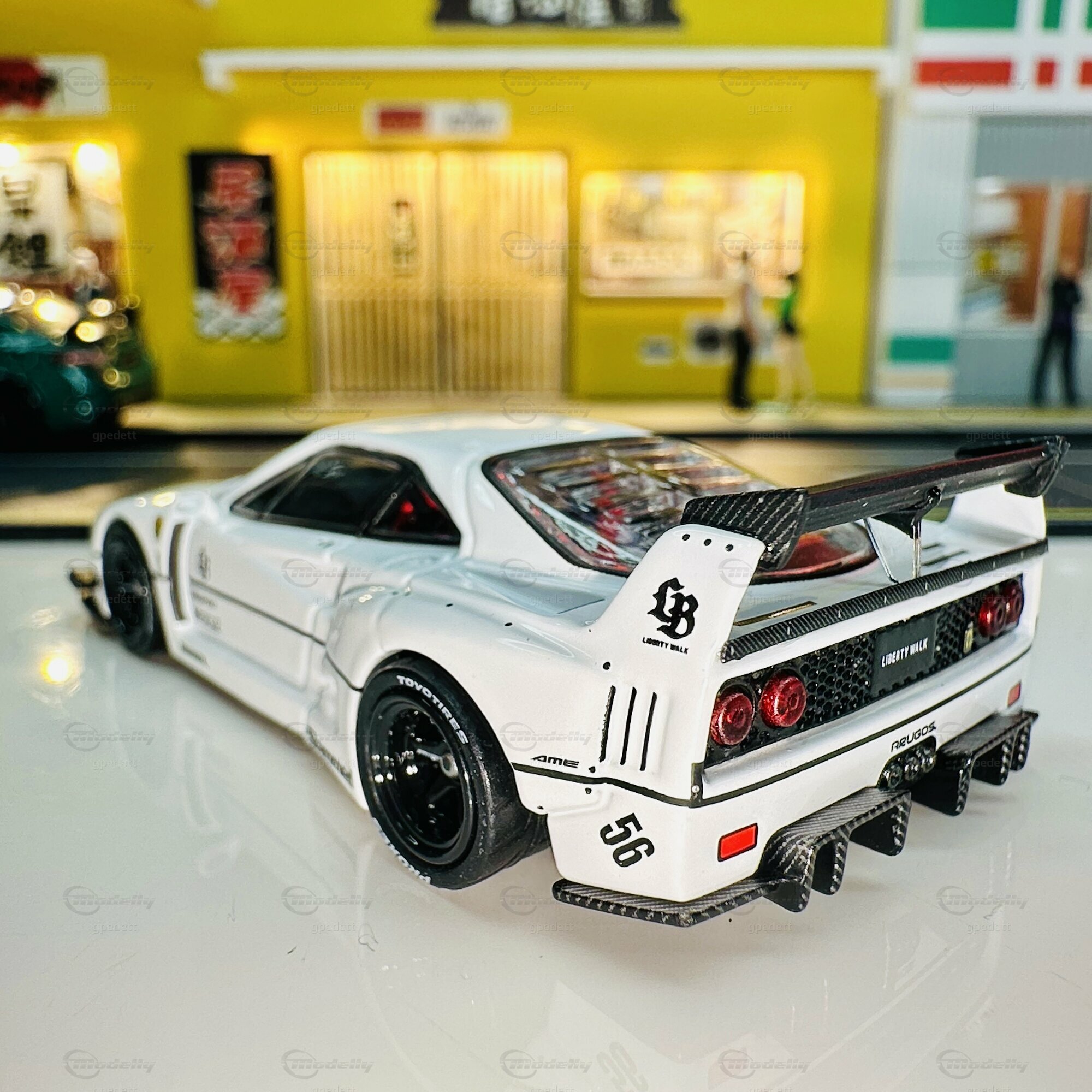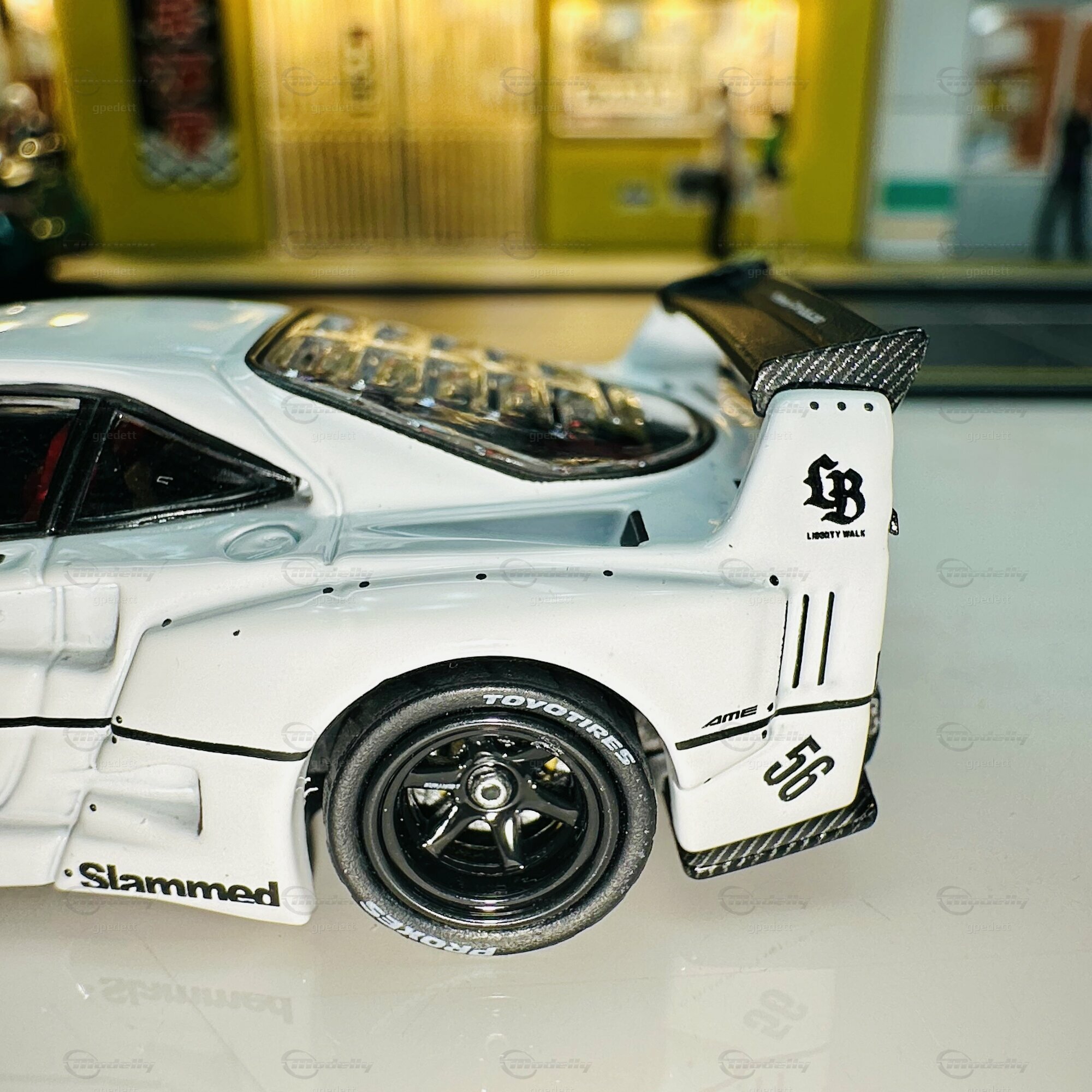 Das 1:64-Modell von Innomodels 64 ist eine detailtreue Nachbildung des Ferrari F40, die sich durch beeindruckende Präzision und Qualität auszeichnet. Dieses Modell, das Teil der Sammlung des Modelly-Mitglieds "gpedett" ist, reflektiert das ikonische Design und die fortschrittlichen technischen Details des Originals. Gefertigt aus hochwertigem Diecast-Material, ist das Modell auf die Bedürfnisse von Sammlern weltweit zugeschnitten. Besonders auffällig sind die zahlreichen Sponsorenlogos, die das Fahrzeug zieren, darunter Liberty Walk, Toyo Tires und Sparco. Die Bemalung in einem eleganten Weiß mit schwarzen Akzenten hebt die scharfen Linien und Dihedral-Türen hervor.