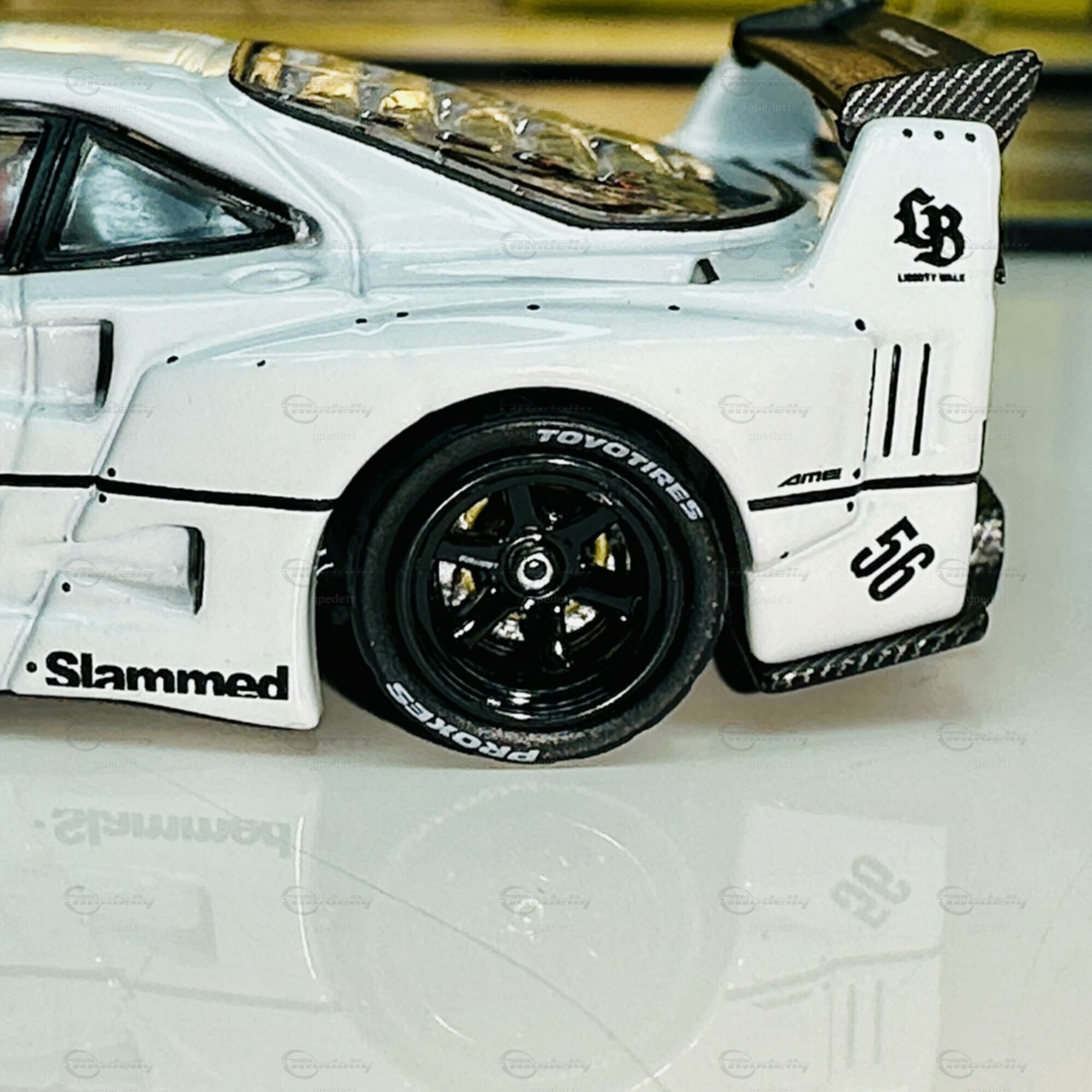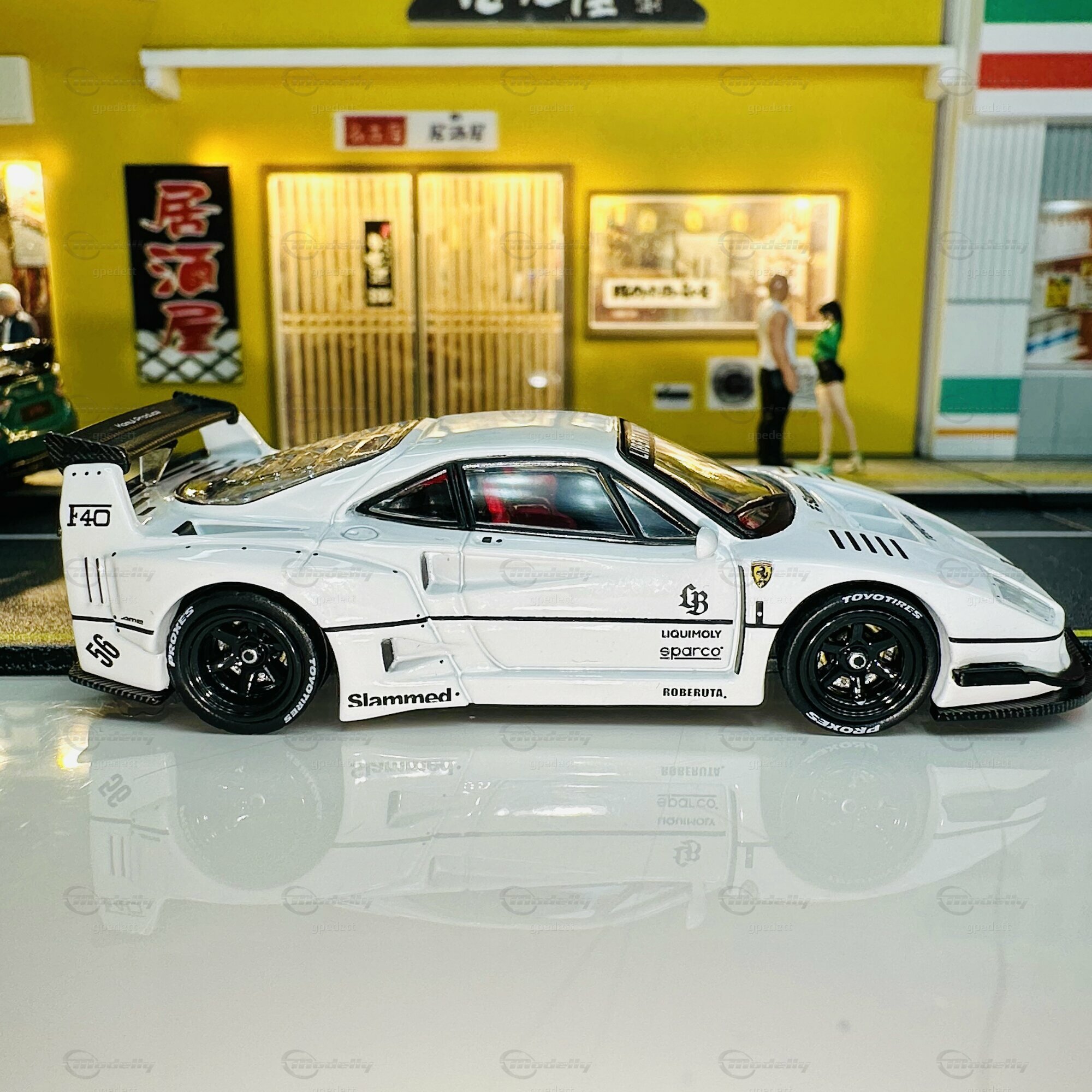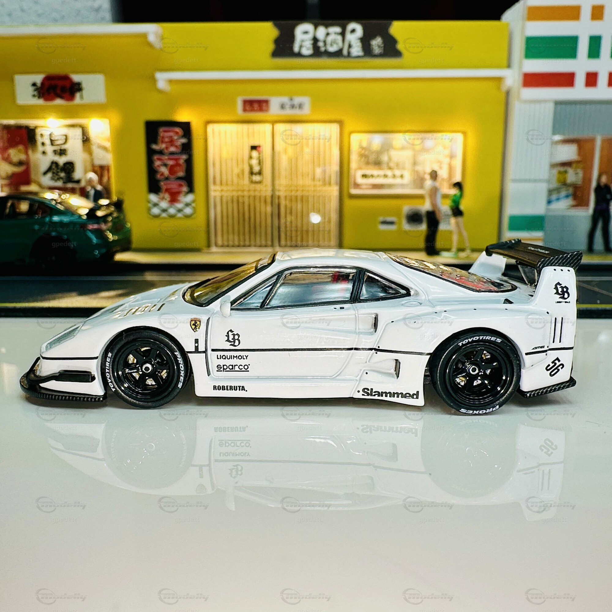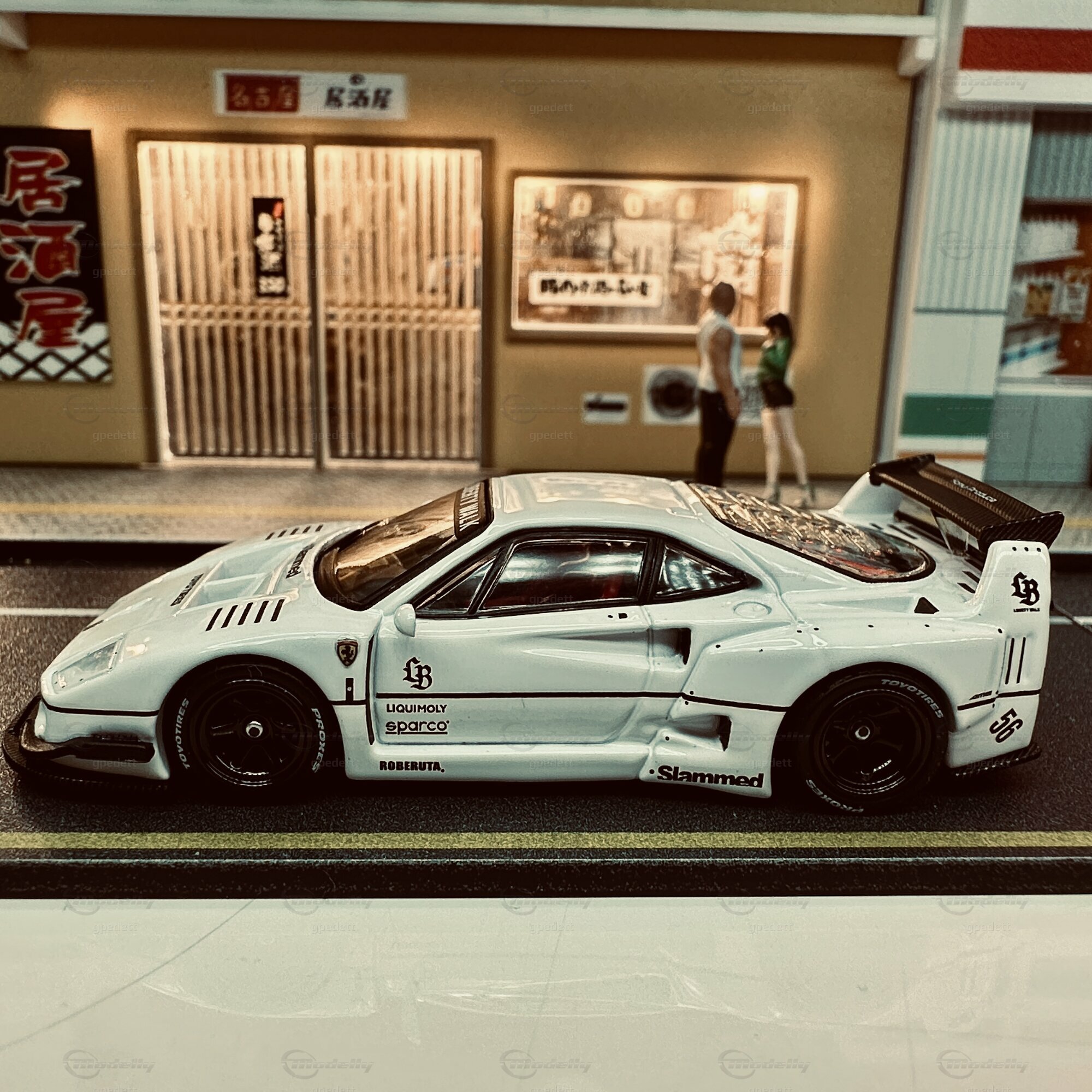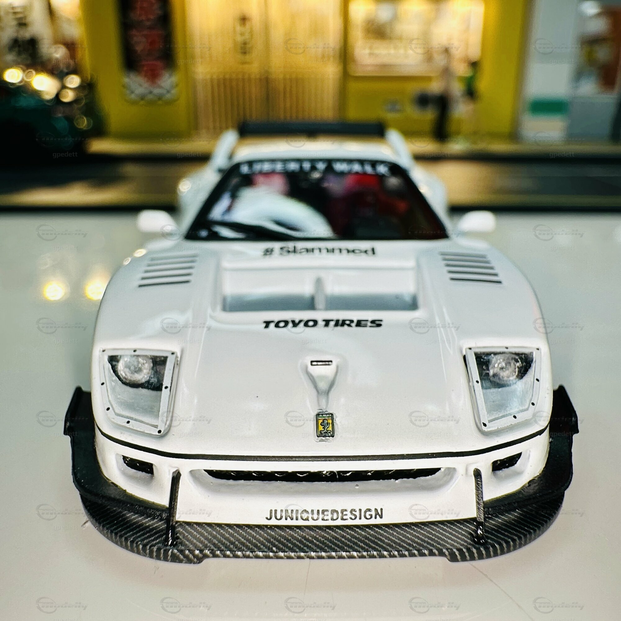 Das 1:64-Modell von Innomodels 64 ist eine detailtreue Nachbildung des Ferrari F40, die sich durch beeindruckende Präzision und Qualität auszeichnet. Dieses Modell, das Teil der Sammlung des Modelly-Mitglieds "gpedett" ist, reflektiert das ikonische Design und die fortschrittlichen technischen Details des Originals. Gefertigt aus hochwertigem Diecast-Material, ist das Modell auf die Bedürfnisse von Sammlern weltweit zugeschnitten. Besonders auffällig sind die zahlreichen Sponsorenlogos, die das Fahrzeug zieren, darunter Liberty Walk, Toyo Tires und Sparco. Die Bemalung in einem eleganten Weiß mit schwarzen Akzenten hebt die scharfen Linien und Dihedral-Türen hervor.