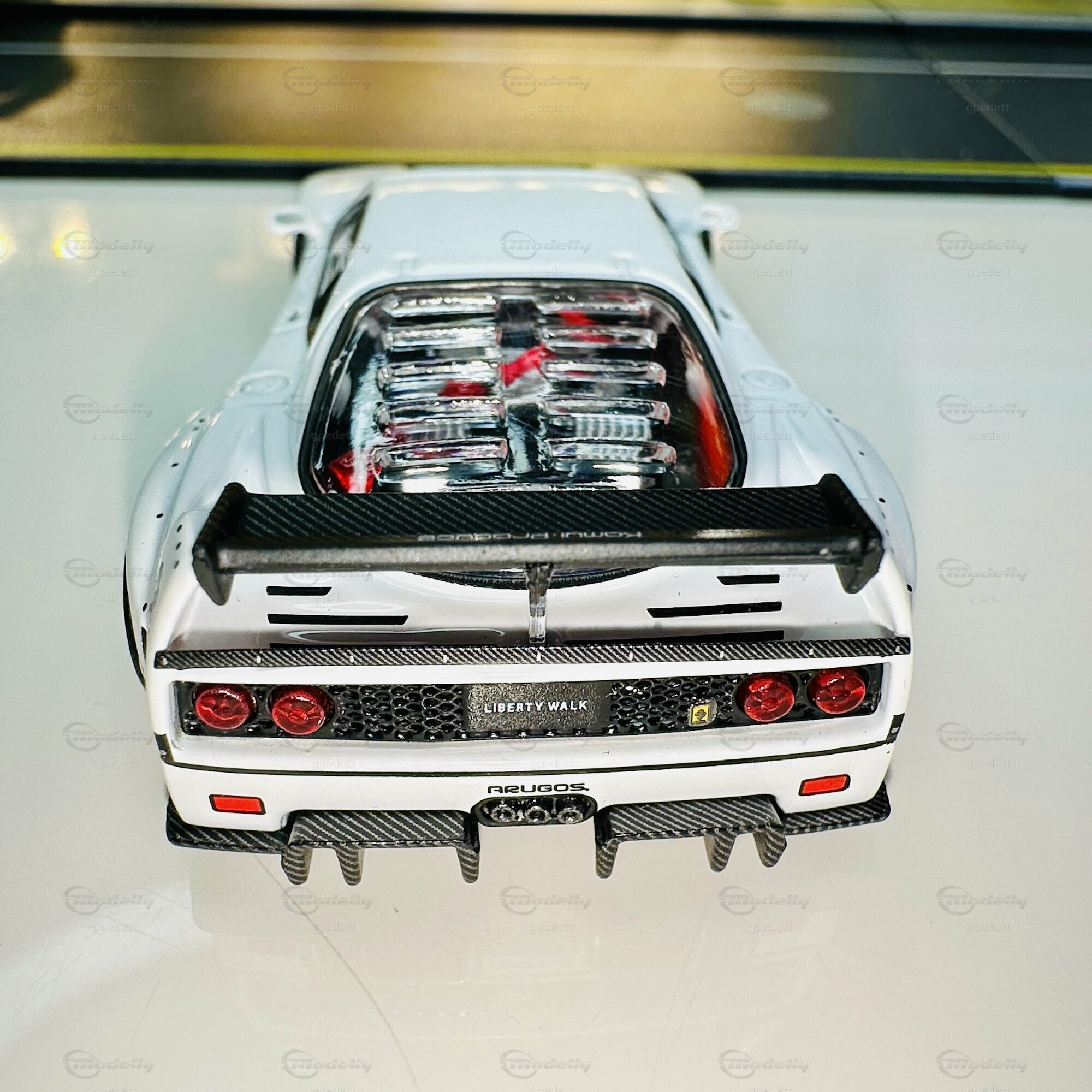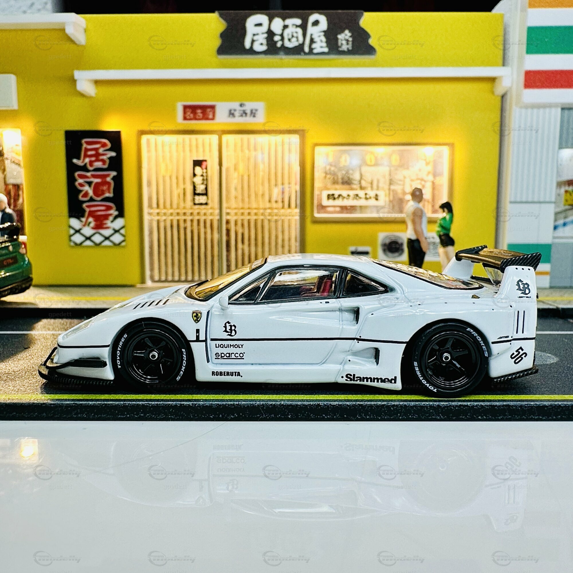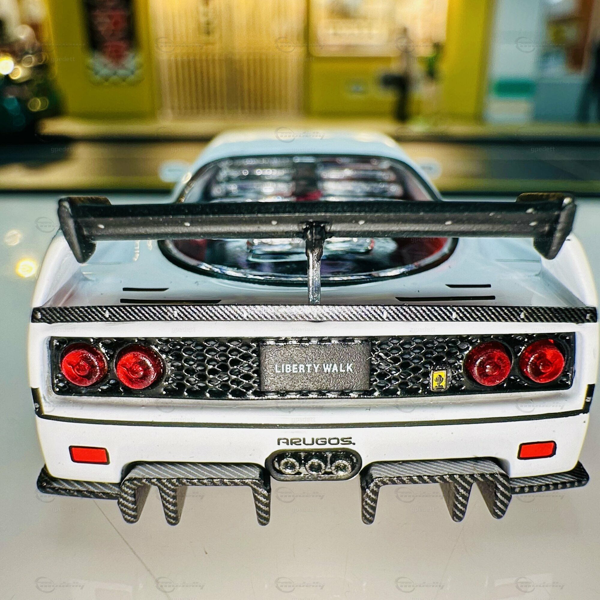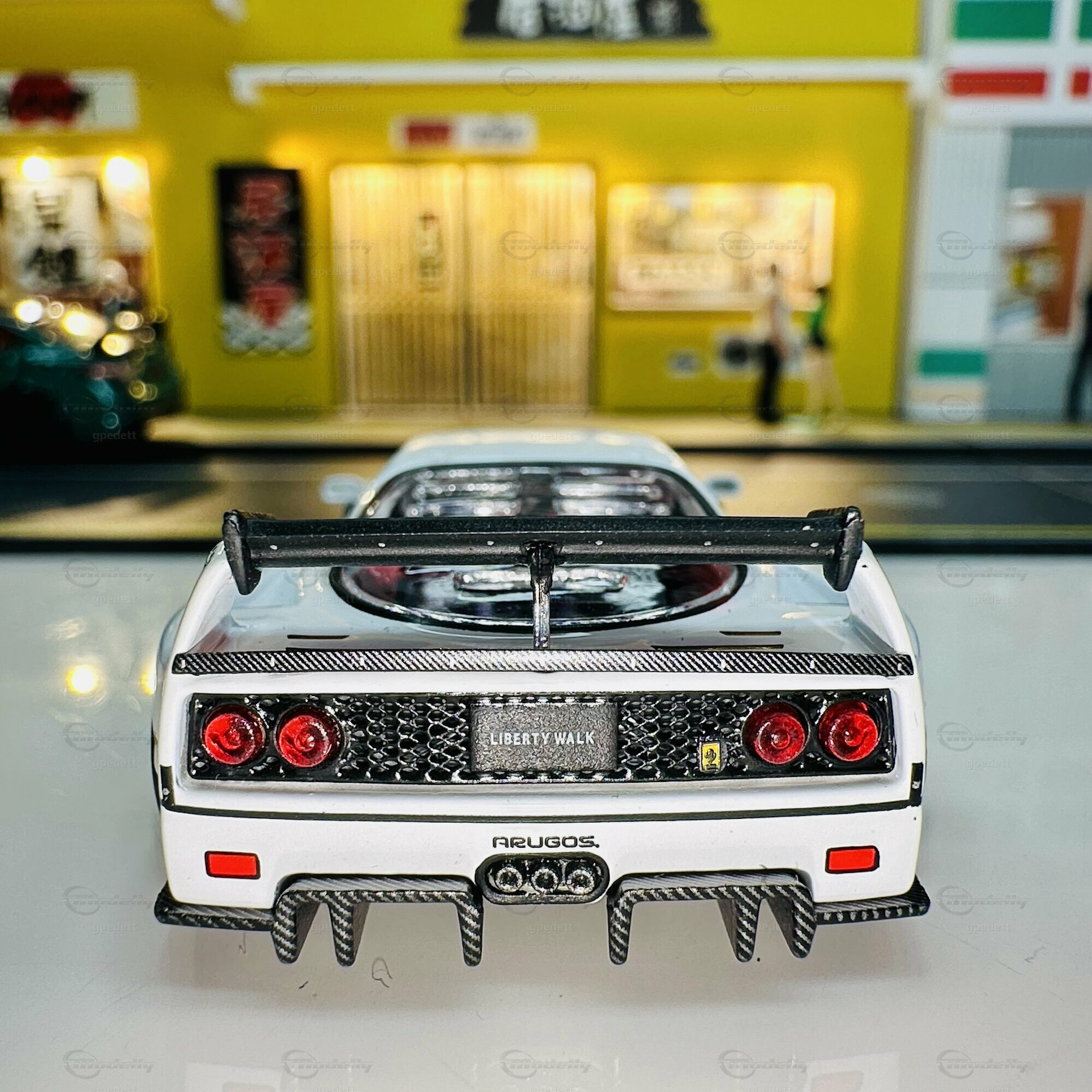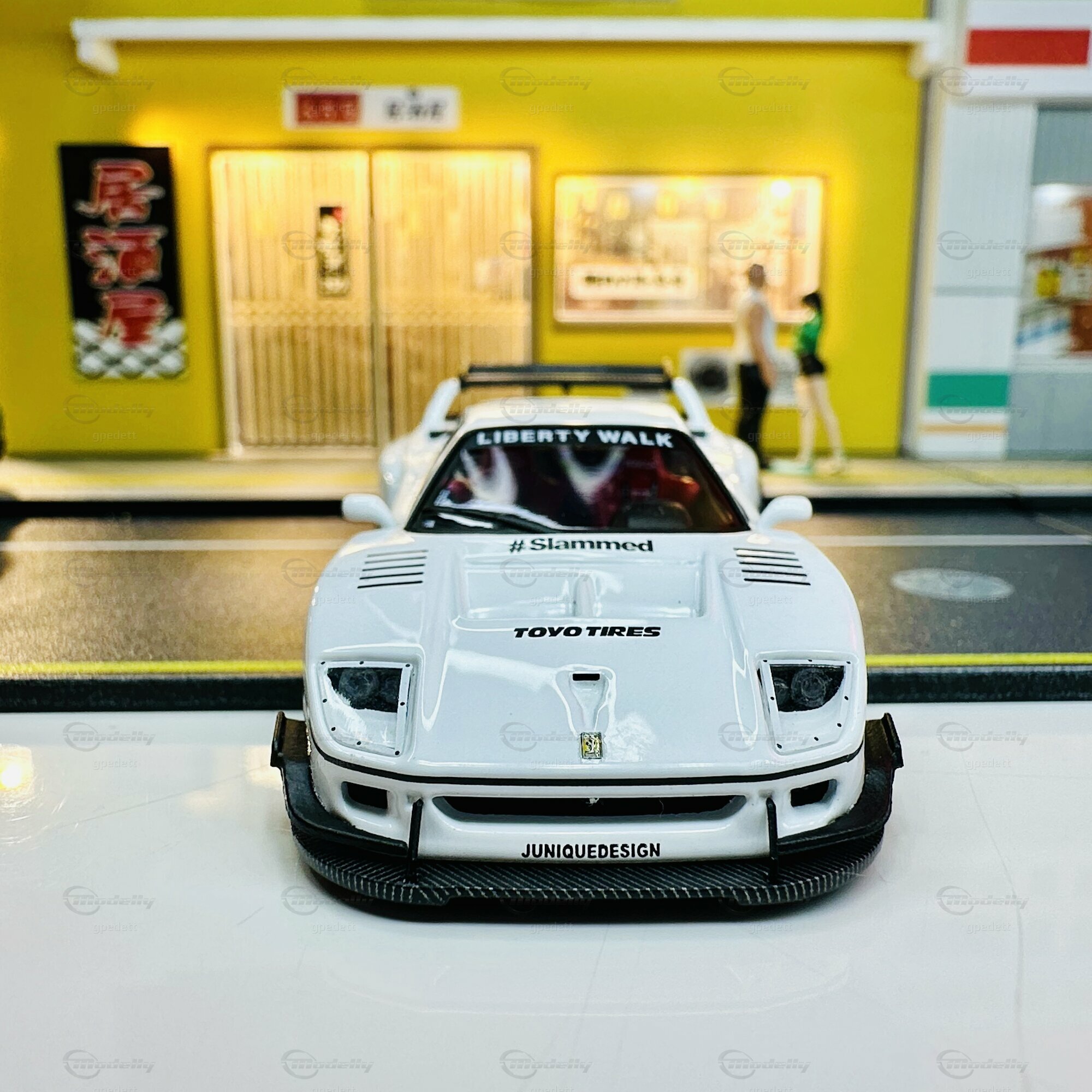 Das 1:64-Modell von Innomodels 64 ist eine detailtreue Nachbildung des Ferrari F40, die sich durch beeindruckende Präzision und Qualität auszeichnet. Dieses Modell, das Teil der Sammlung des Modelly-Mitglieds "gpedett" ist, reflektiert das ikonische Design und die fortschrittlichen technischen Details des Originals. Gefertigt aus hochwertigem Diecast-Material, ist das Modell auf die Bedürfnisse von Sammlern weltweit zugeschnitten. Besonders auffällig sind die zahlreichen Sponsorenlogos, die das Fahrzeug zieren, darunter Liberty Walk, Toyo Tires und Sparco. Die Bemalung in einem eleganten Weiß mit schwarzen Akzenten hebt die scharfen Linien und Dihedral-Türen hervor.