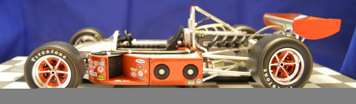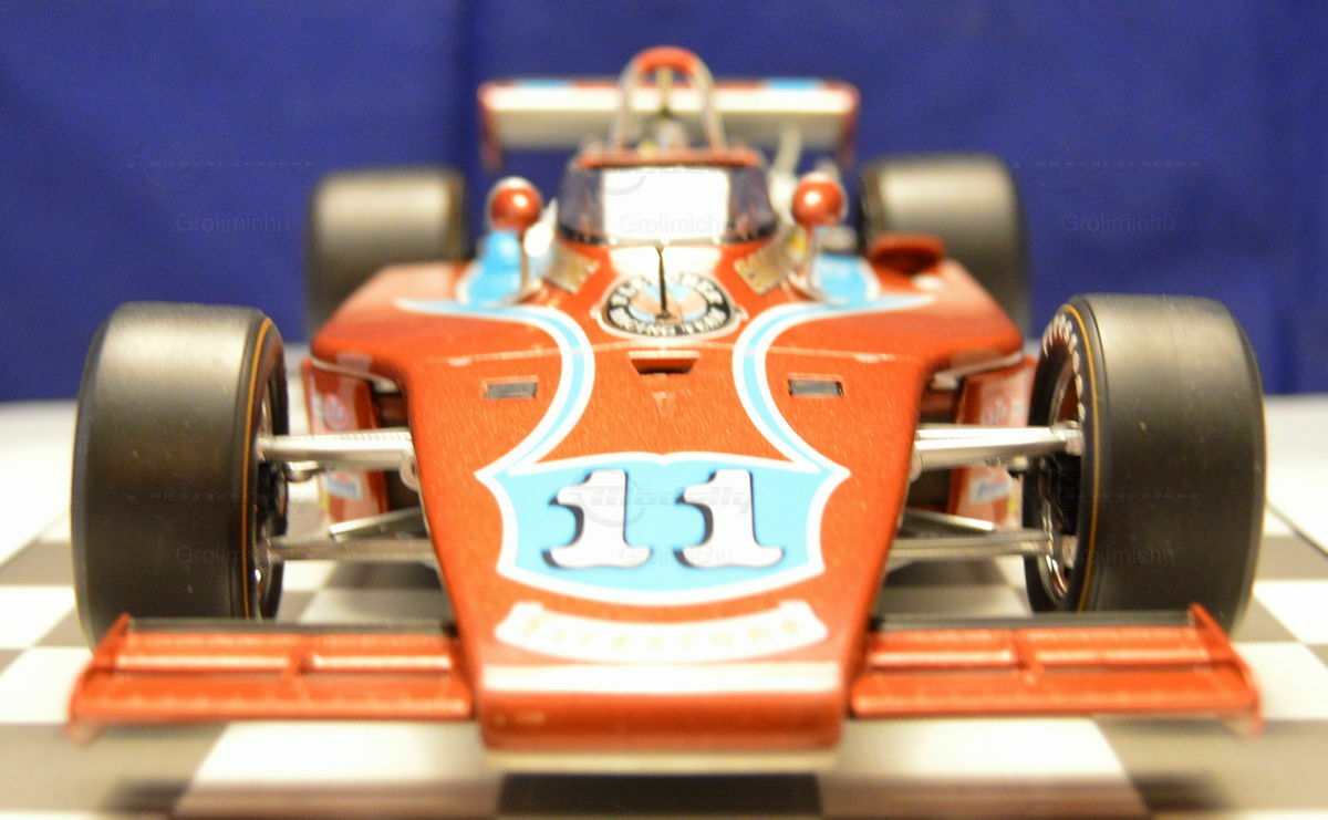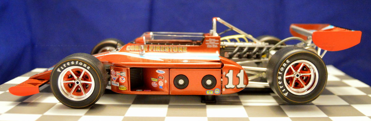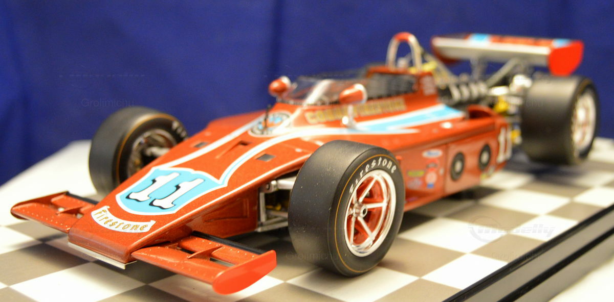 Die detailgetreue Miniatur von Carousel1 im Sammlungsmaßstab 1:18 beeindruckt durch eine akkurate Wiedergabe der auffälligen Lackierung des Originals. Das Modell zeigt die rote Metallikfarbe mit markanten blauen Akzenten, die typisch für den AAR Eagle war. Zudem sind zahlreiche Sponsorenaufkleber wie von Goodyear und Firestone auf der Karosserie gut erkennbar und tragen zur authentischen Darstellung bei. Die Startnummer 11 ist prominent auf den Seiten und dem Heckflügel platziert. Das Cockpit ist liebevoll detailliert und gibt einen eindrucksvollen Einblick in die Innenausstattung des Originals. Diese Miniatur hebt sich besonders durch die originalgetreuen Decals und die hochwertige Verarbeitung der Einzelteile ab.