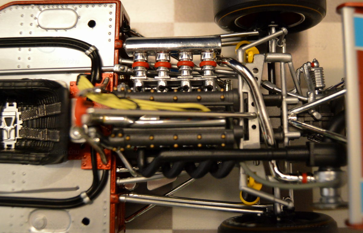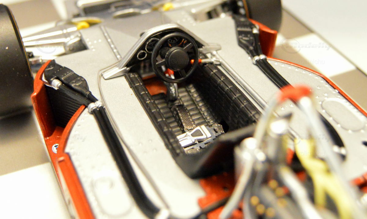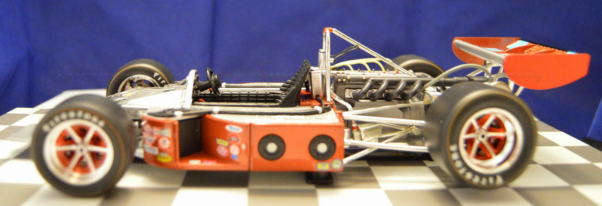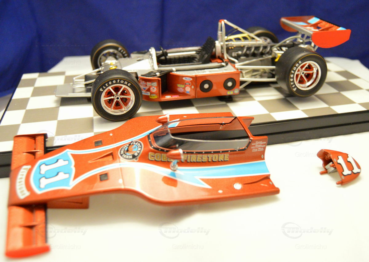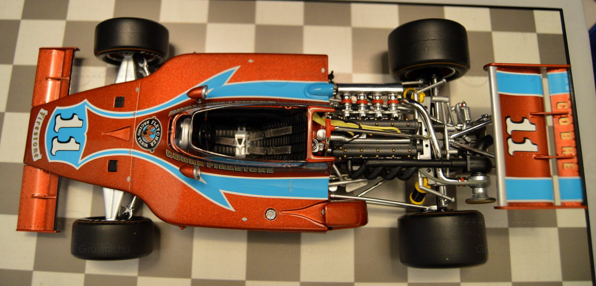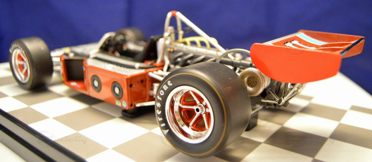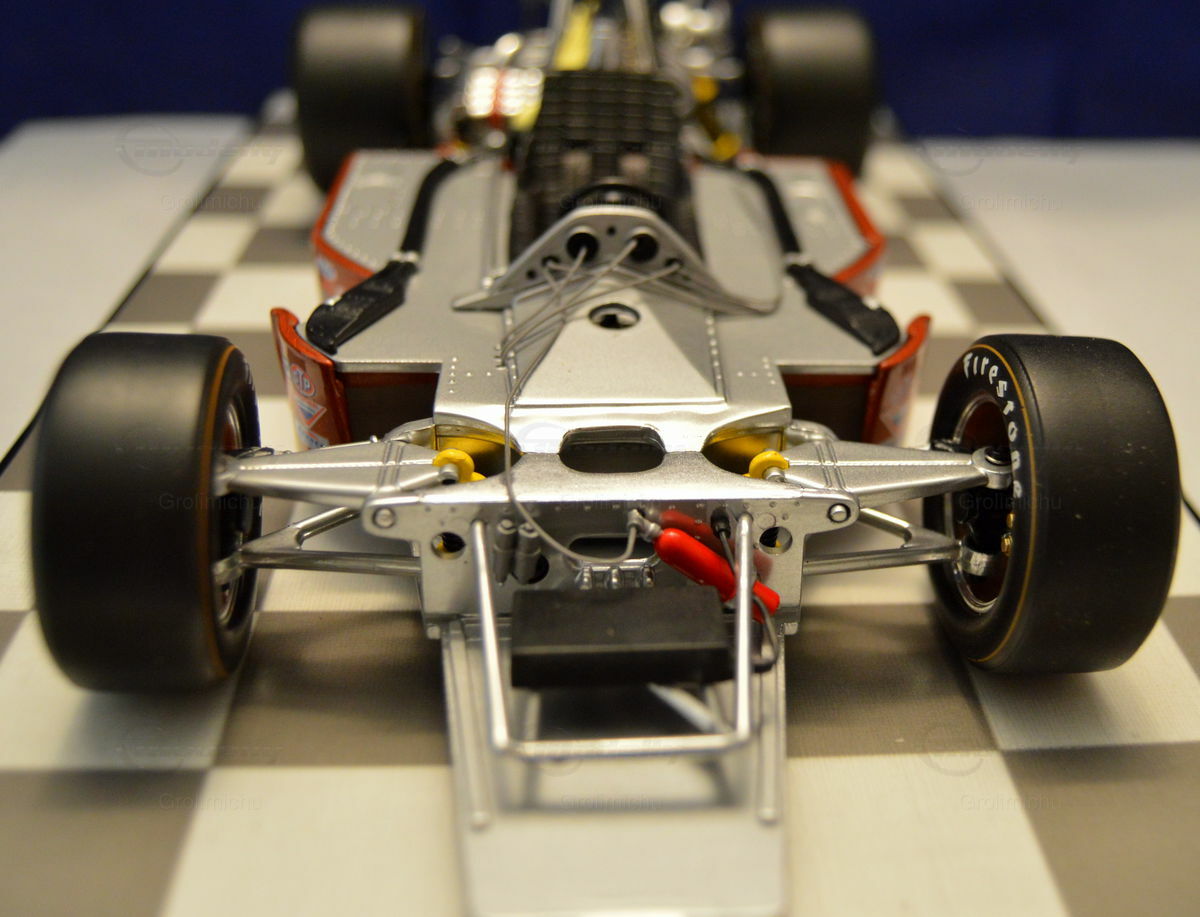 Die Produktion dieser Miniatur aus Diecast-Material sorgt für eine bemerkenswerte Stabilität und Detailtreue. Jede Komponente, von der motorischen Nachbildung bis hin zu den Aufhängungsteilen, ist sorgfältig gearbeitet und montiert. Auch die Nachbildung der Überrollbügel und die Darstellung des komplexen Motoraufbaus spiegeln die technischen Feinheiten des Originals wider. Die detailgetreuen Reifen und Felgen, versehen mit Firestone-Schriftzügen, runden das Gesamtbild ab. Dieses Modellauto in 1:18 ist ein Muss für jeden Sammler, bietet es doch einen realistischen und eindrucksvollen Blick auf eine der Ikonen des Motorsports. Ein besonderes Highlight in der Sammlung des Modelly-Mitglieds "Grolimichu".